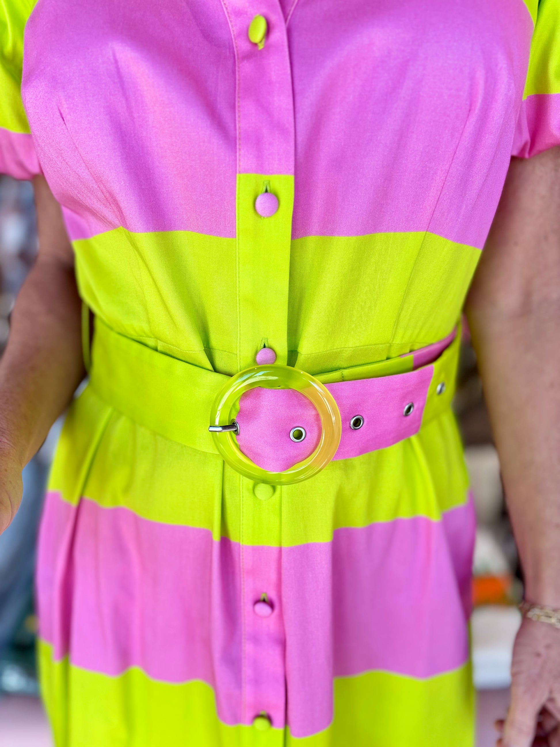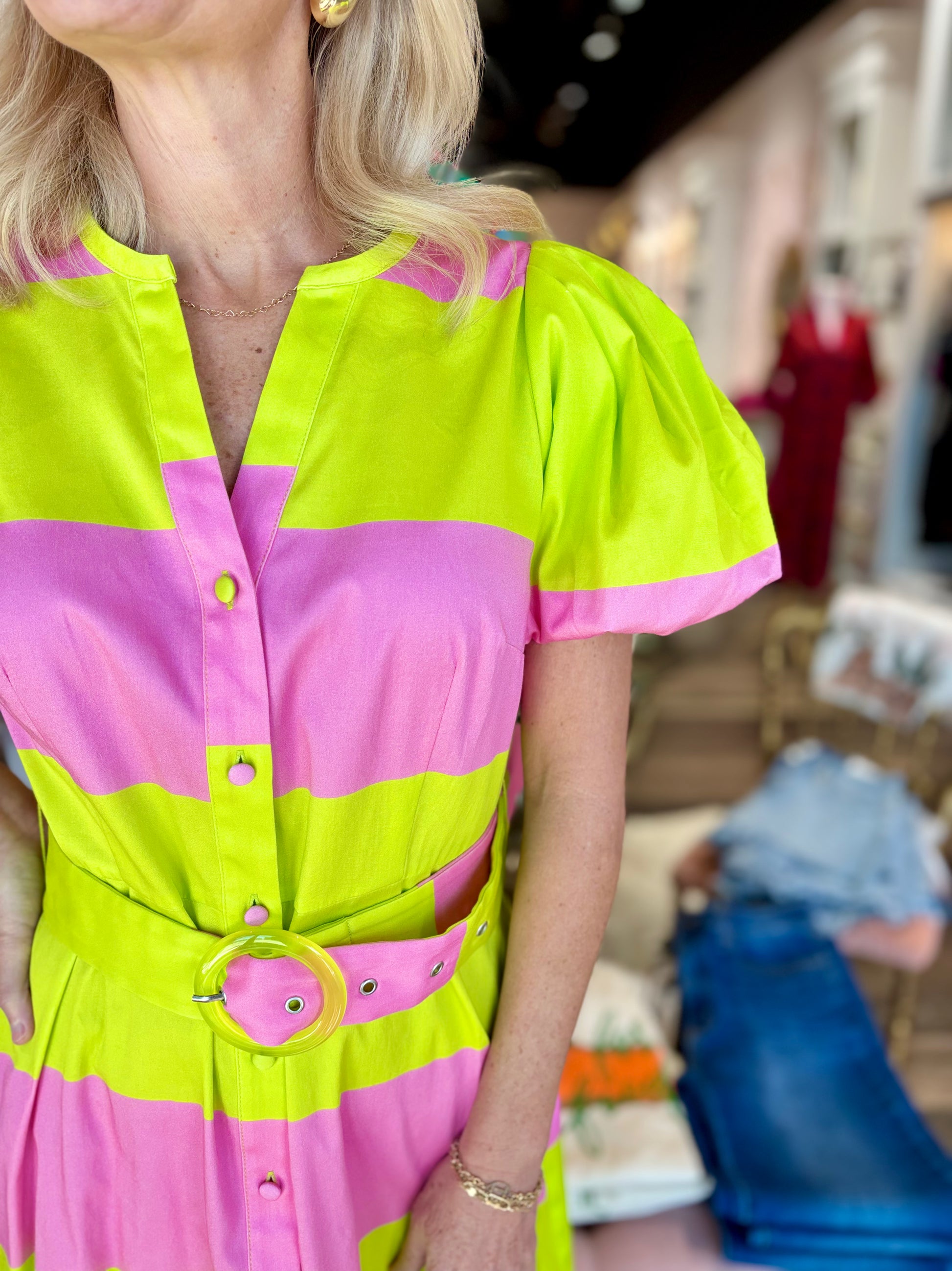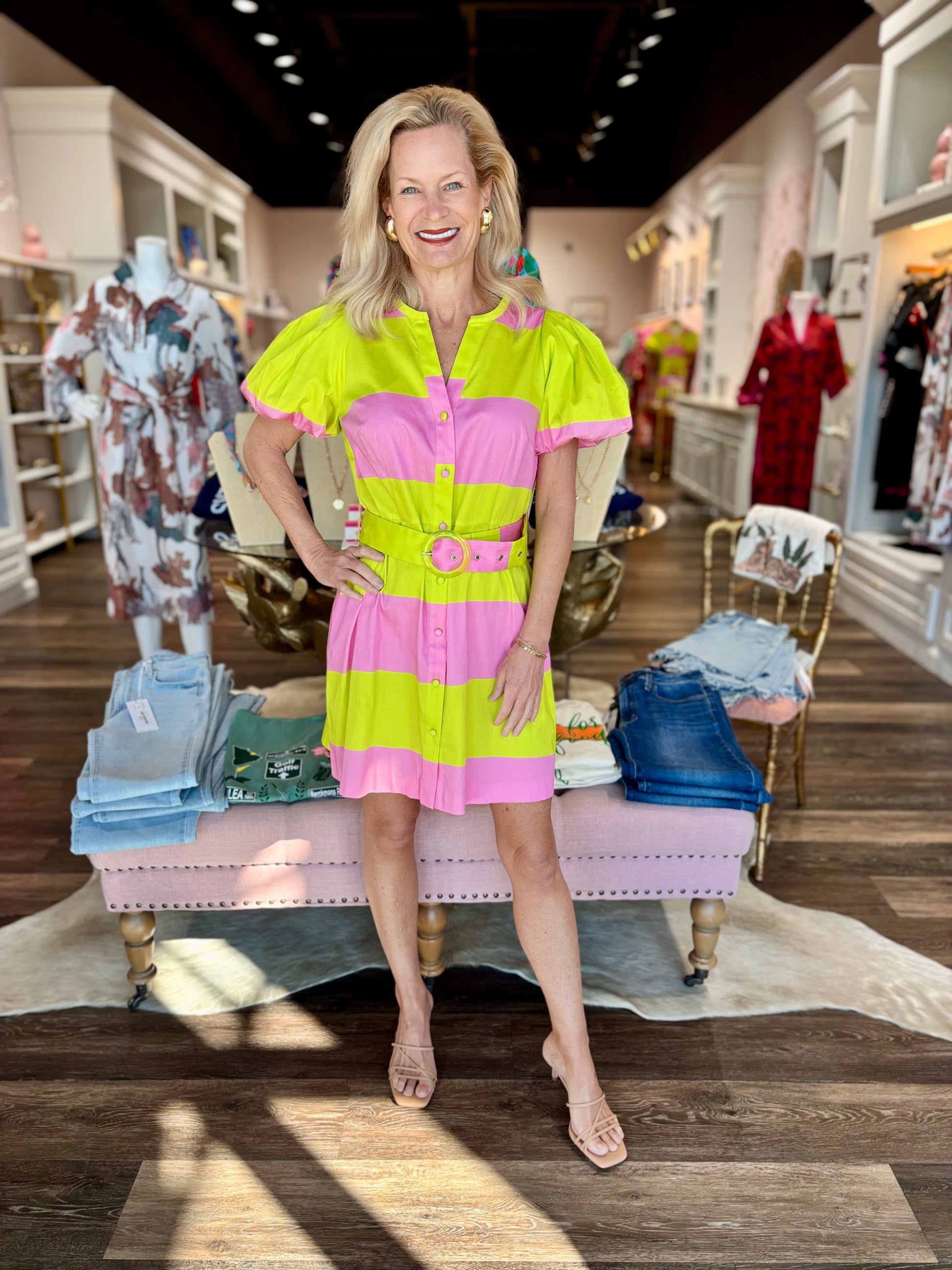 Our Blakely Dress is exactly what your wardrobe is missing! Featuring our new bold cabana stripe print, The Blakely offers a cinched waist with a matching belt, button front and puff sleeves.