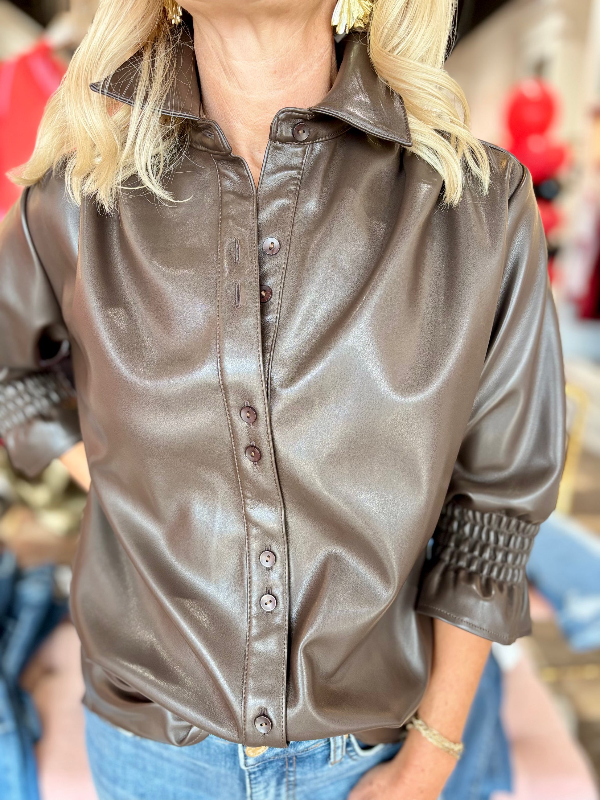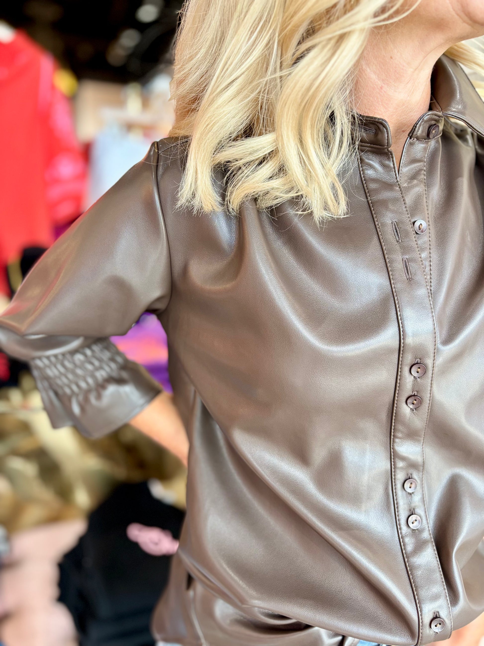 Modern and feminine, this short ruffle sleeve faux leather button-up blouse brings edge with a touch of softness. Crafted from a sleek faux leather blend, it features delicate ruffle sleeves, a structured silhouette, and a polished button-front design. Perfect for pairing with denim or tailoring for an elevated day-to-night look.
