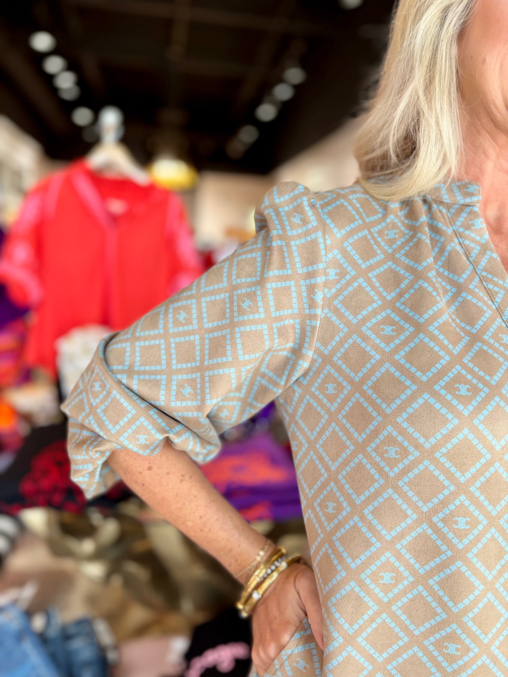 Step into style with our camel/ blue diamond print suede dress! Made from beautiful soft faux suede, this dress features a v-neckline and 3/4 sleeves. This dress is perfect with pumps or boots for a versatile and stylish look.