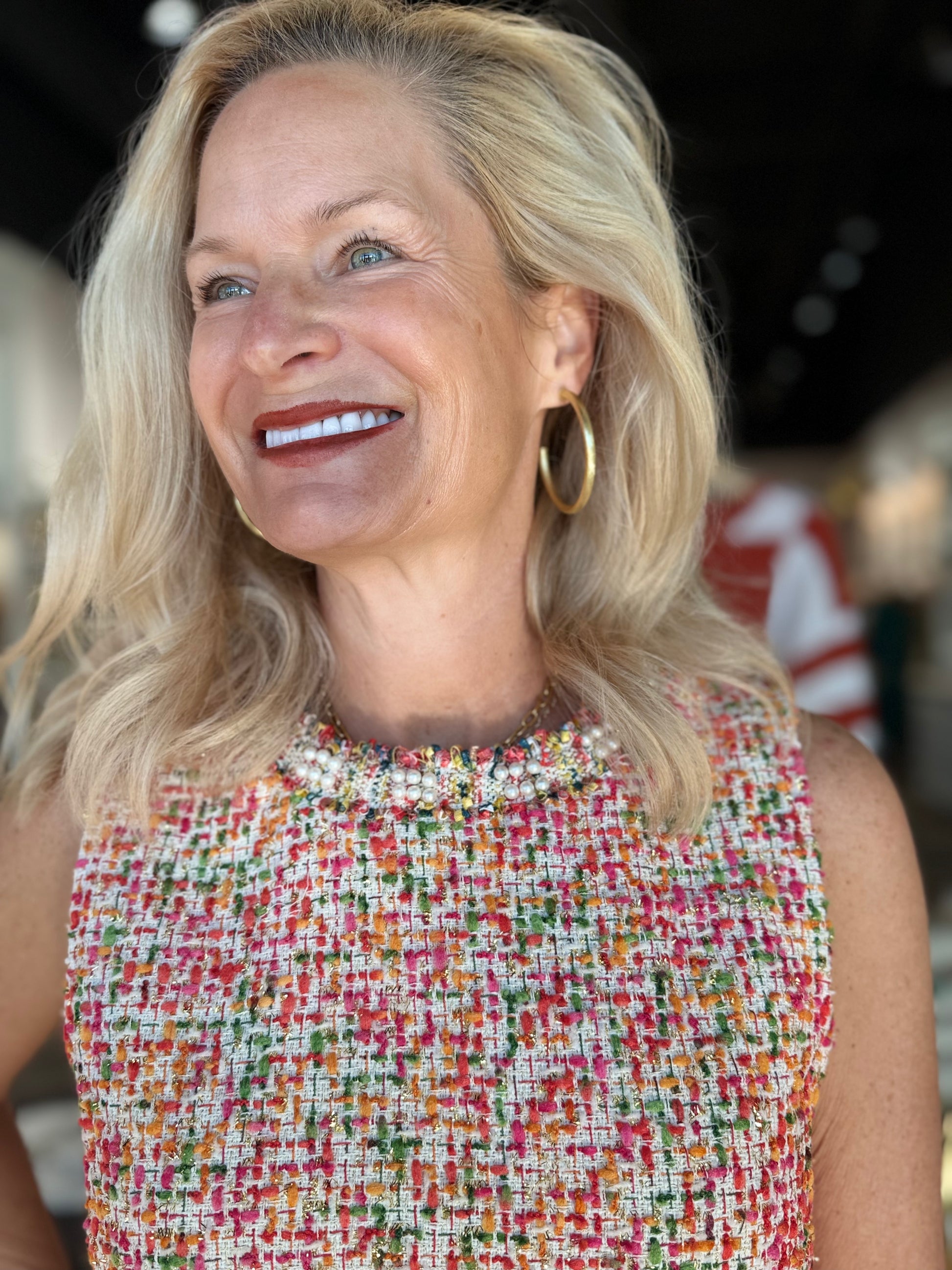 Chic and timeless, this sleeveless tweed shift dress features elegant pearl embellishments for a touch of sophistication. Perfect for any occasion, its classic silhouette offers a polished look with effortless style.
