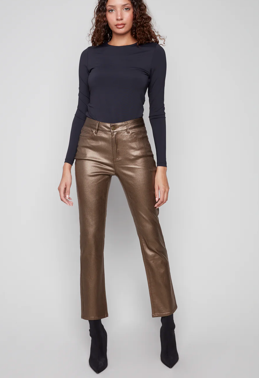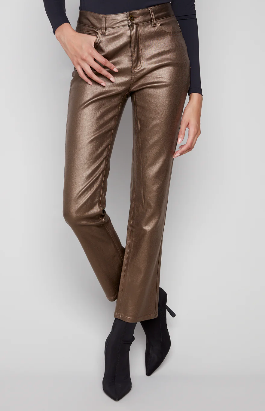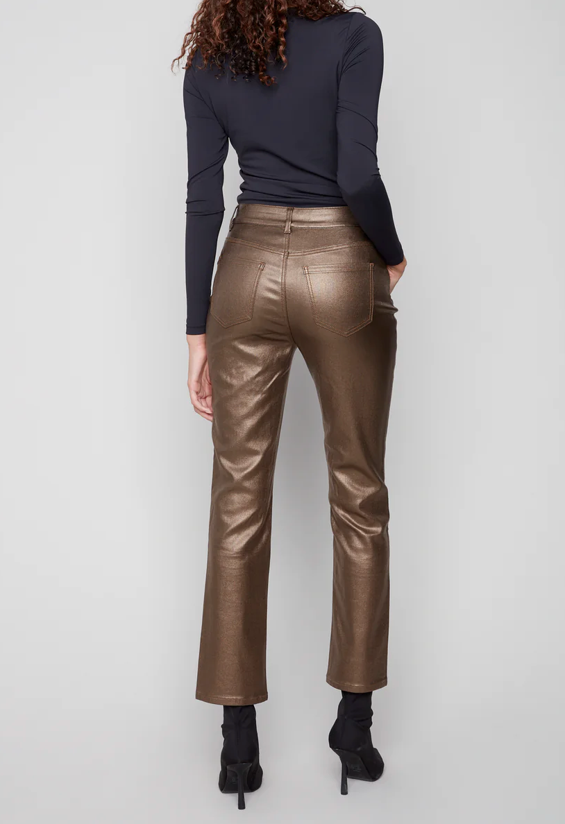 Charlie B Slim Leg Metallic Wax Twill Pants- Copper
