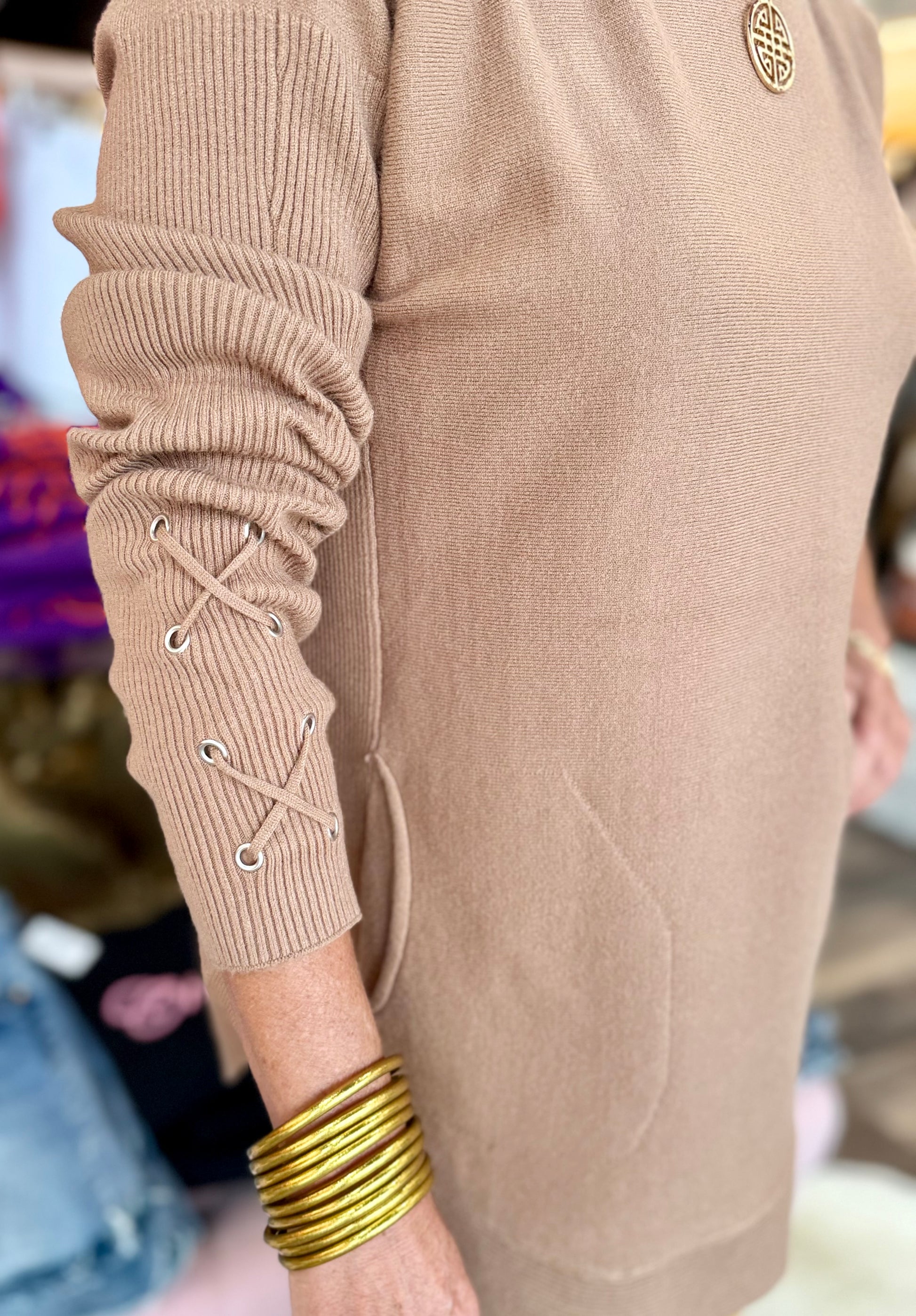 Charlie B Knit Sweater with Lace-Up Cuffs Truffle