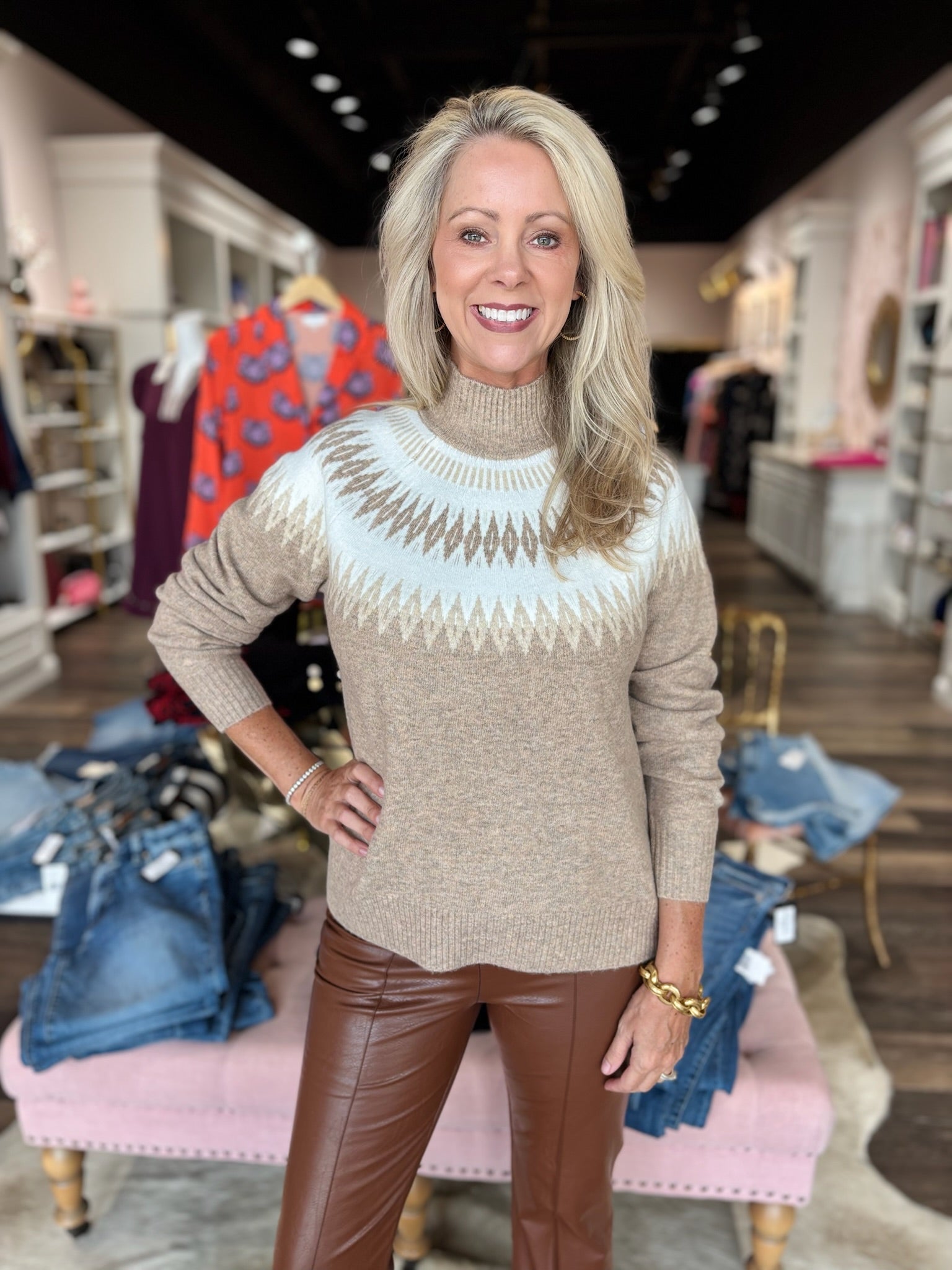 A cozy-chic essential with a touch of texture. This jacquard knit sweater features classic raglan sleeves for a relaxed fit and easy movement, while the intricate woven design adds visual depth and style. Soft, warm, and versatile, it’s the perfect layering piece for cool-weather days—equally at home with denim, trousers, or a skirt.