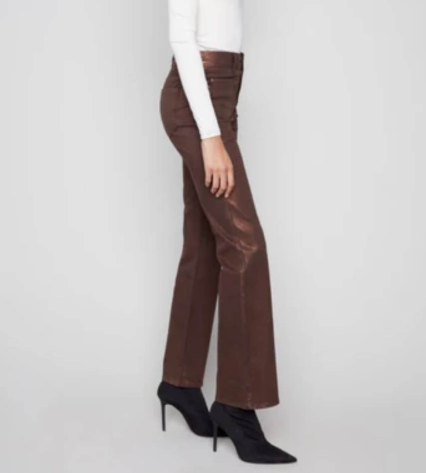 Shine on with Charlie B's Flare Leg Foil Twill Pant. These show-stopping pants are designed to make a statement, featuring a lustrous metallic finish in a rich copper hue that catches the light with every move. The high-waisted fit and modern wide-leg silhouette create a flattering, elongating effect that’s both stylish and comfortable. Crafted with a sleek finish, these pants offer a bold alternative to traditional denim, perfect for a night out, a special event, or simply adding some glamour to your everyday style.
