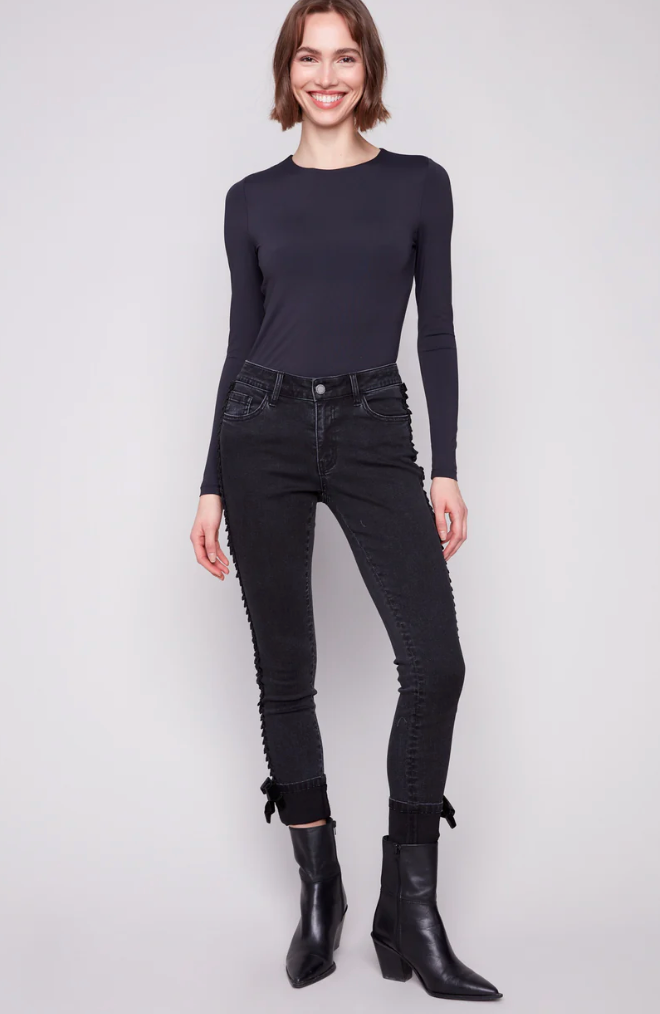 Elevate your wardrobe with our charcoal black Slim Leg Jeans, adorned with an elegant velvet bow detail along the side seams and finished with a folded hem for a polished, tailored touch. Crafted from comfortable stretch denim, they offer ease of movement without compromising style. Featuring a regular rise and a classic five-pocket design, these jeans effortlessly blend practicality with sophistication. A must-have for your fall lineup. The inseam is 29 inches