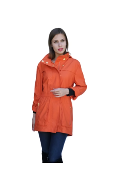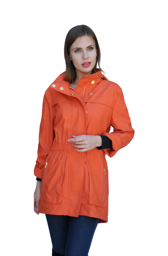 style ANNA - new fabric developed by Ciao Milano. Soft durable flowing fabric that is not only 100% water proof but extremely rich looking. Looks like a million dollars. Same style, hardware, specs and fit with zip in pouch hood as the famous TESS style. Water- proof 50% polyurethane Waterproof 50% polyester.