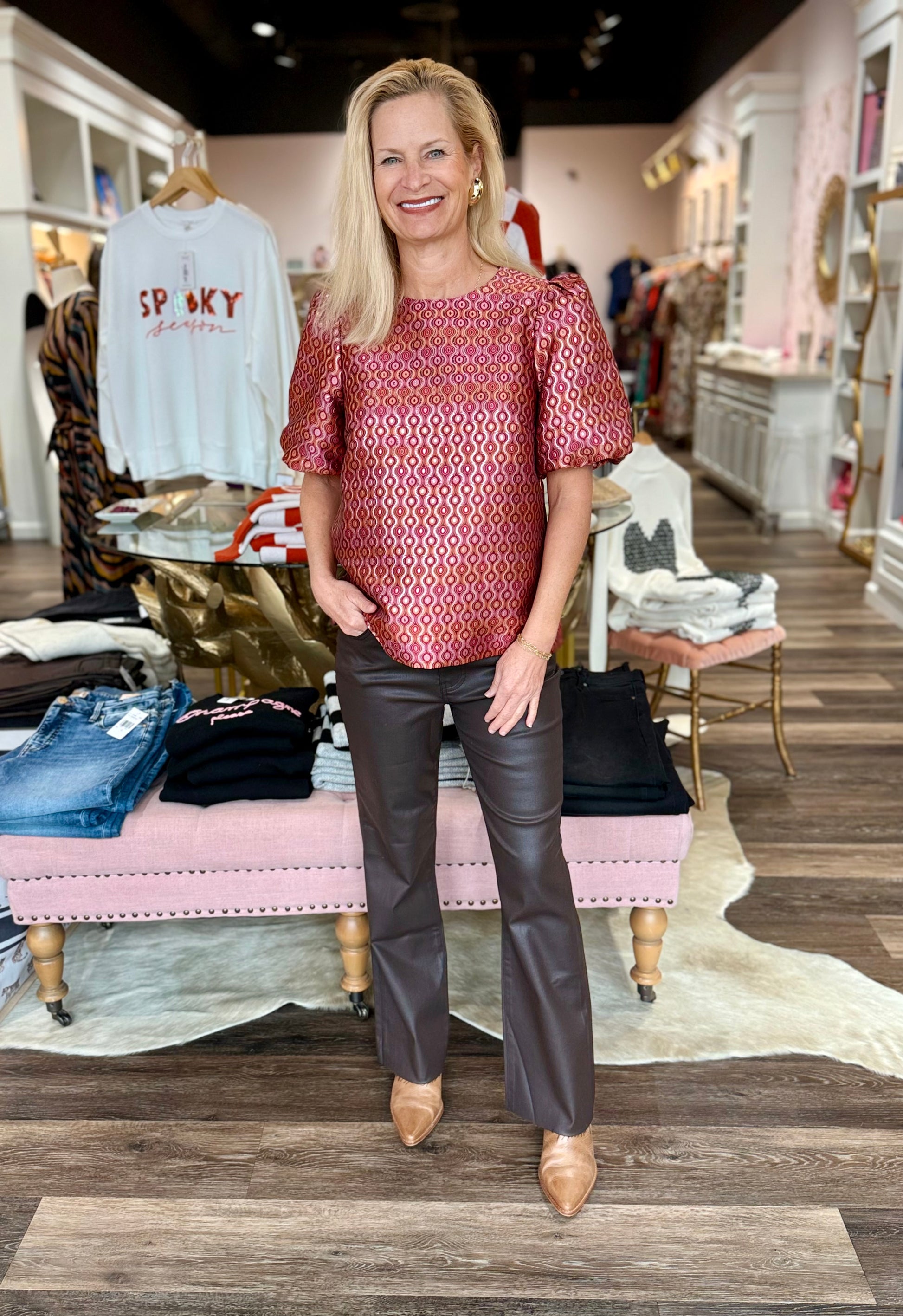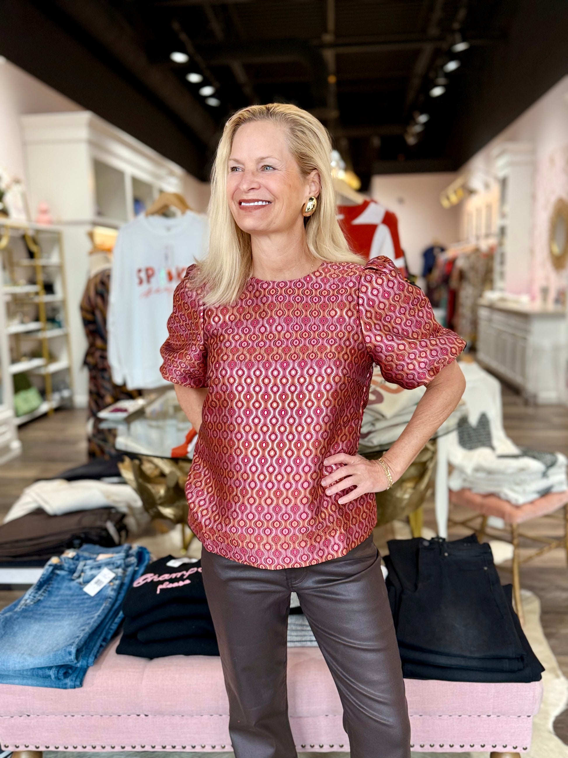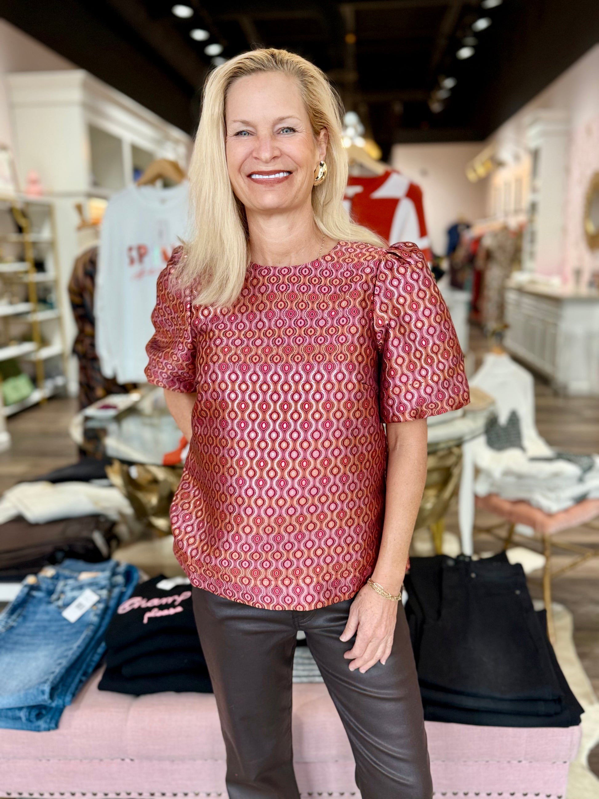 Meet your go-to piece for effortless style — this short sleeve top from JADE features a subtle yet eye-catching grid-jacquard texture (“Groovy Grid”) and a clean round neckline. Made from soft poly-jacquard fabric that holds shape while offering comfort, it’s perfect for layering under a blazer or pairing with jeans for a weekend-ready outfit.