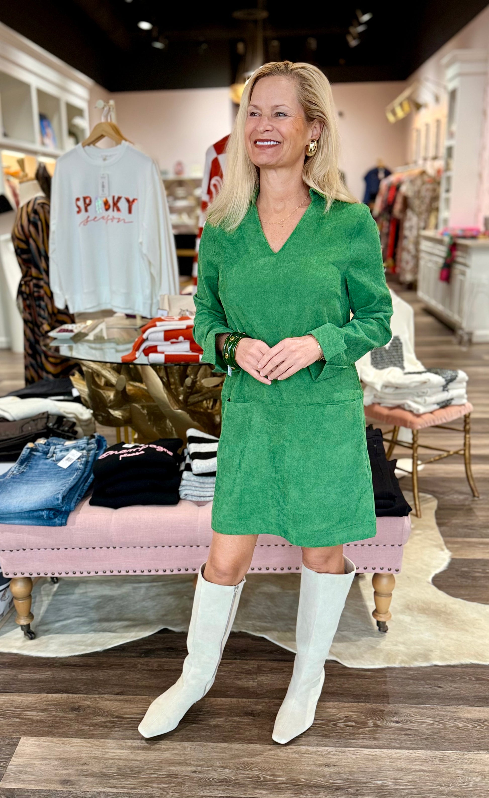 Elevate your fall wardrobe with the Joy*Joy Corduroy Green Split Neck Collar Dress. Its green and soft corduroy fabric bring cozy charm and effortless style to any occasion. The split neck collar adds a classic, polished touch, making this dress perfect for layering on crisp autumn days. Embrace comfort and vibrant color all season long.