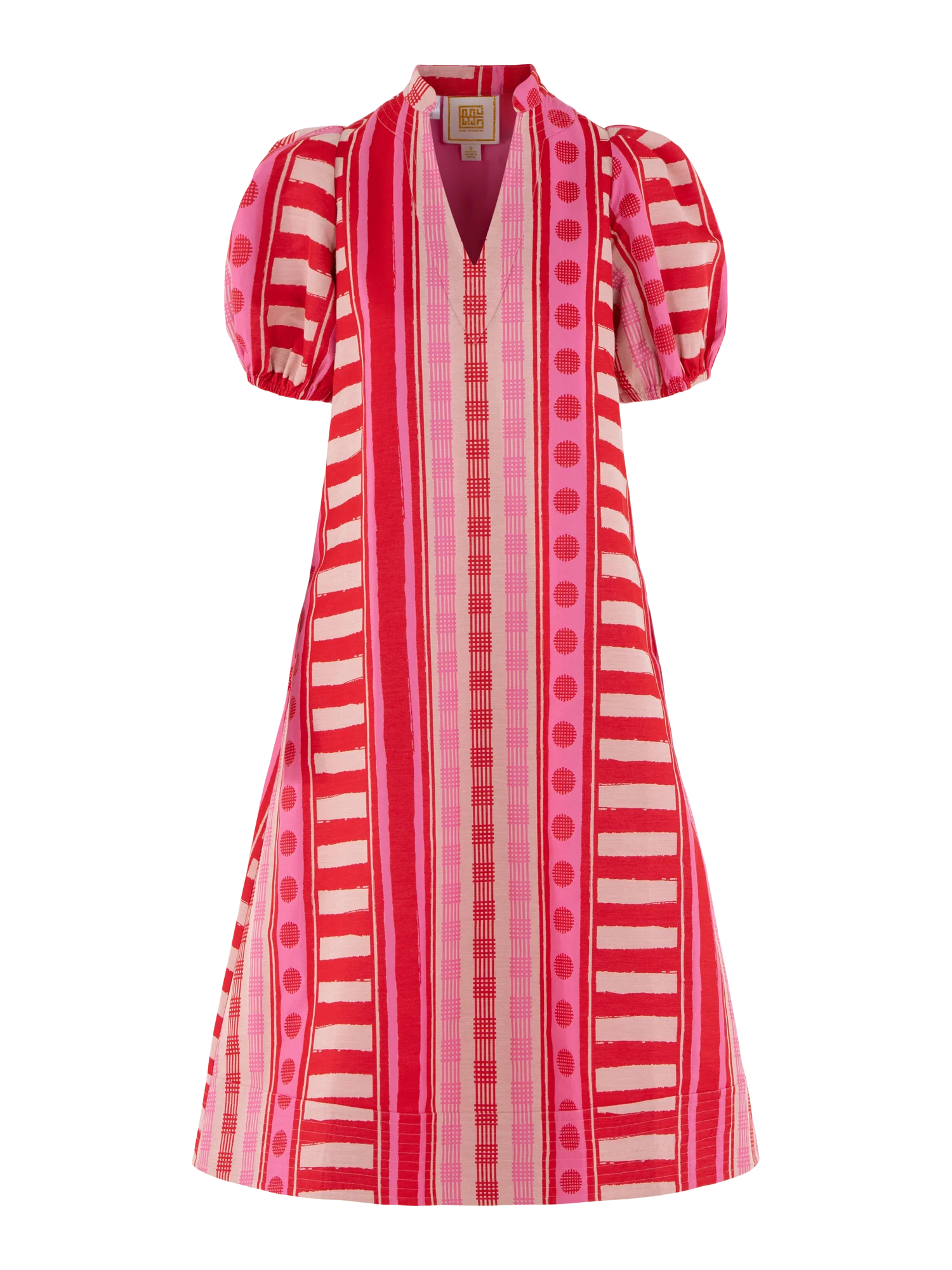 The Hampton Dress in Peach Jubilee is a playful yet polished statement with a distinctly feminine spirit. Designed with an easy, relaxed shape, this style features a mandarin-style collar, puff sleeves, and an asymmetrical layout that creates visual interest and movement. Peach Jubilee showcases a vibrant mix of patterns, rendered in a luxe jacquard that offers soft structure and a subtle glow. Lighthearted and confident, this dress strikes the perfect balance between flirty charm and elevated design.