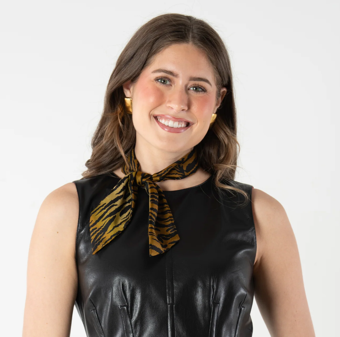 The Lady Tiger Scarfette is a petite yet powerful accessory designed for maximum styling versatility. Crafted from 100% silk, this slim scarf features hand-finished edges and our bold Lady Tiger print—bringing a pop of fierce fashion to any look. Perfect for tying at the neck, wrapping around your handbag handle, or wearing as a chic hair accessory.