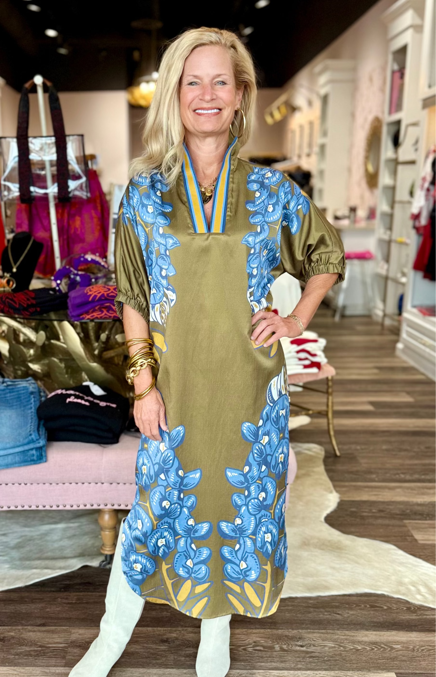 The Poppy Caftan in Bluebonnet is a relaxed yet elevated silhouette that captures the essence of western charm through the Texas state flower. Designed with loose elastic dolman sleeves and a classic stand collar, it drapes effortlessly in a loose-fitting shape that flatters while offering all-day comfort. The curved shirttail hem and side slits add fluidity and ease of movement, while the placed print creates a striking vertical effect that elongates the figure. A versatile piece, the Poppy Caftan transitions seamlessly from day to evening with its effortless sophistication.