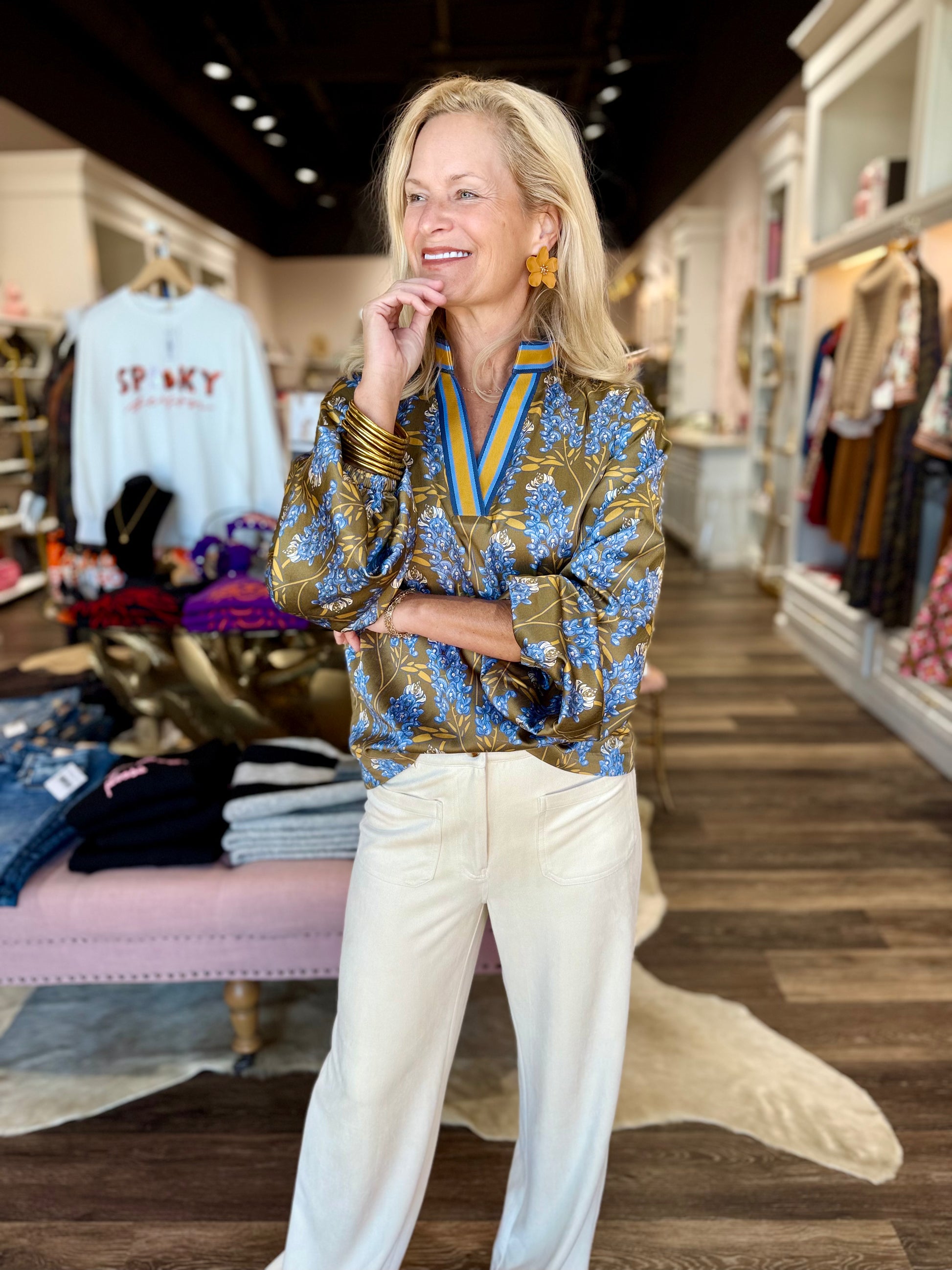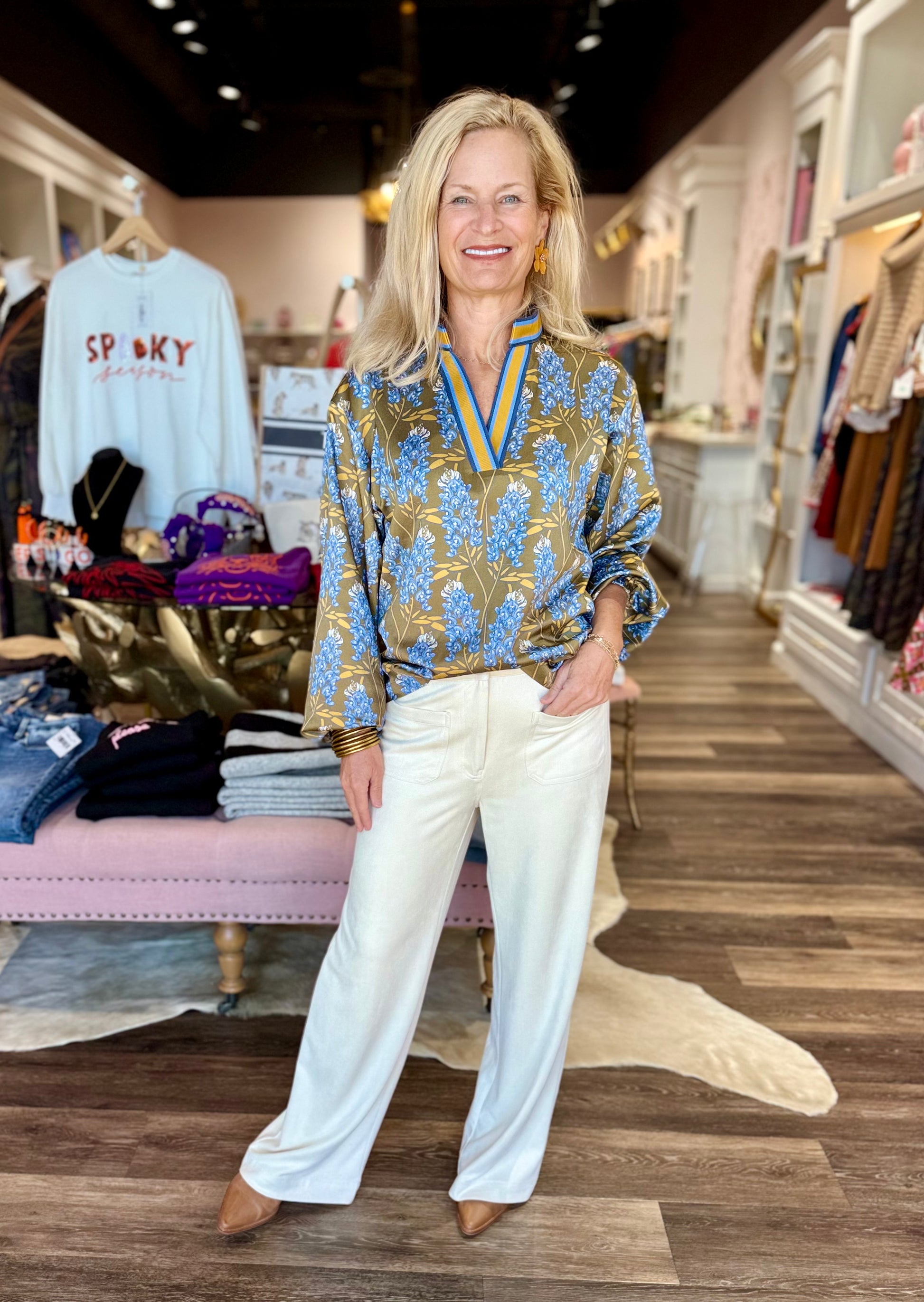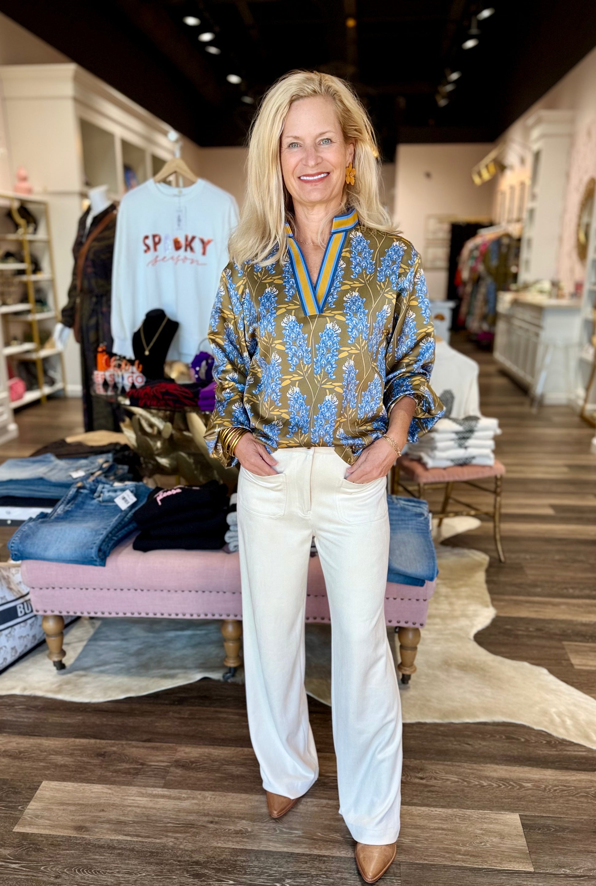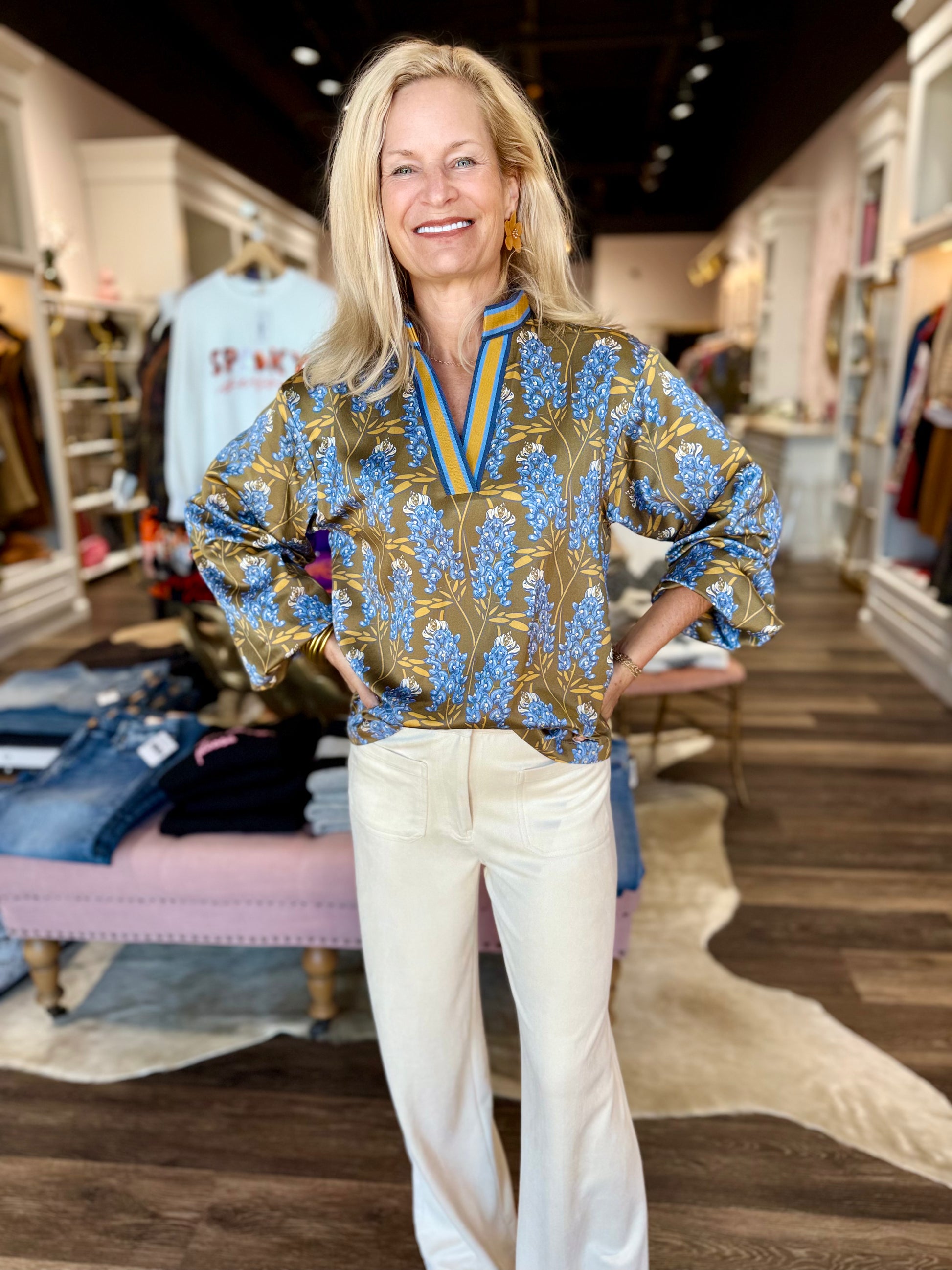 The Lolli Top blends feminine ease with a touch of western charm. Designed with blouson sleeves finished in elastic cuffs, a notched neckline, and a relaxed yet slightly tailored silhouette, it offers both comfort and polish. The Blue Bonnet print celebrates the Texas state flower, reimagined in soft botanicals that bring a western-inspired, chic twist to this timeless style. Effortlessly versatile, it’s a piece that transitions seamlessly from casual outings to elevated occasions.