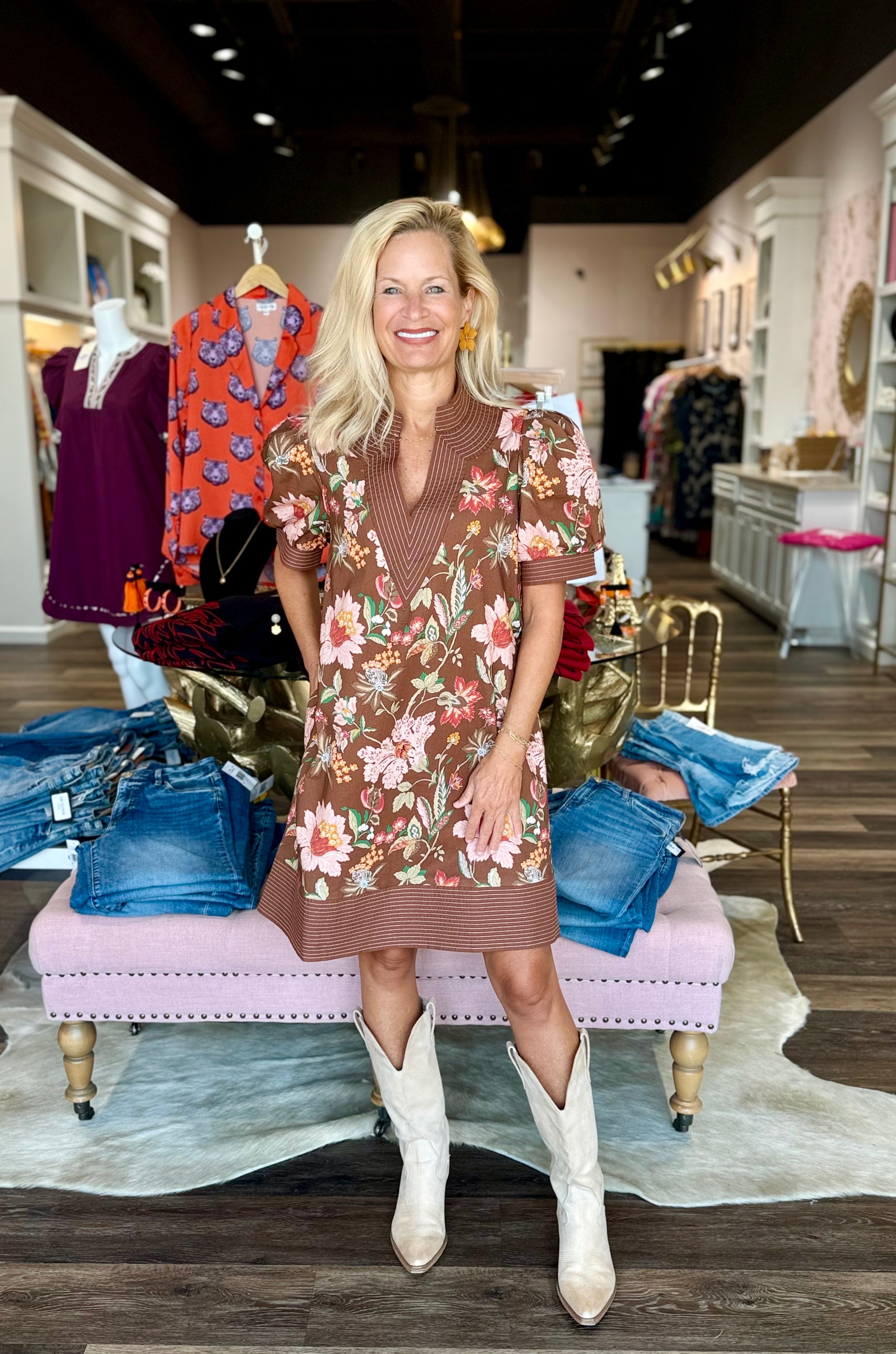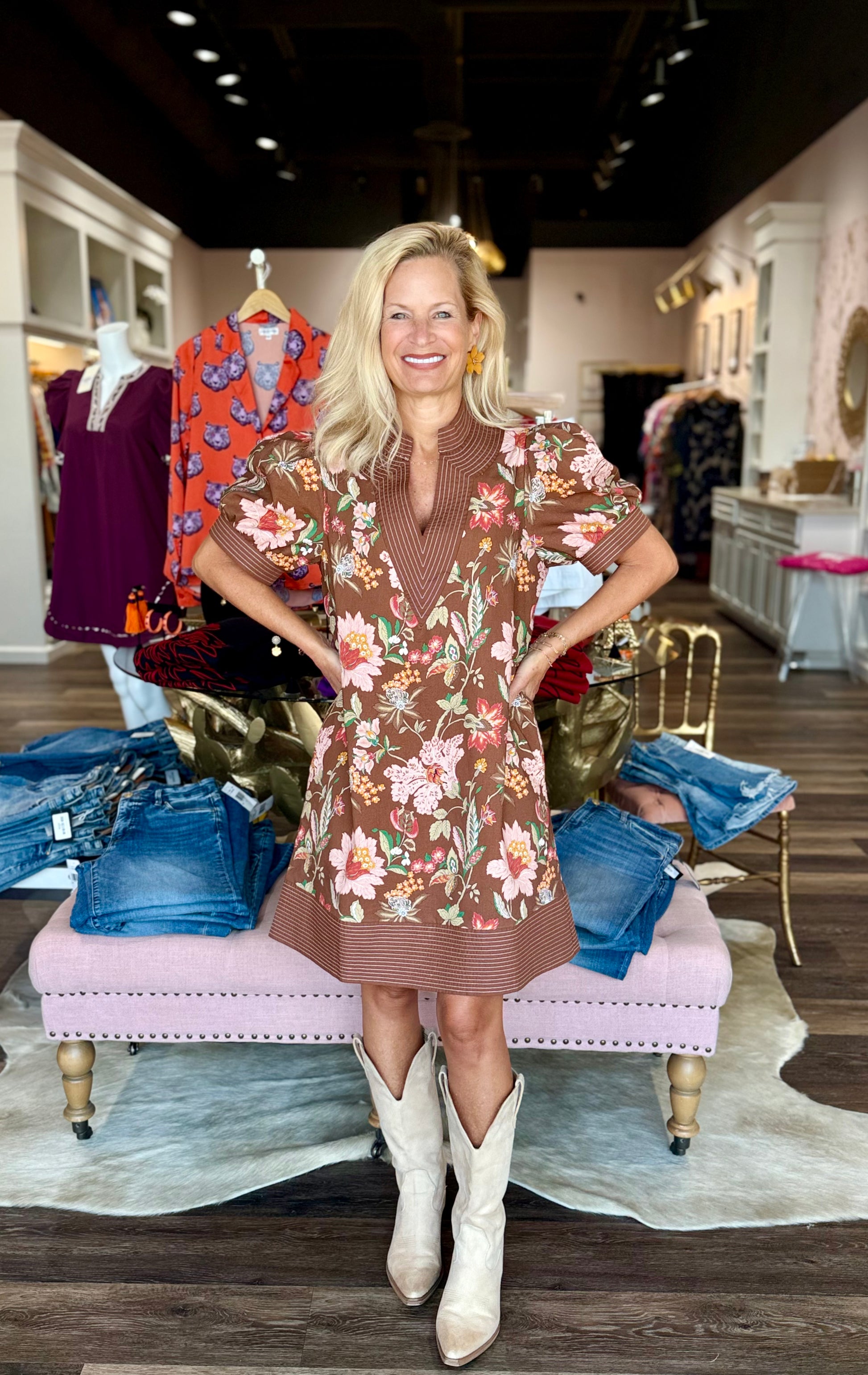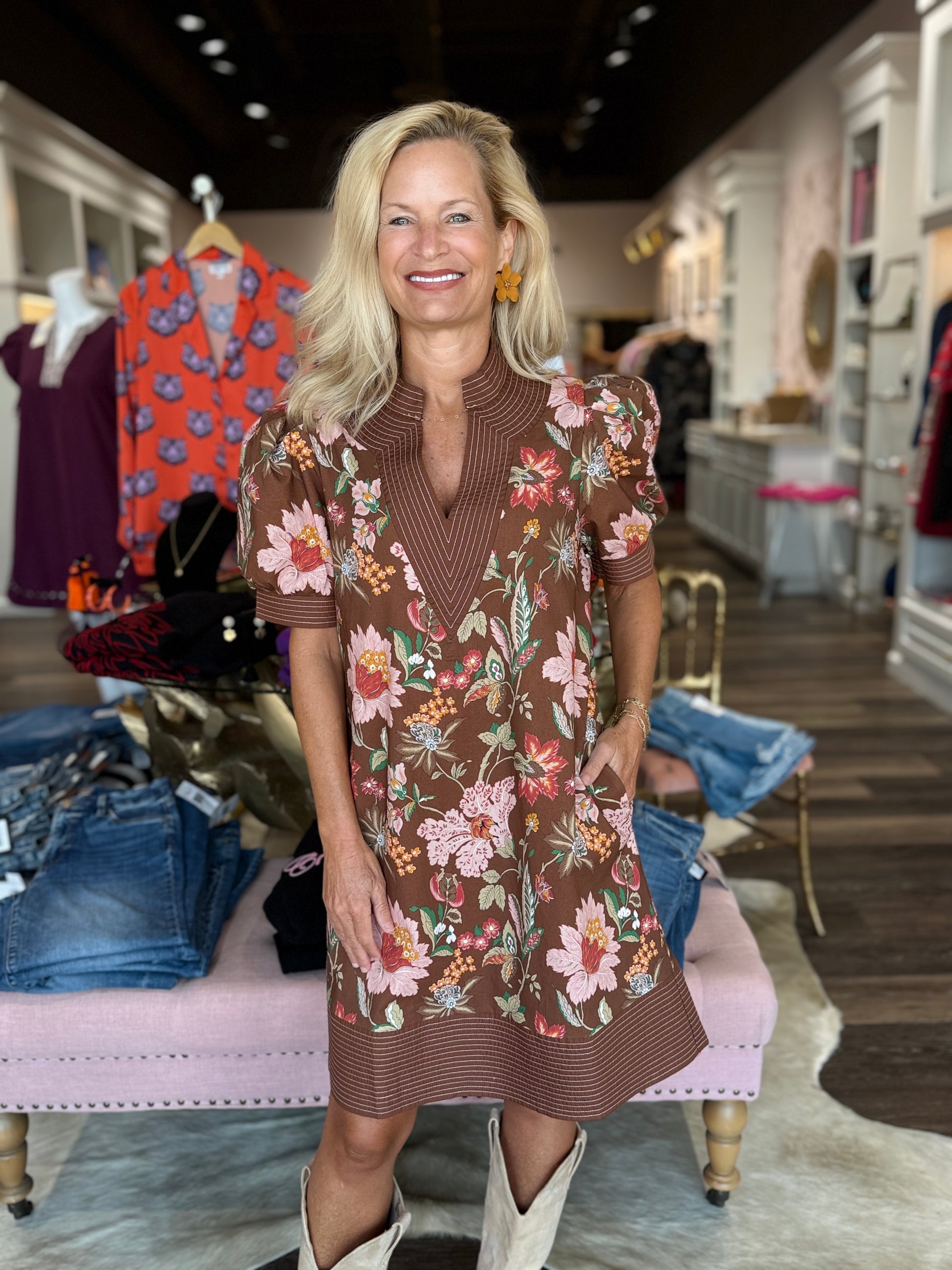 Fresh and feminine, this pullover mini dress blooms with a charming floral print and playful short puff sleeves. A contrast stitch-accent band defines the silhouette, while side pockets add effortless function. Fully lined for comfort, this lightweight woven dress is non-sheer—perfect for day-to-night wear with sandals, sneakers, or heels.