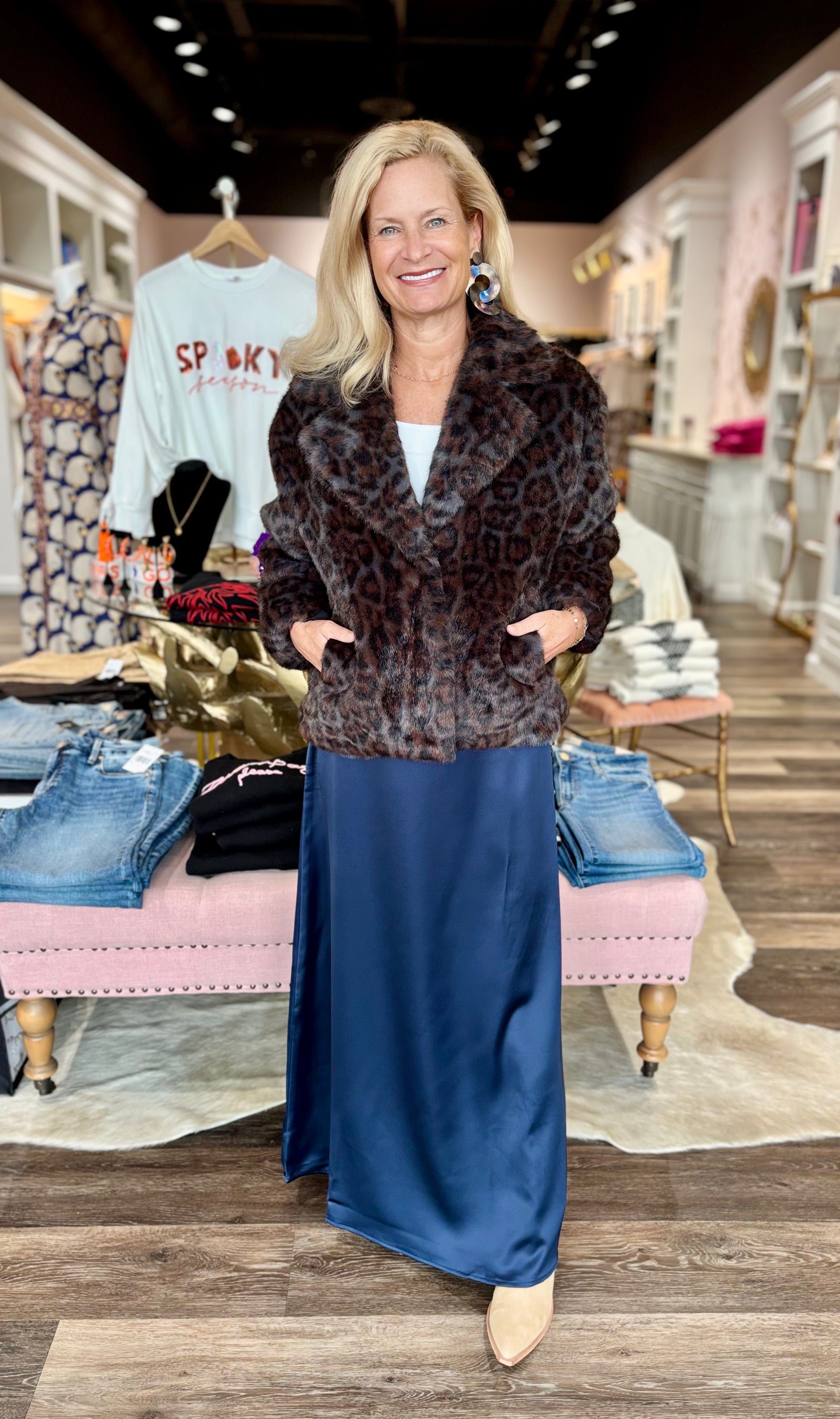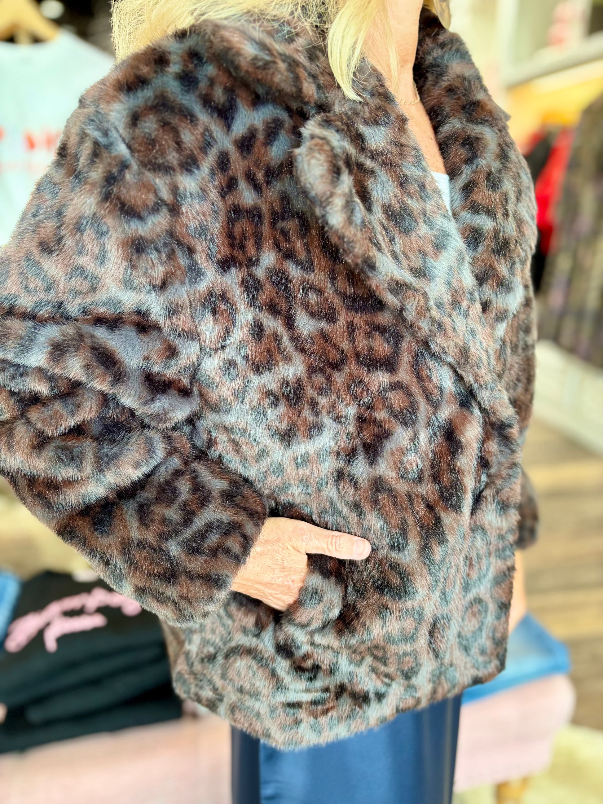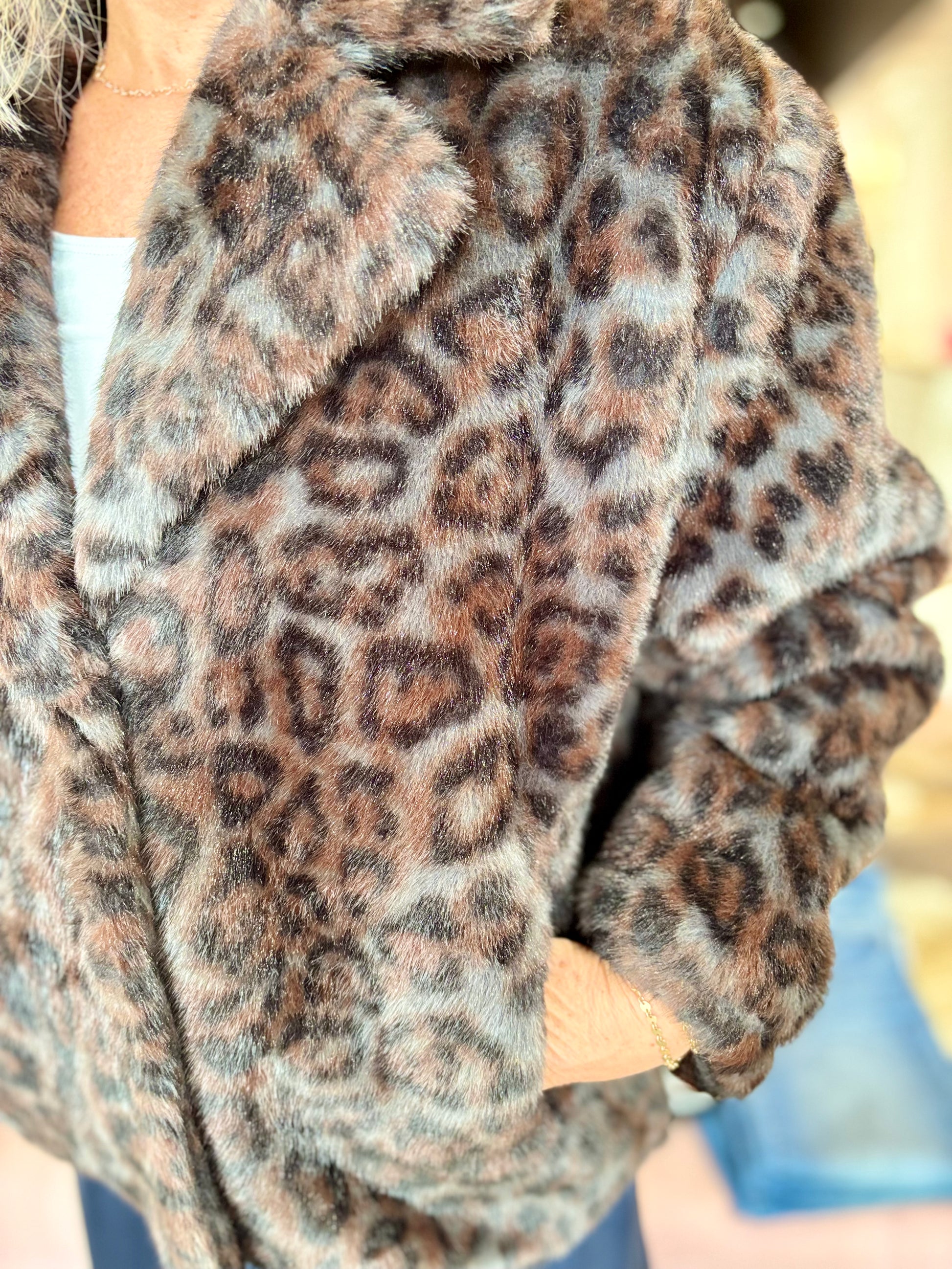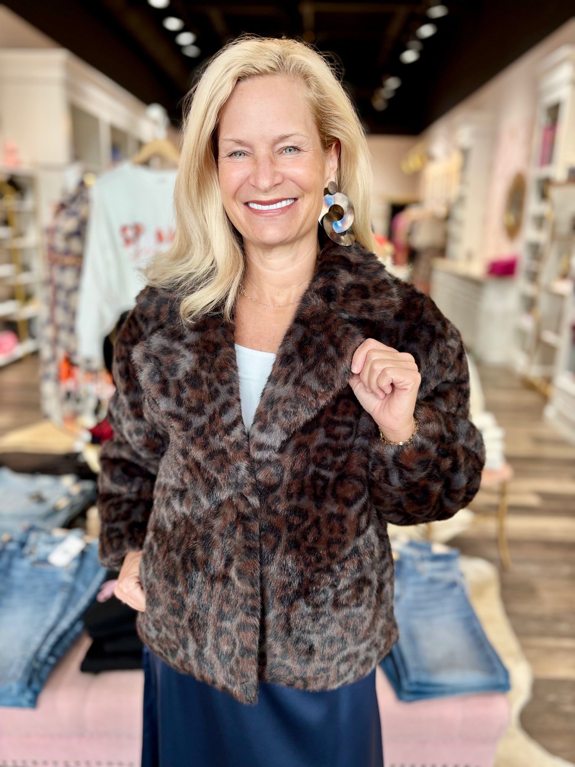 Make a bold statement with this leopard brown faux fur coat. Plush and luxurious, it features a relaxed silhouette and eye-catching animal print, perfect for adding texture and style to any outfit.
