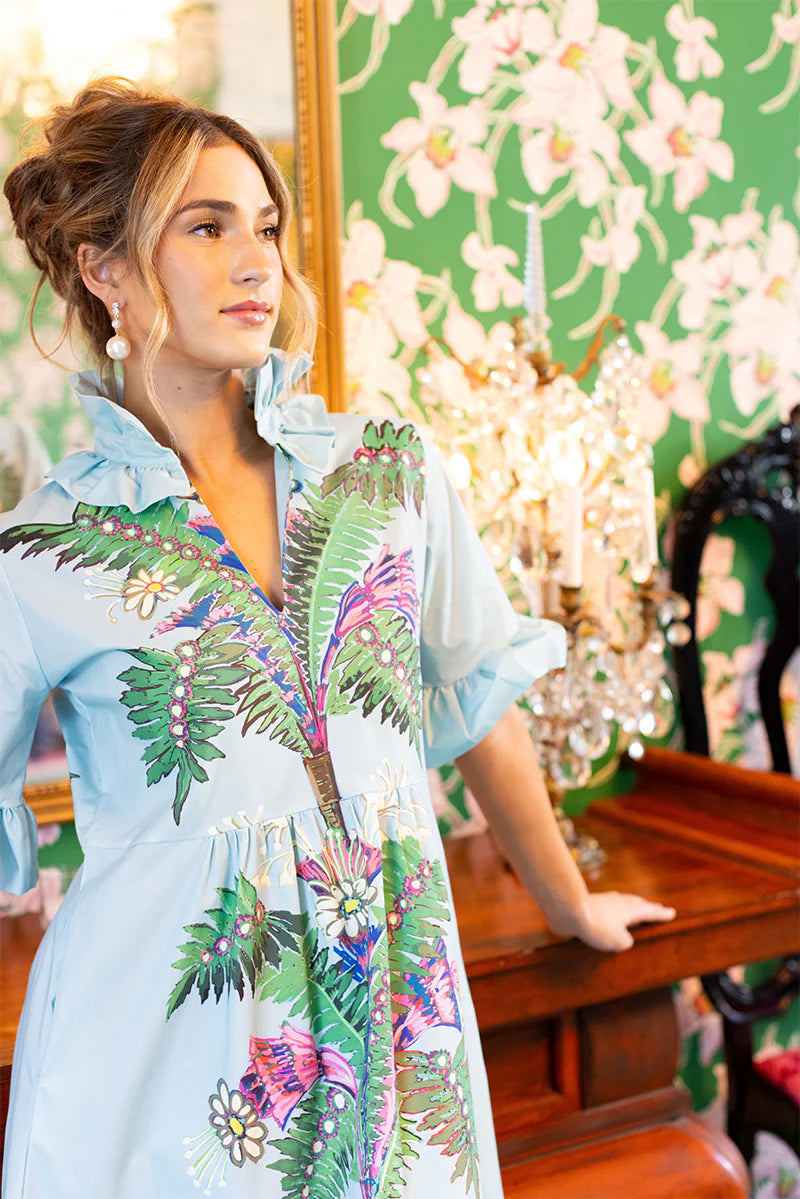 The Gracie© print blends airy blues with vibrant botanical motifs for a look that feels playful and still polished. The print placement draws the eye vertically, creating an elegant, elongating effect that is as flattering as it is striking.