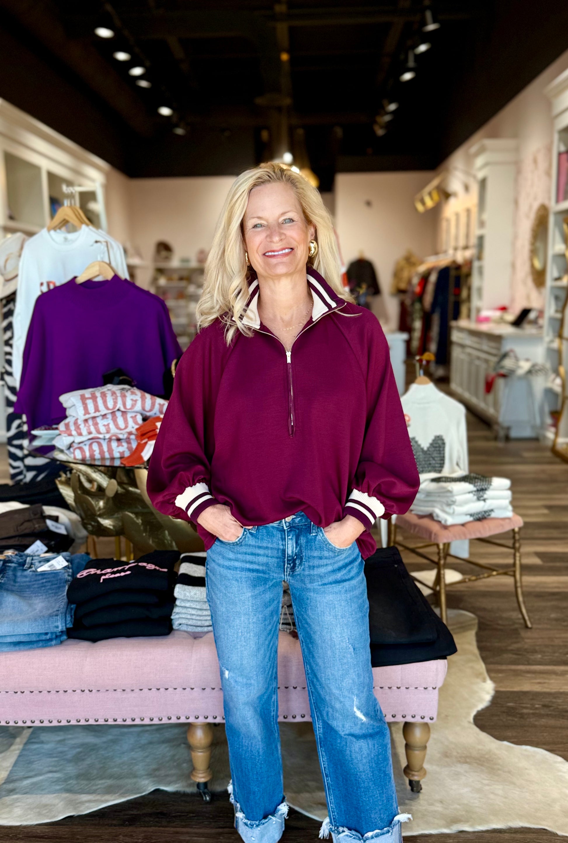 A sporty-chic staple, this long sleeve knit top features a functional half-zip front closure and contrast striped ribbed collar and cuffs for a pop of detail. Soft, cozy, and easy to style for everyday wear.