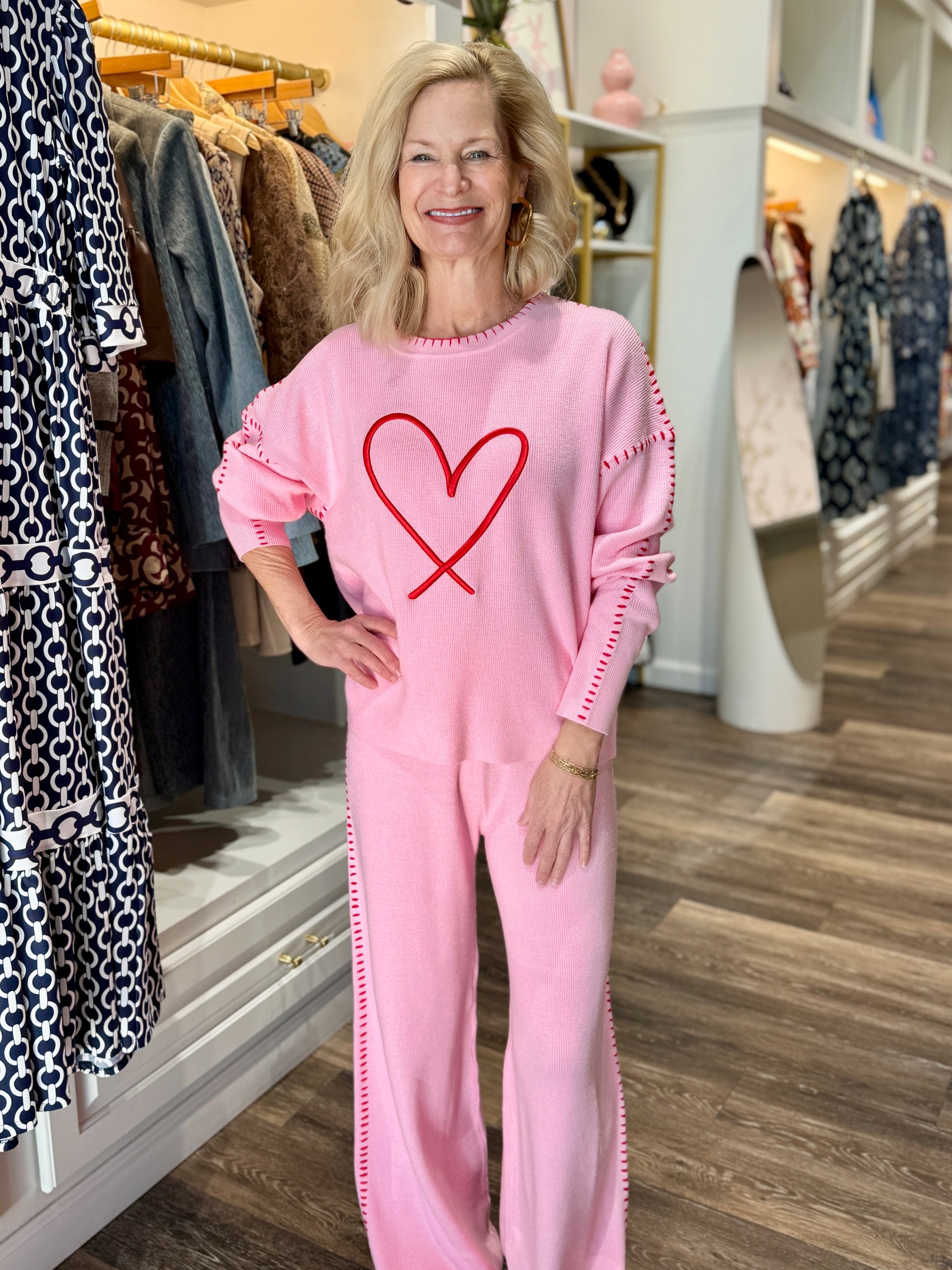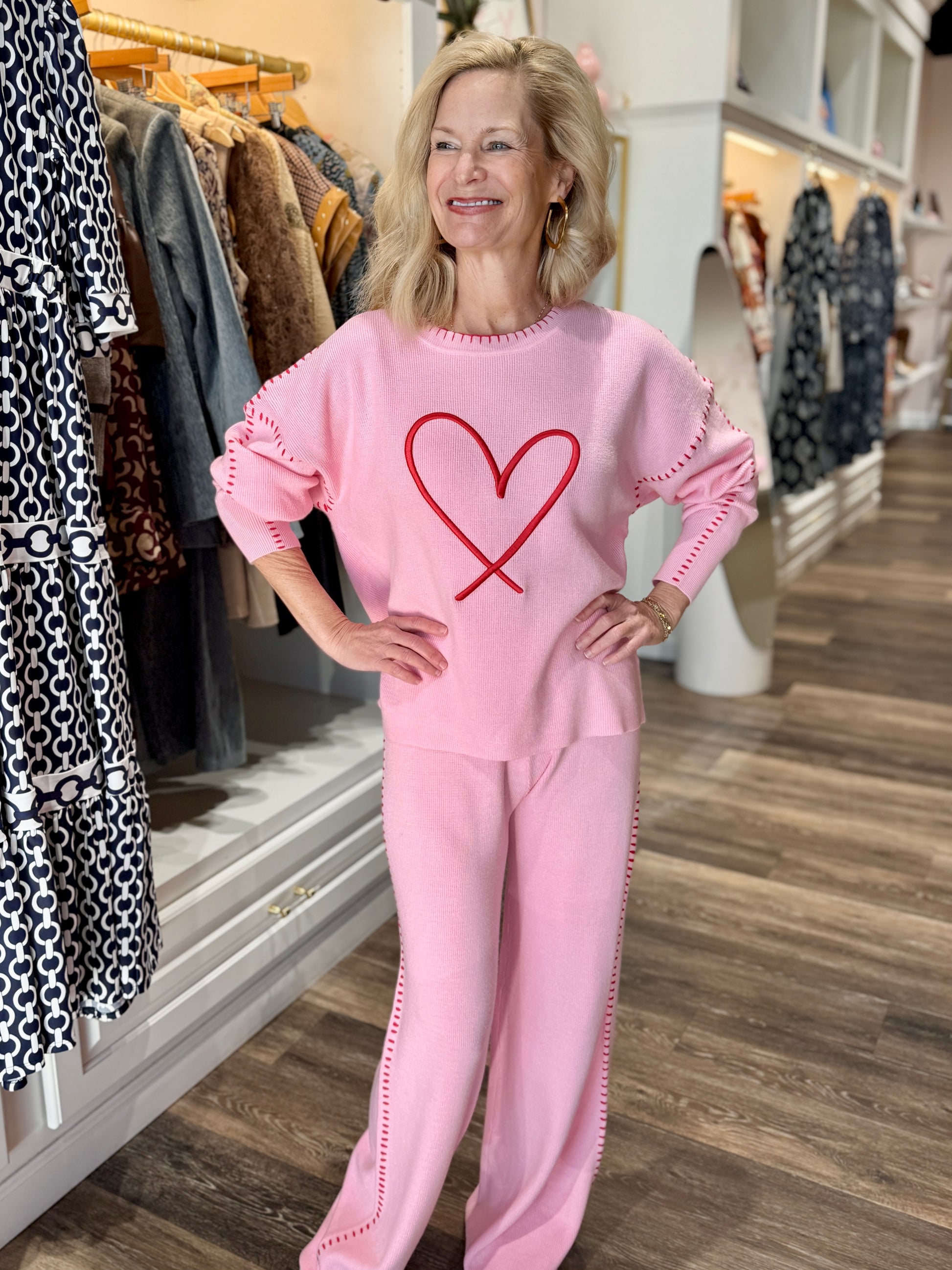 Cozy meets cute in this irresistible pink knit set. Featuring a soft, relaxed-fit sweater with an embroidered heart detail at the center and playful contrast stitching along the sleeves, it pairs perfectly with the matching wide-leg knit pants trimmed with coordinating stitch accents down the sides. The lightweight knit fabric offers all-day comfort while keeping your look polished and fun. Perfect for lounging, running errands, or casual get-togethers, this set is the ultimate blend of comfort, charm, and effortless style.