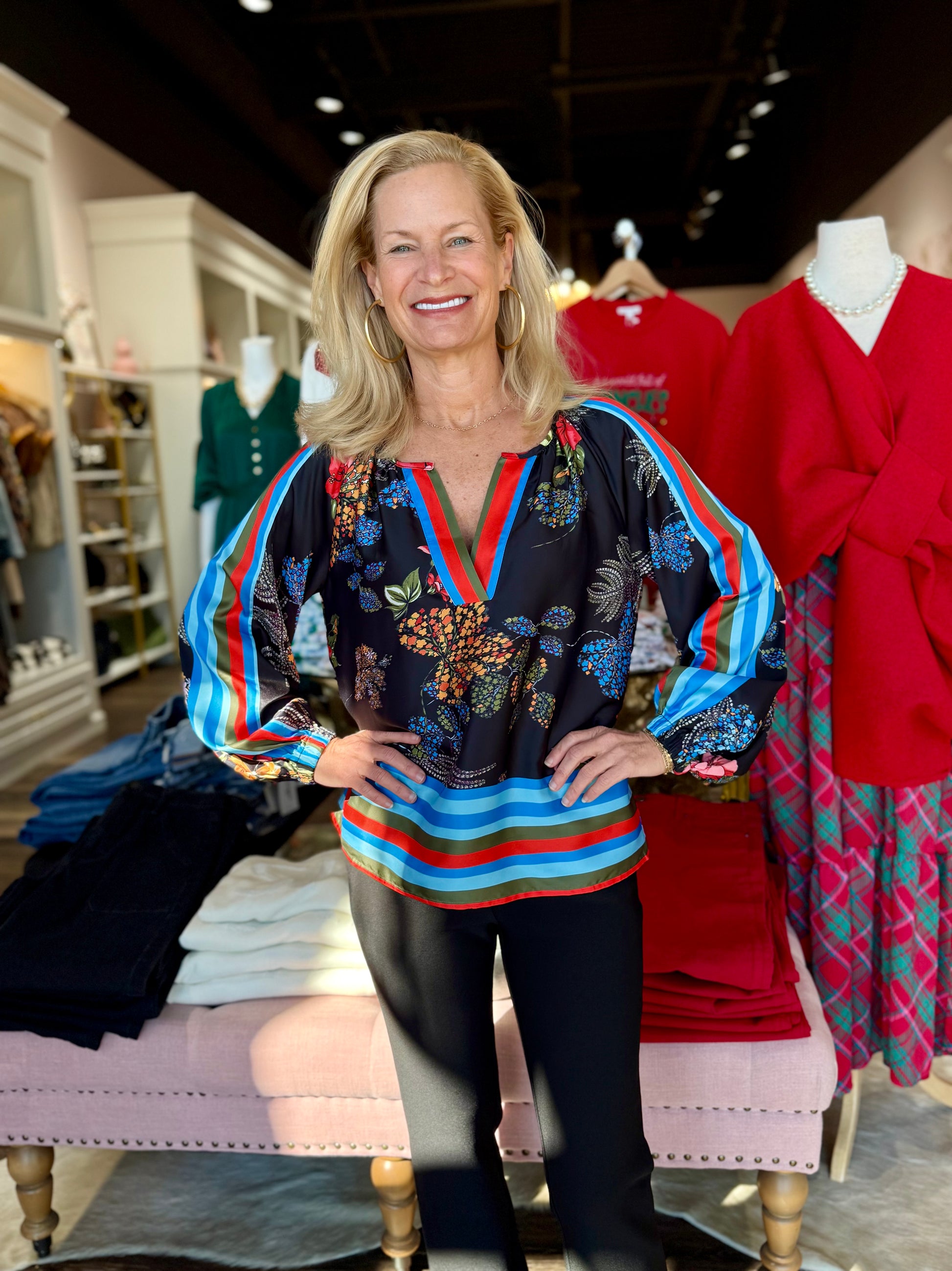 This Jade peasant top features a flattering band collar, relaxed silhouette, and airy sleeves for effortless style. The eye-catching border print adds a vibrant touch, making it perfect for a fresh, standout look.