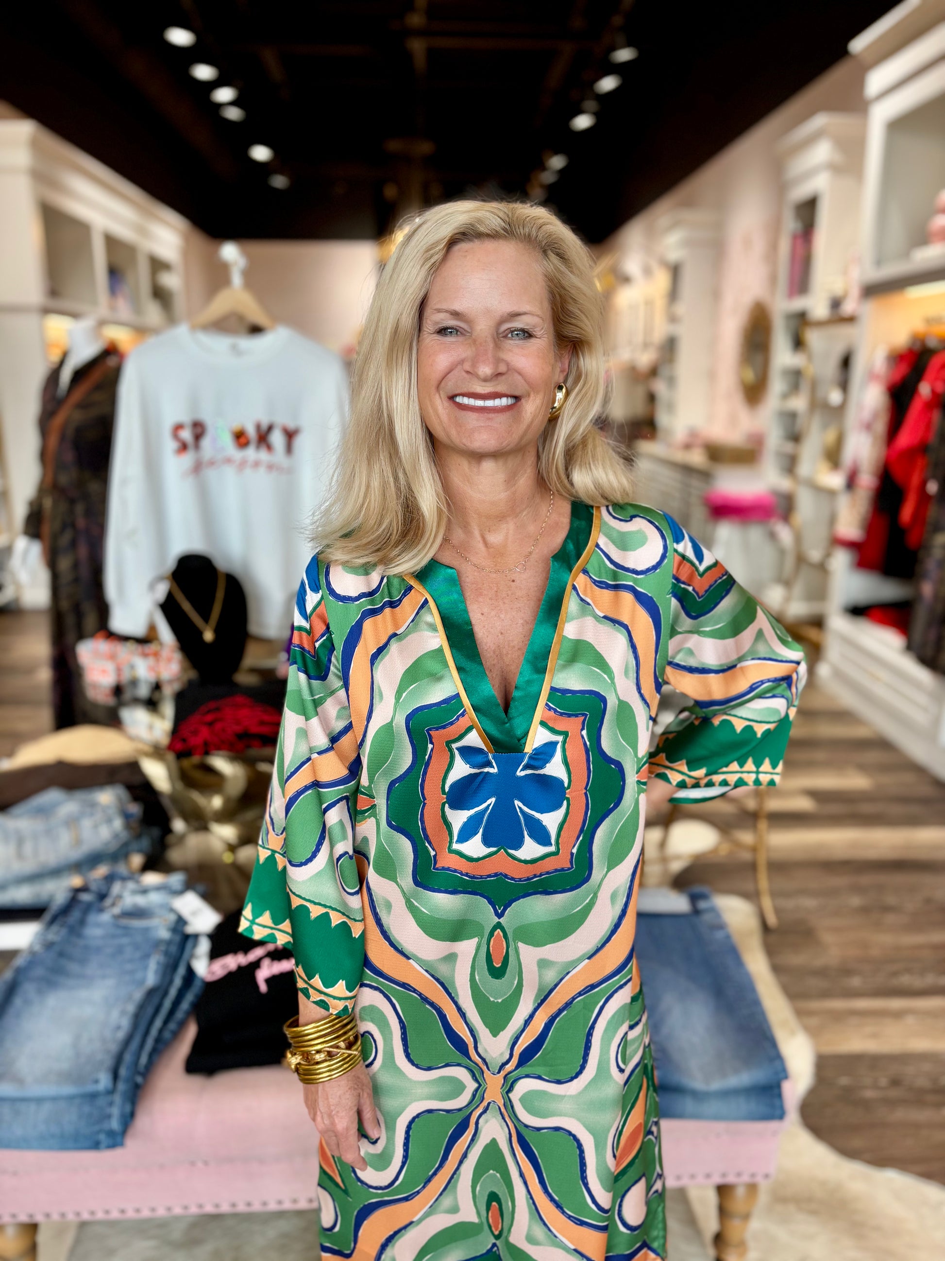 This dress is designed for the woman who loves to radiate joy and embrace vibrant style. The eye-catching Moroccan tile print dances across the fabric, creating a captivating and playful look that's perfect for sunny days and balmy evenings.