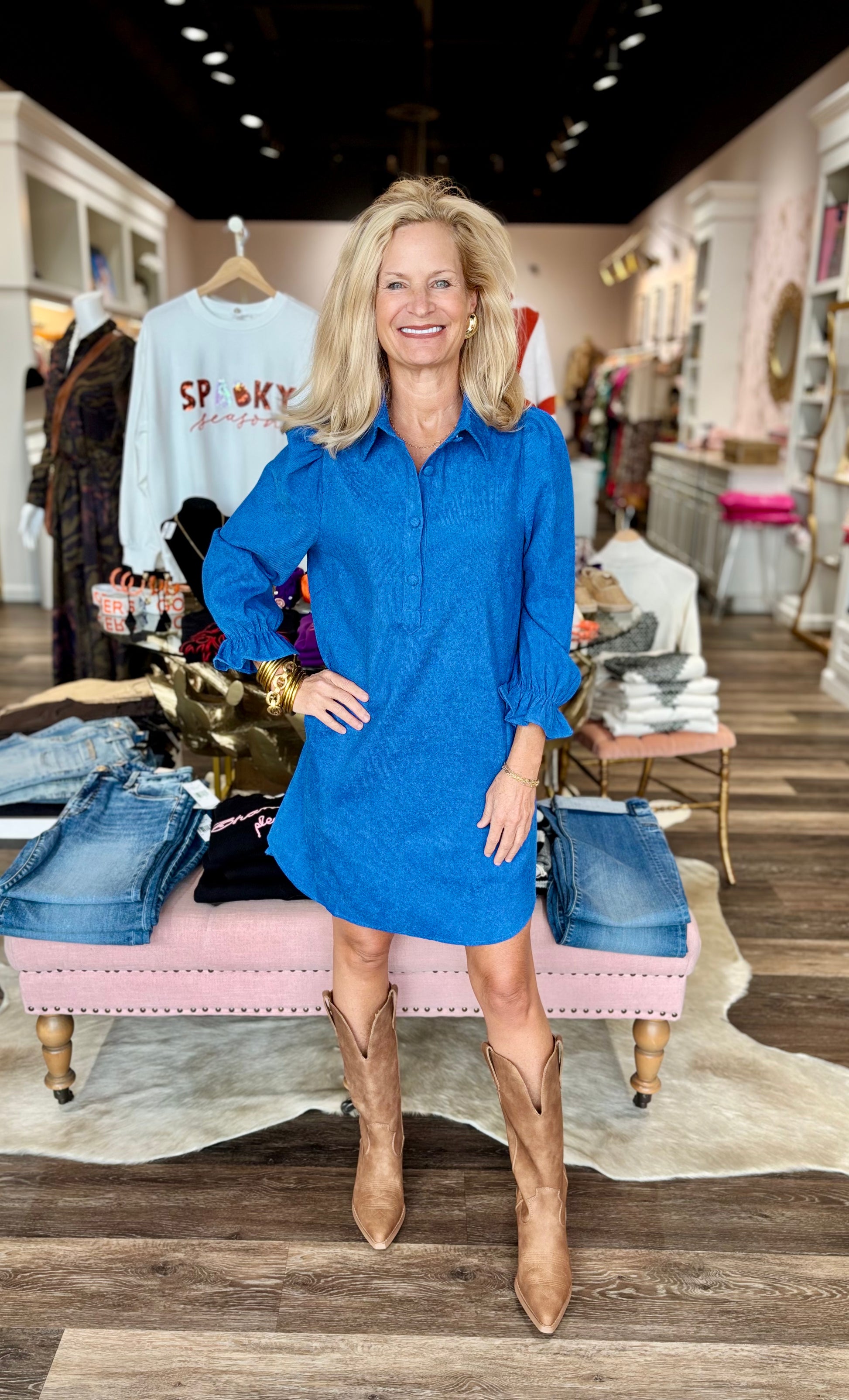 Elevate your fall wardrobe with the Joy*Joy Corduroy Royal Blue Placket Collar Dress. Its rich royal blue hue and soft corduroy fabric bring cozy charm and effortless style to any occasion. The placket collar adds a classic, polished touch, making this dress perfect for layering on crisp autumn days. Embrace comfort and vibrant color all season long.