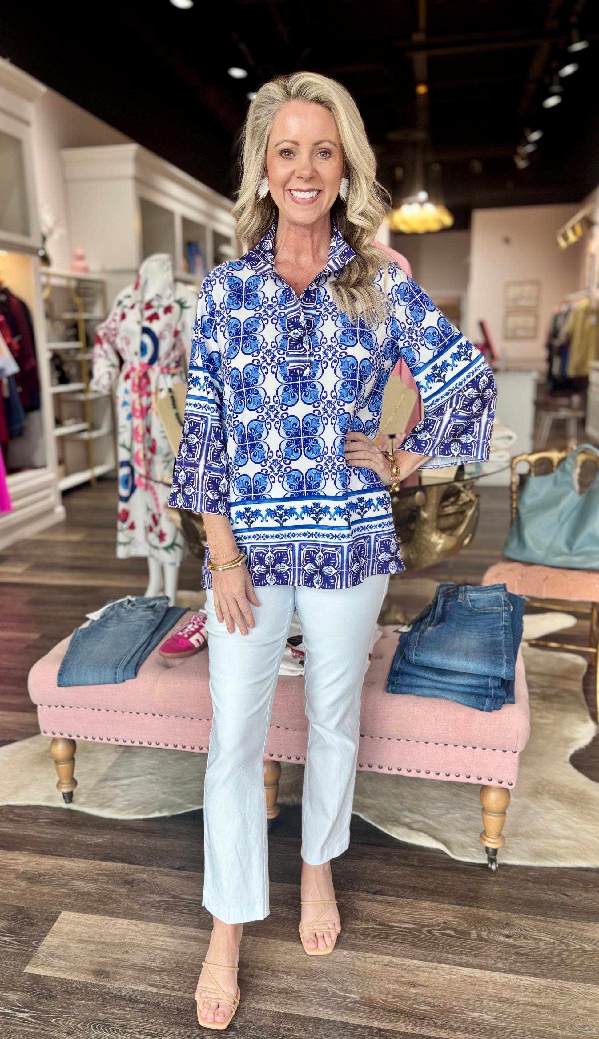 Perfect for any occasion, this button collared top features quarter sleeves and is made from a comfortable polyester material. The stylish blue damask design adds a touch of elegance to this playful and versatile piece.
