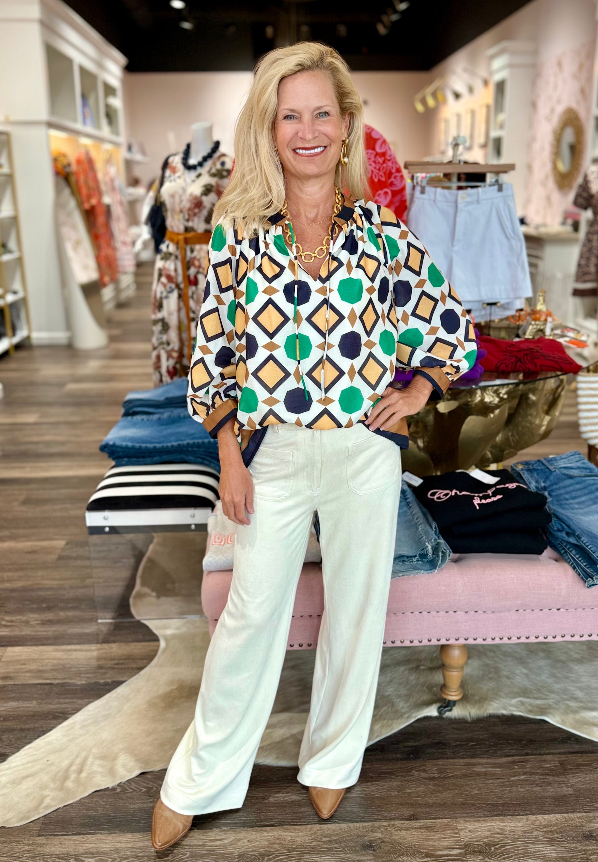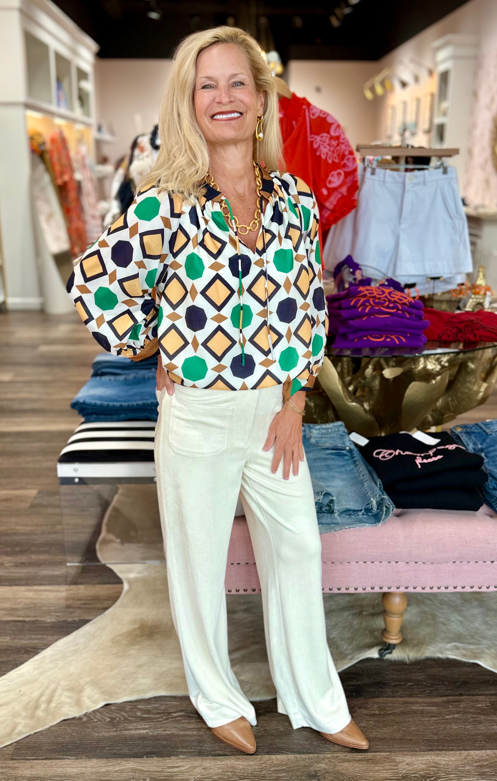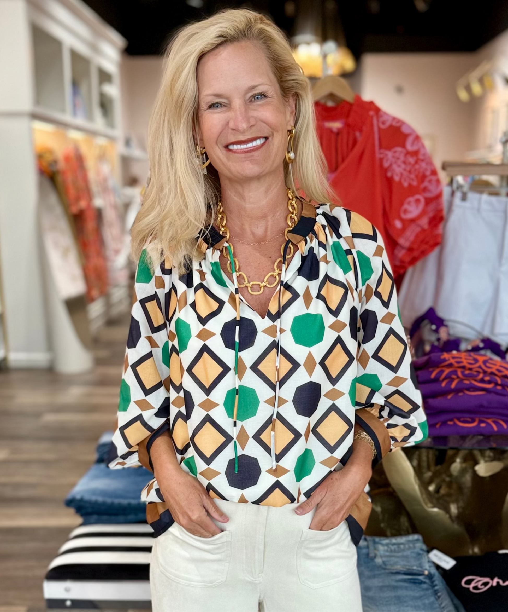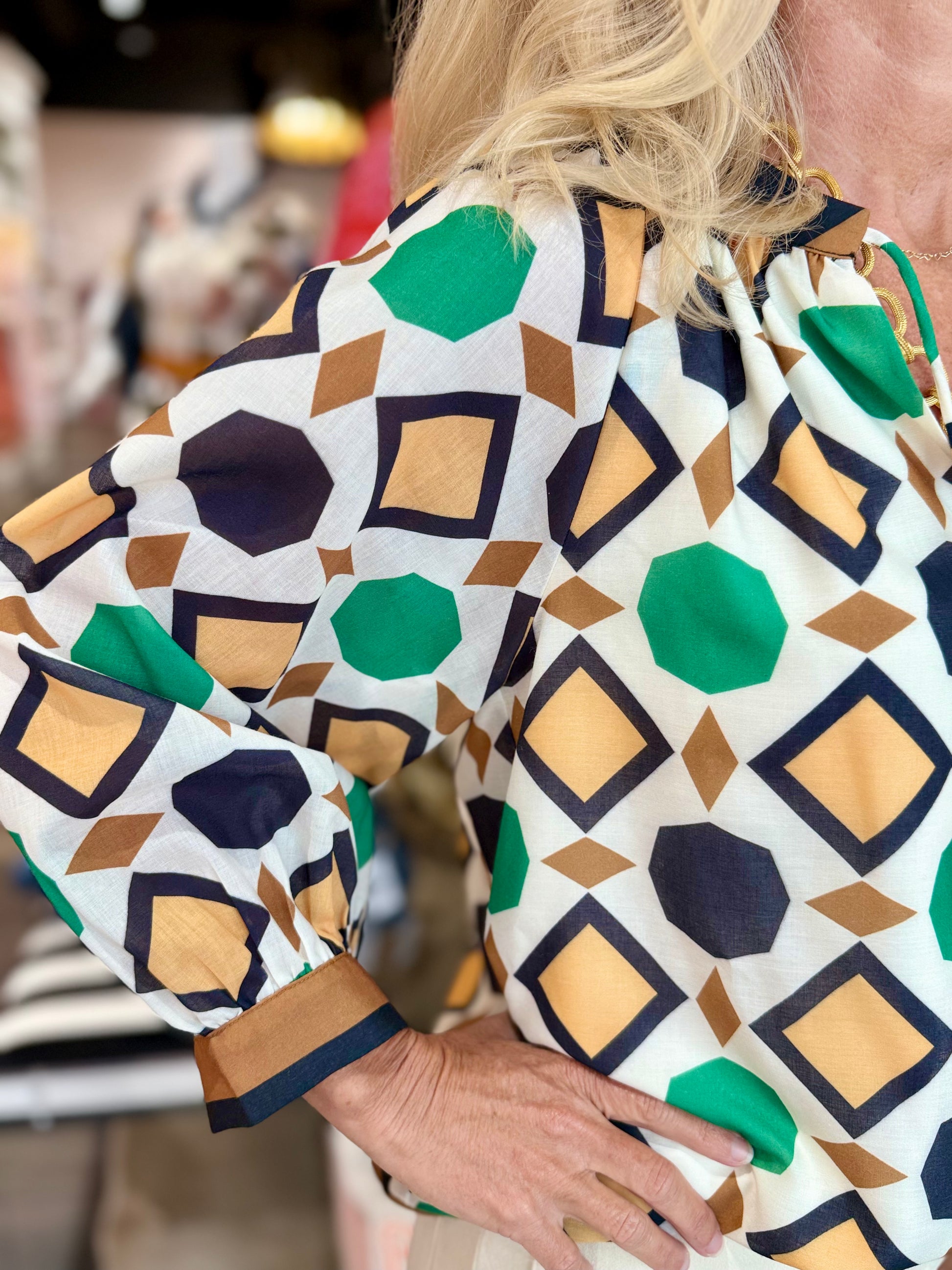 This Jade peasant top features a flattering band collar, relaxed silhouette, and airy sleeves for effortless style. The eye-catching geo border print adds a vibrant touch, making it perfect for pairing with white denim or your favorite shorts for a fresh, standout look.