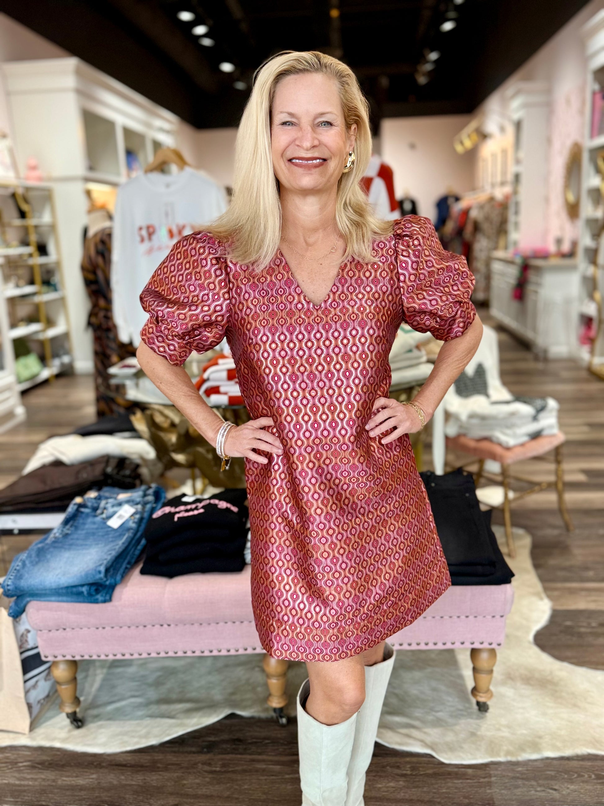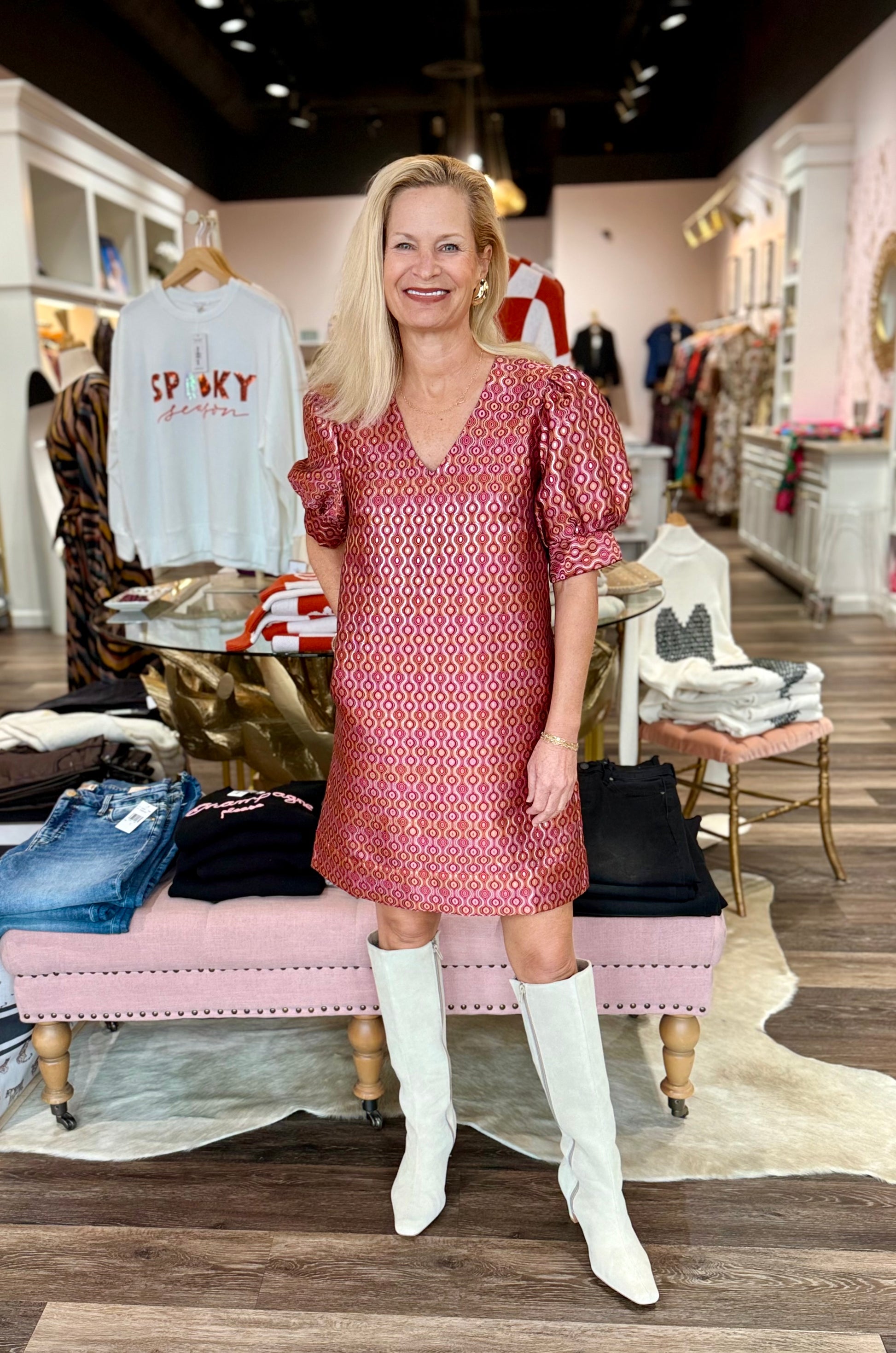 Effortless and chic, the Groovy Grid Dress by JADE features a flattering V-neckline, short sleeves, and a classic shift silhouette. Crafted in a textured poly-jacquard fabric with a subtle grid pattern, this jade-beauty brings just the right mix of polish and playfulness. Perfect for work, brunch, or date night—style it up with heels or keep it casual with flats.