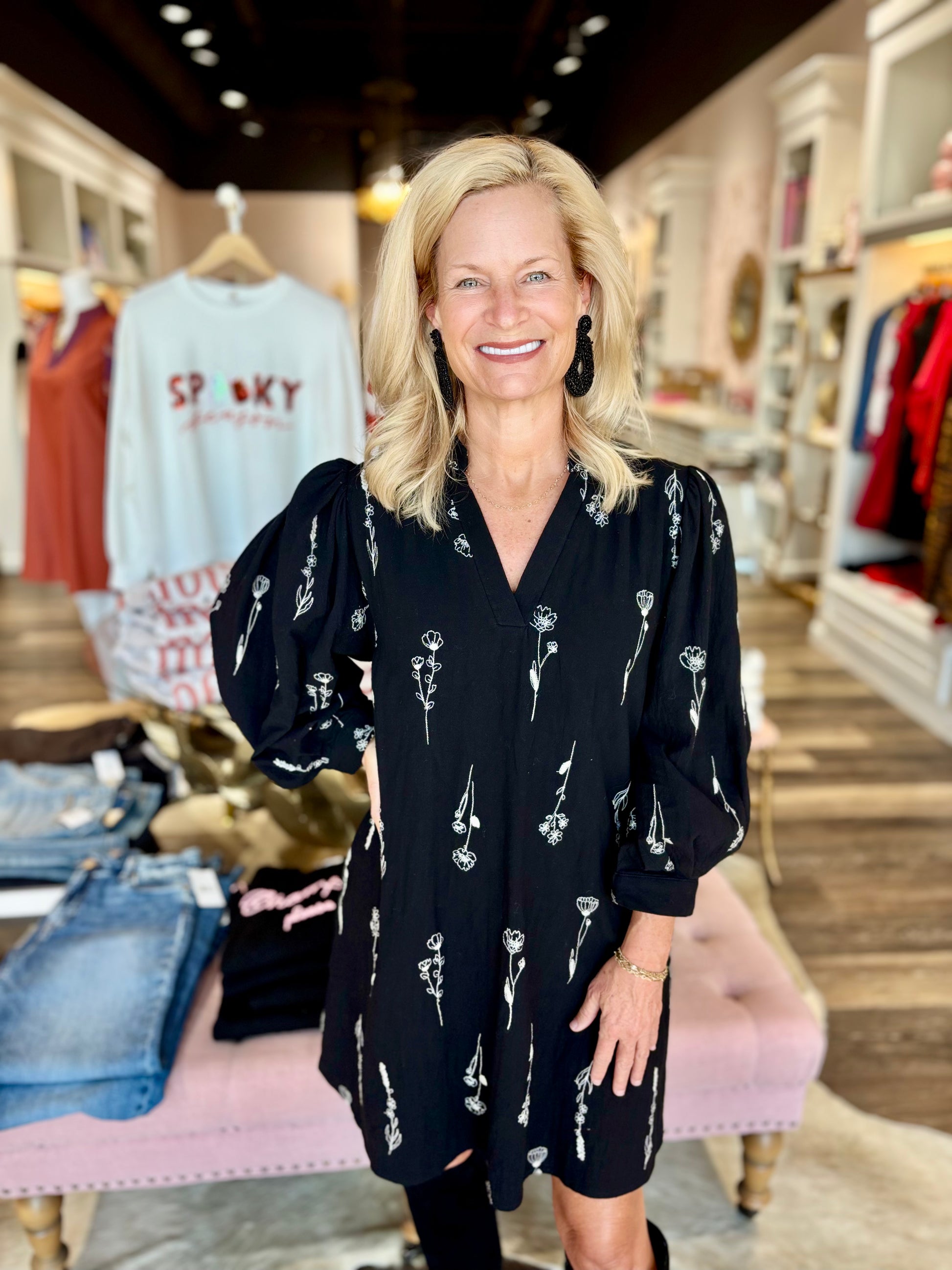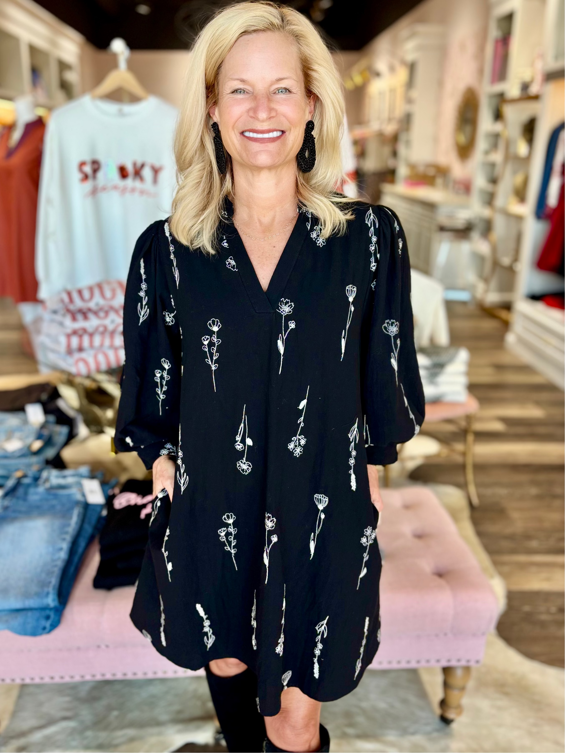 Chic and feminine, this black mini dress features delicate white embroidered flowers and voluminous 3/4 balloon sleeves. The split neckline adds a touch of ease, while side pockets bring functionality. Fully lined for a smooth, comfortable fit.