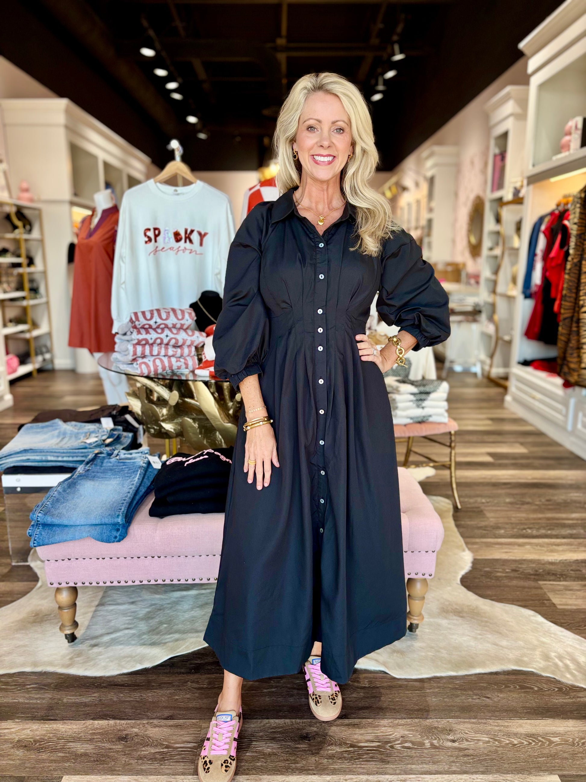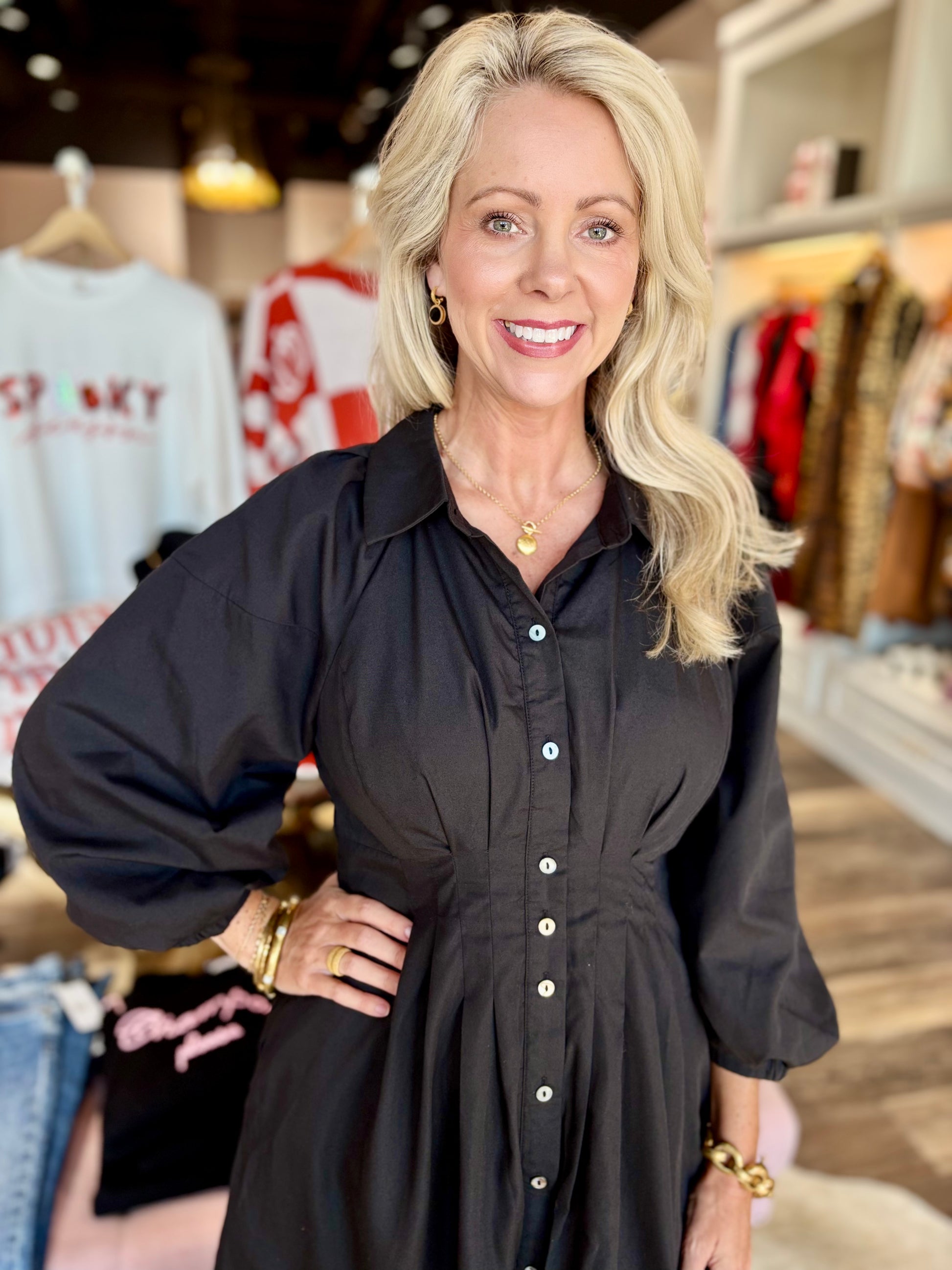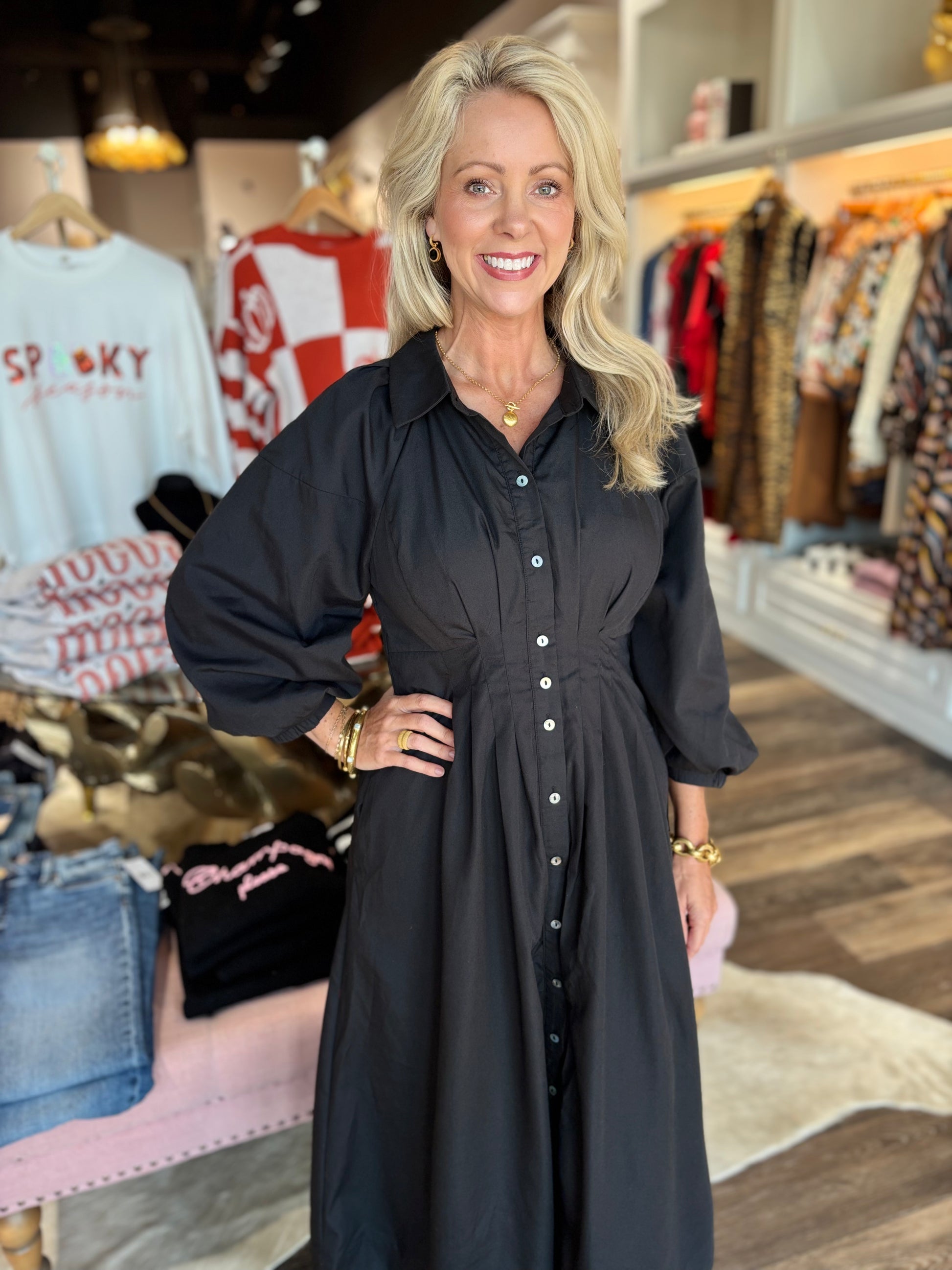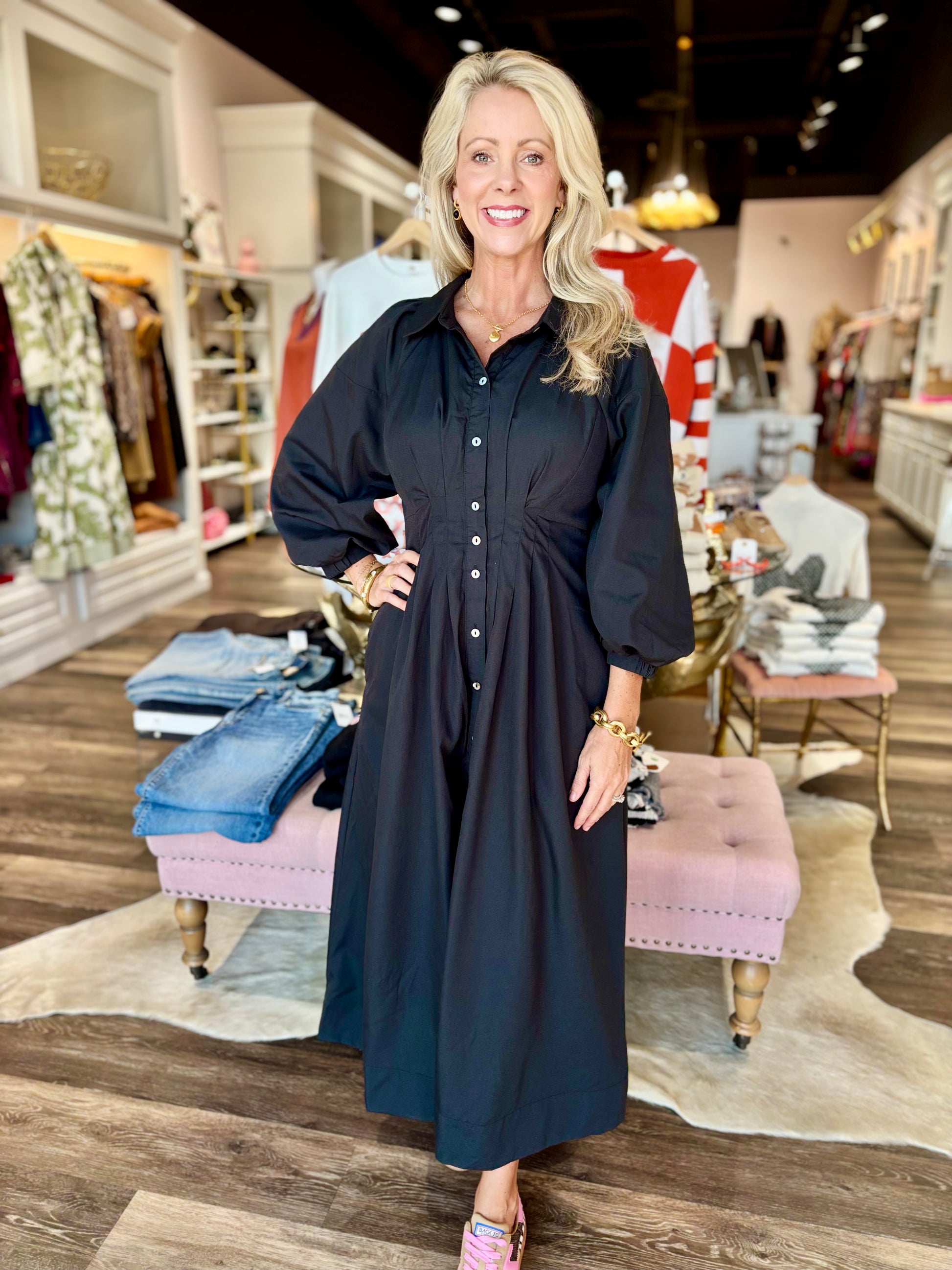 Effortlessly elegant, this black midi dress features a pleated front detail and a chic button-front closure. Designed with practicality in mind, it includes convenient side pockets. Perfect for both workdays and weekend outings, this dress combines classic style with modern sophistication.