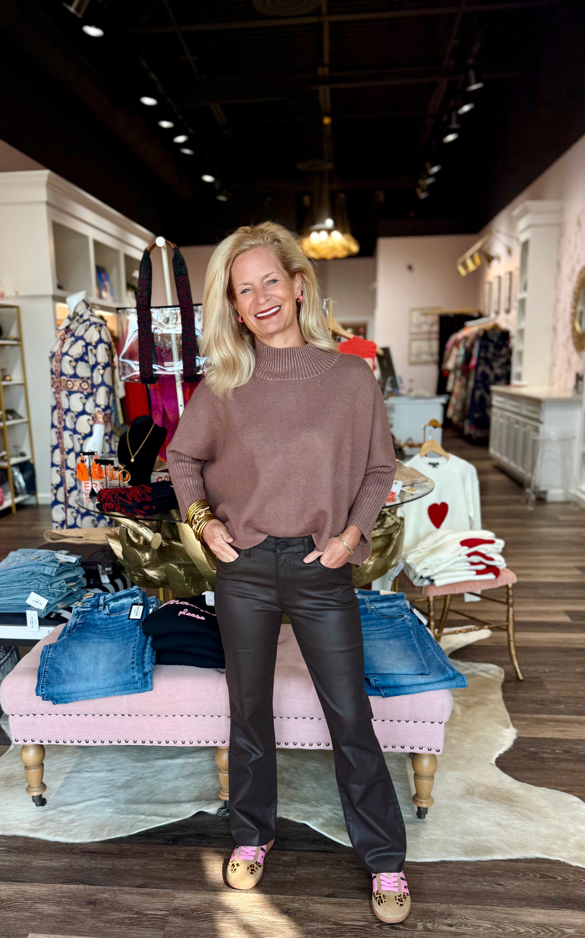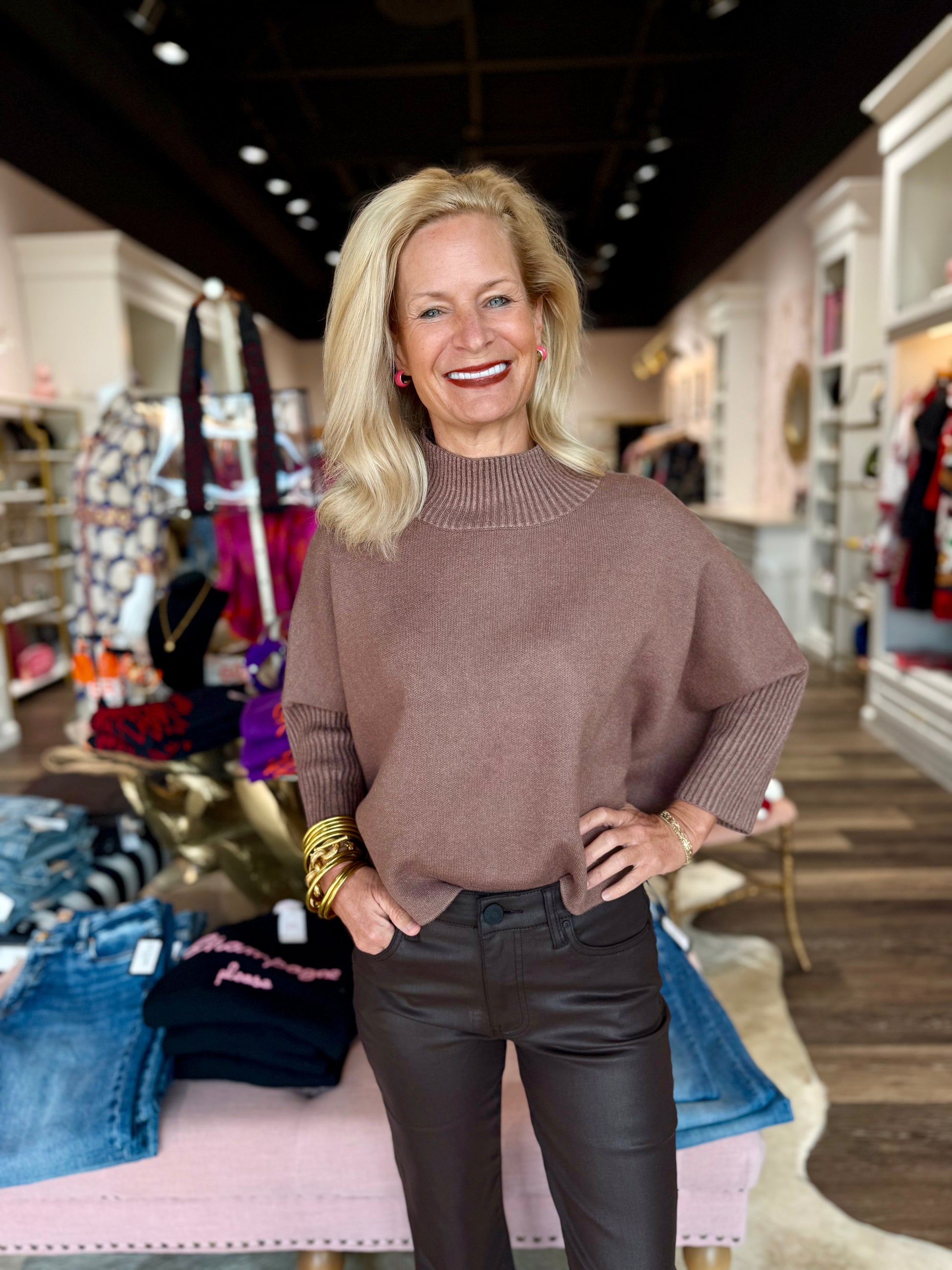 Oversized boxy sweater with fitted mock neck & 3/4 sleeves
