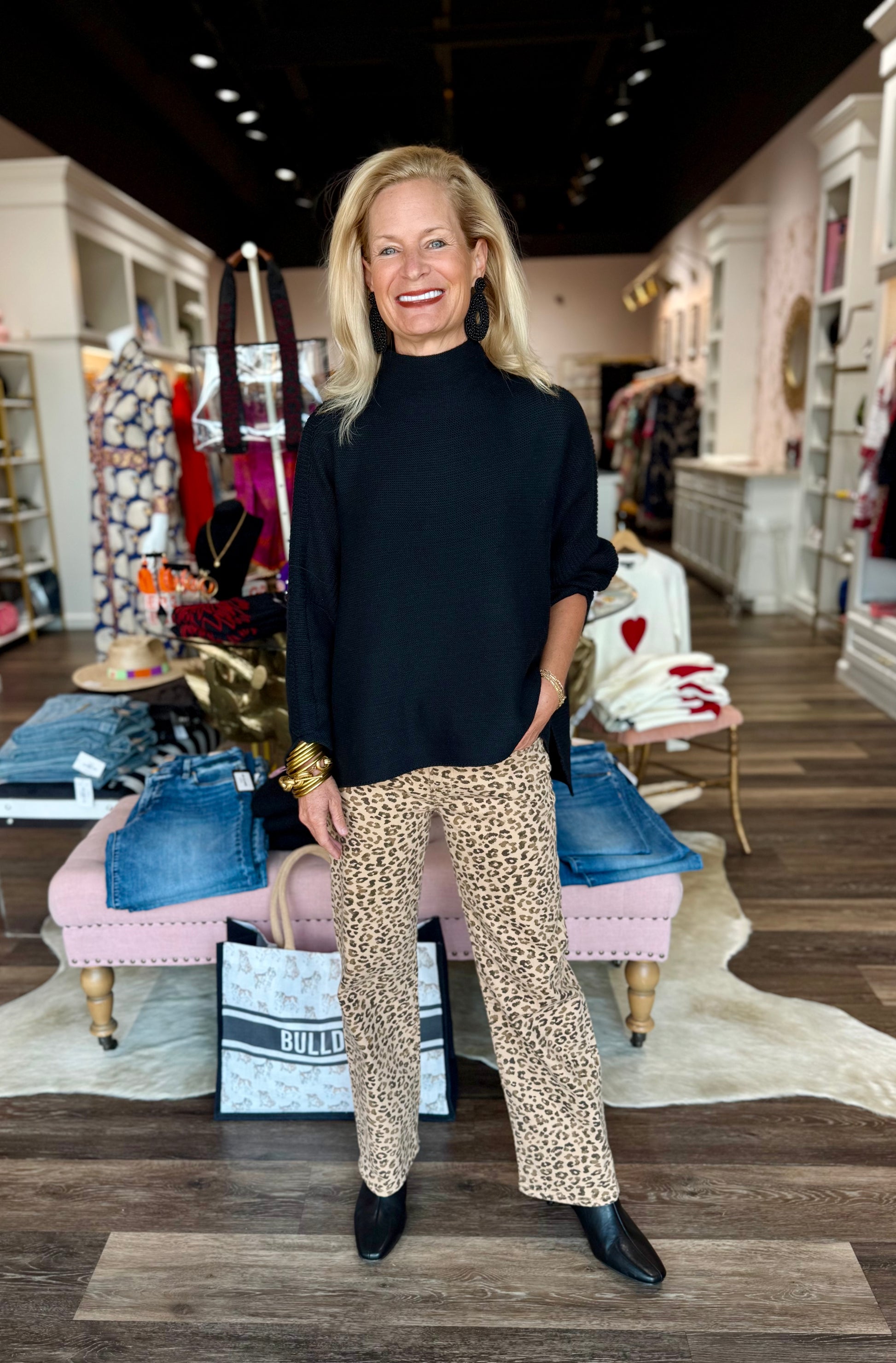 Oversized turtleneck hi/lo sweater in garter stitch with 3/4 sleeve, contrasting rib accents and side slits.