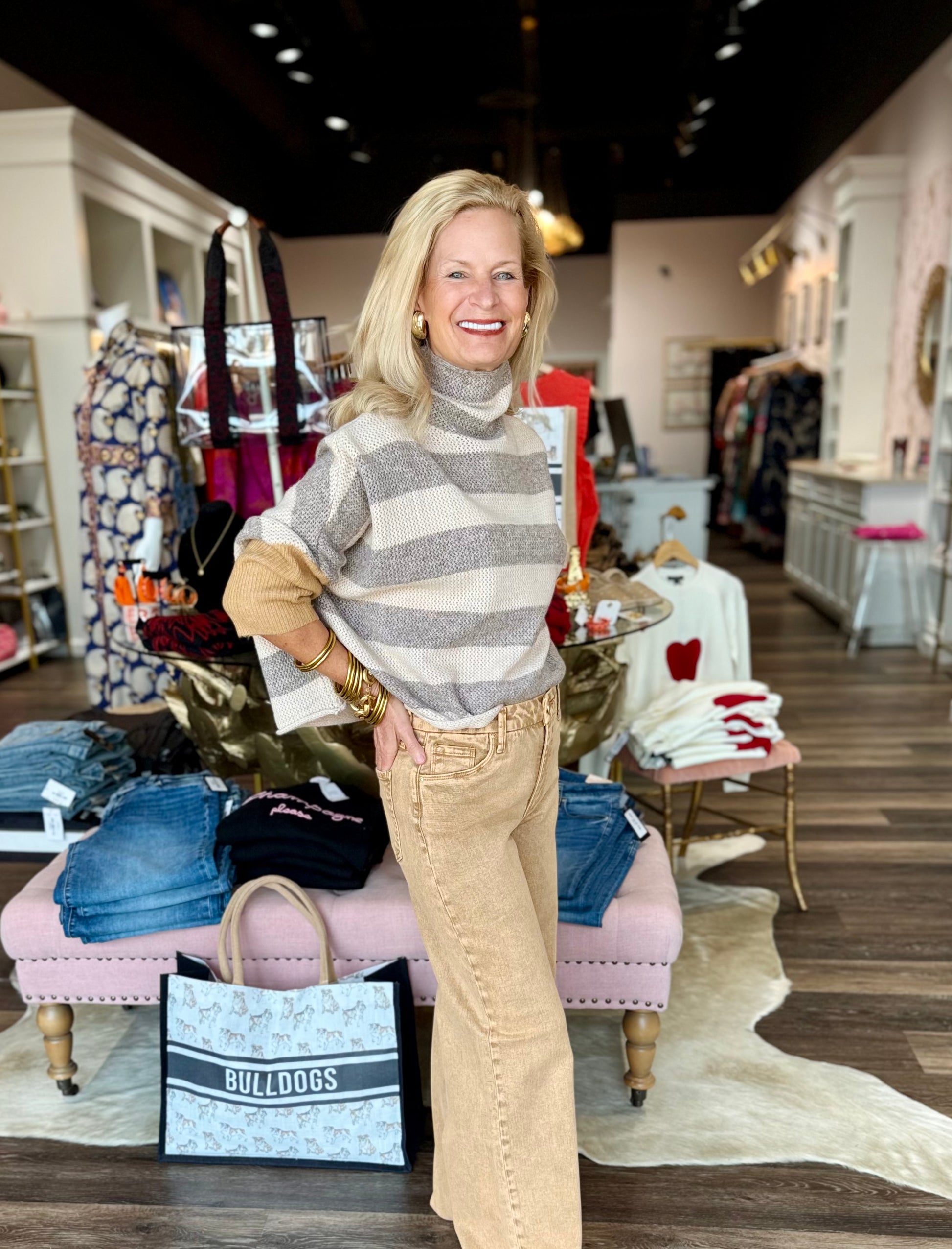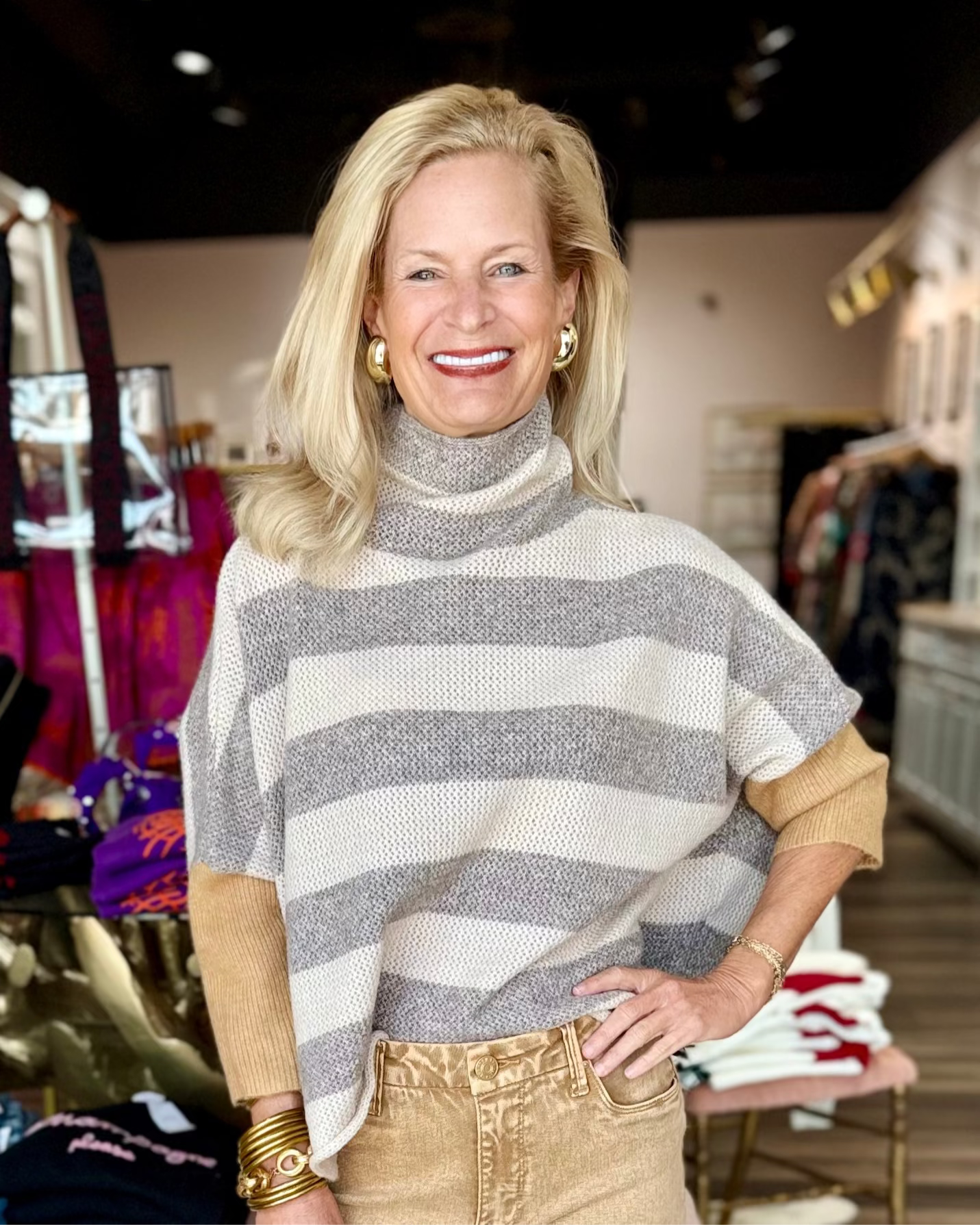 Boxy turtleneck 'Aja' in 3-tone stripe color blocking in criss-cross stitch