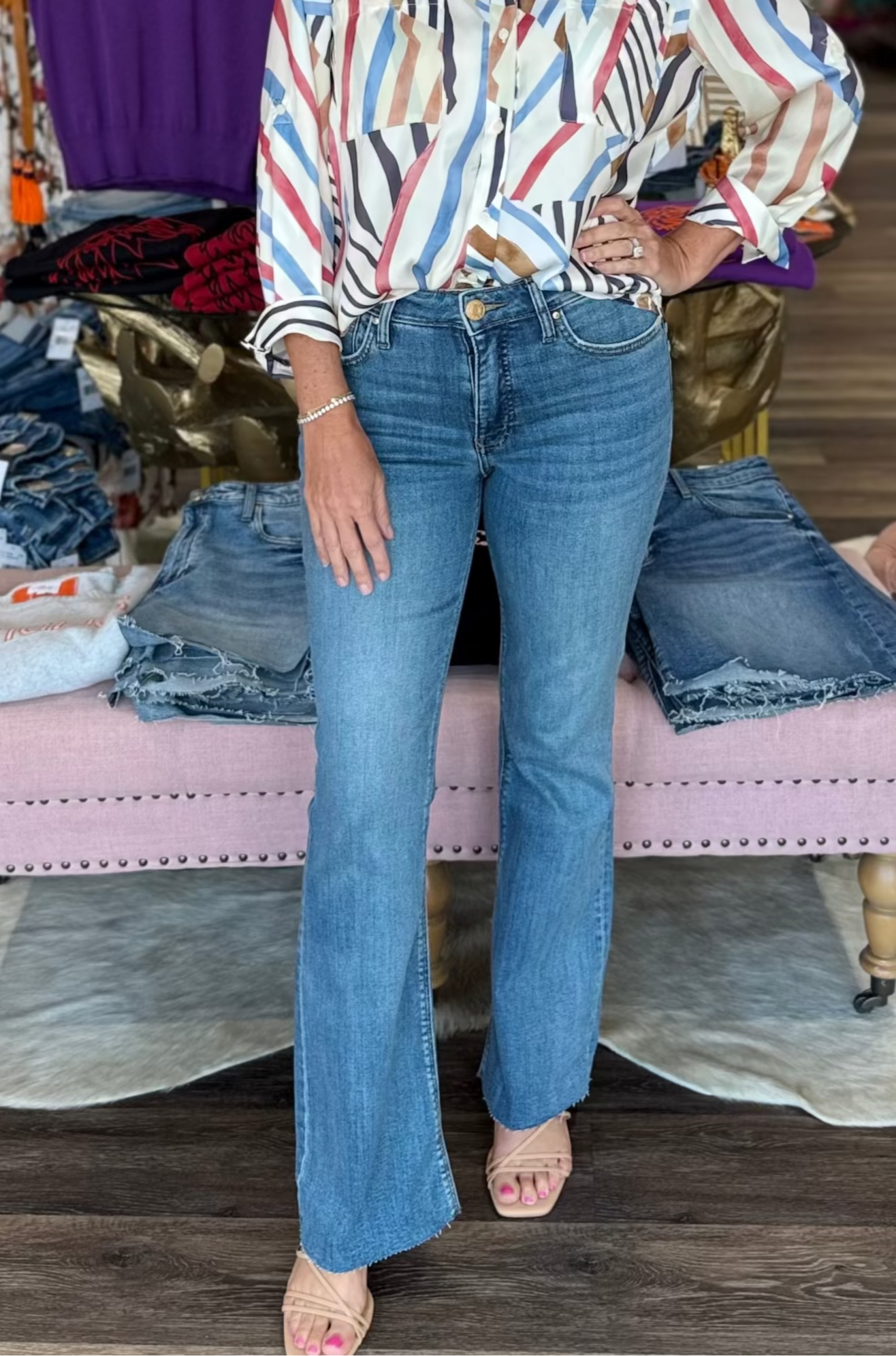 Slightly flared legs with raw hems designed in stretch-denim jeans with our Fab Ab front pockets that smooth and add comfort making these an all-time favorite.