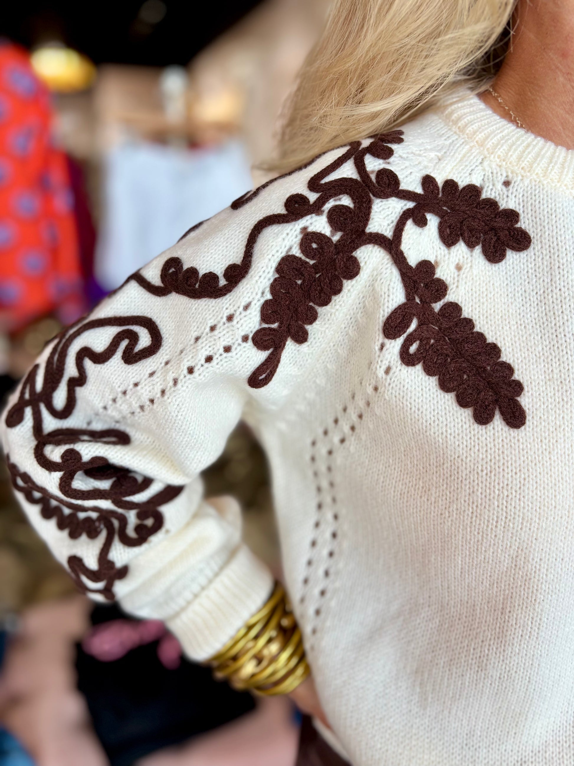 An elegant ivory sweater adorned with intricate brown embroidery along the shoulders and down the arms. Designed with a soft knit and timeless silhouette, this piece blends subtle sophistication with artisanal charm — perfect for elevating everyday looks.