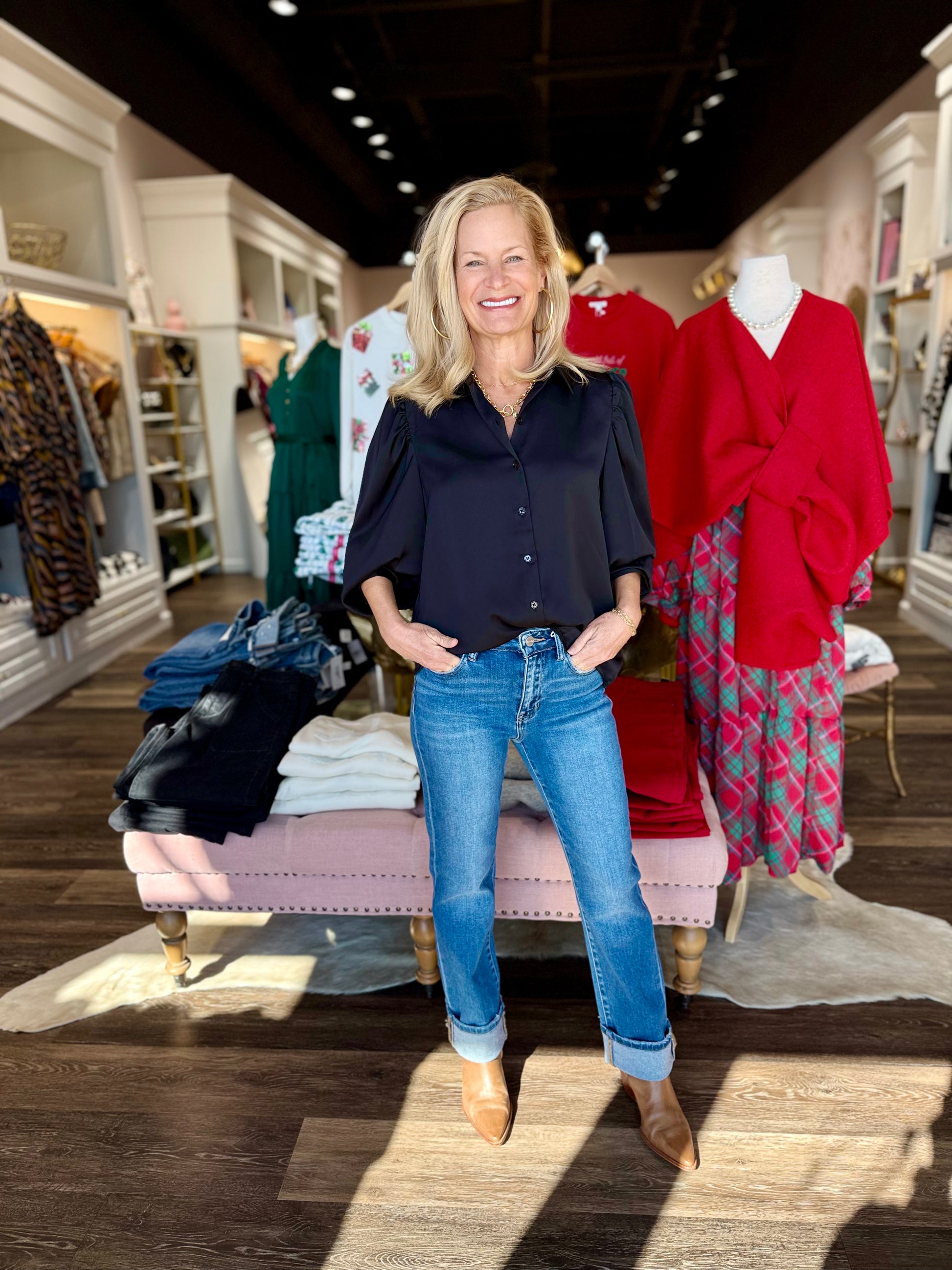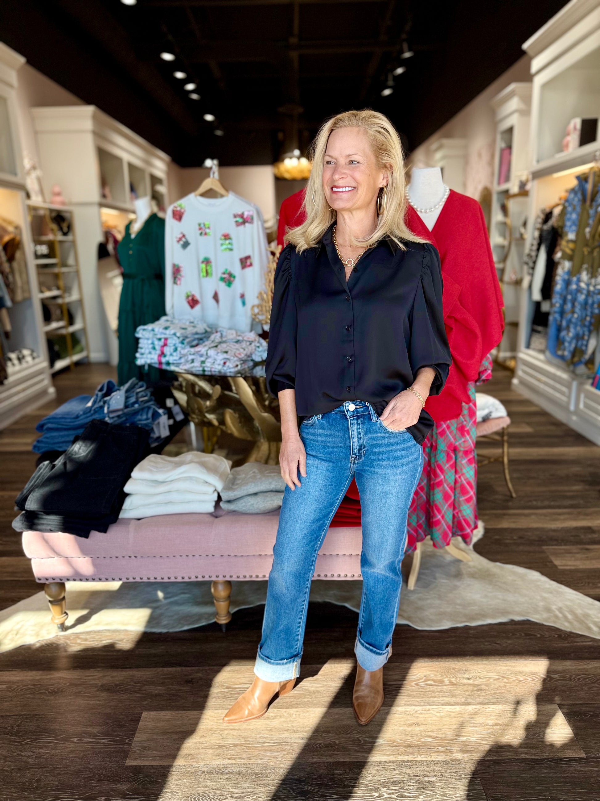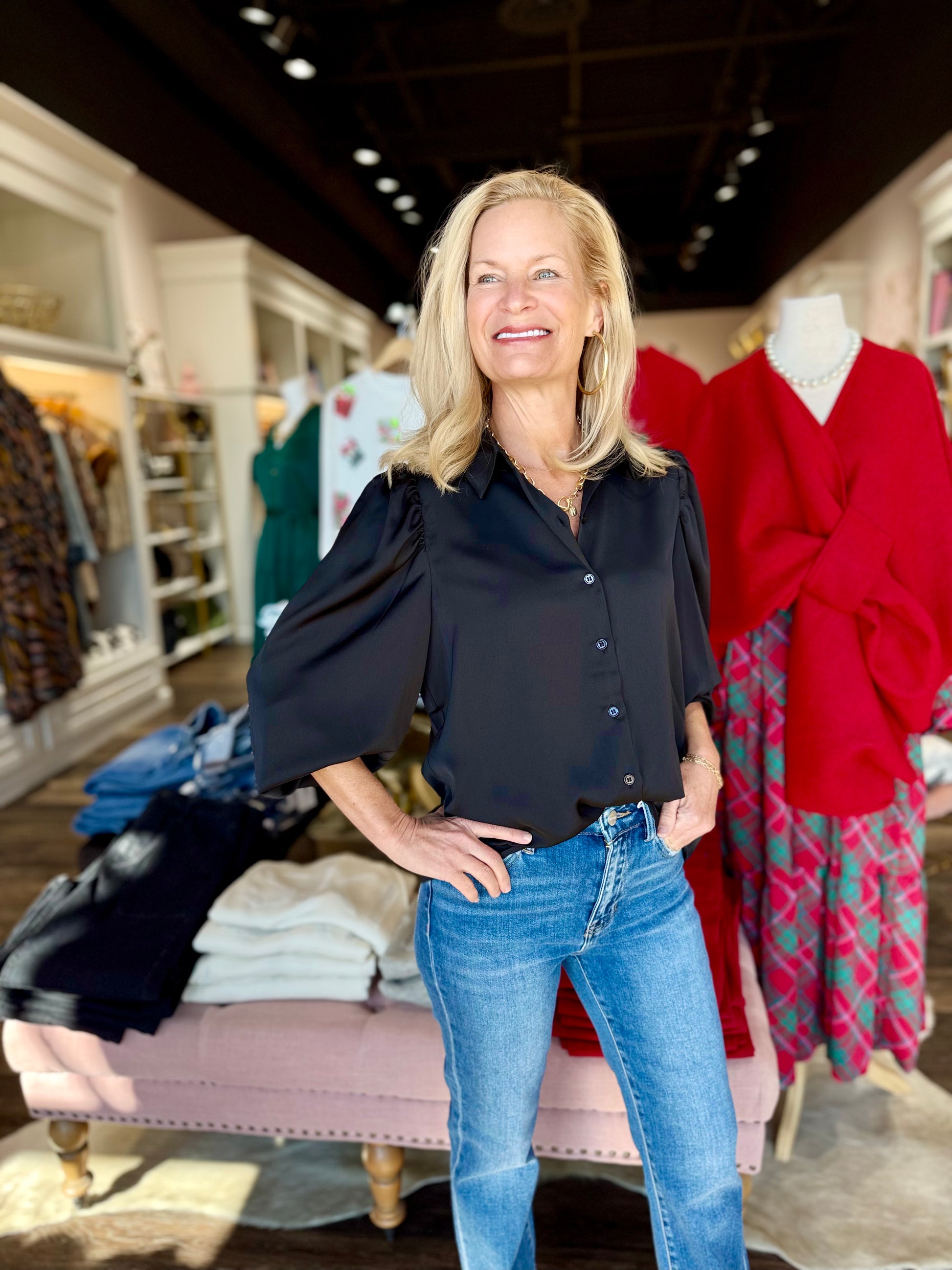 Long Sleeve Recycled Poly Button-Down Puff Shoulder Blouse Black
