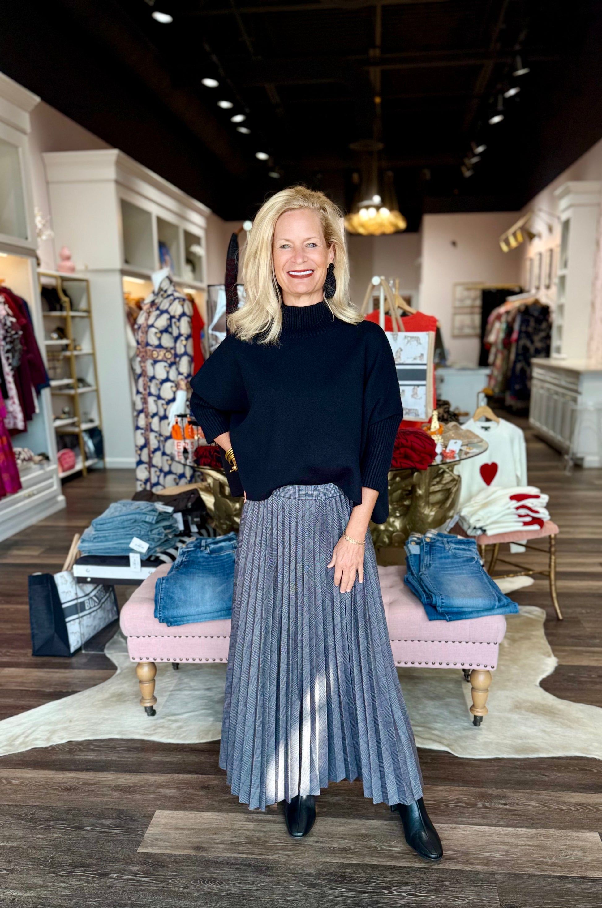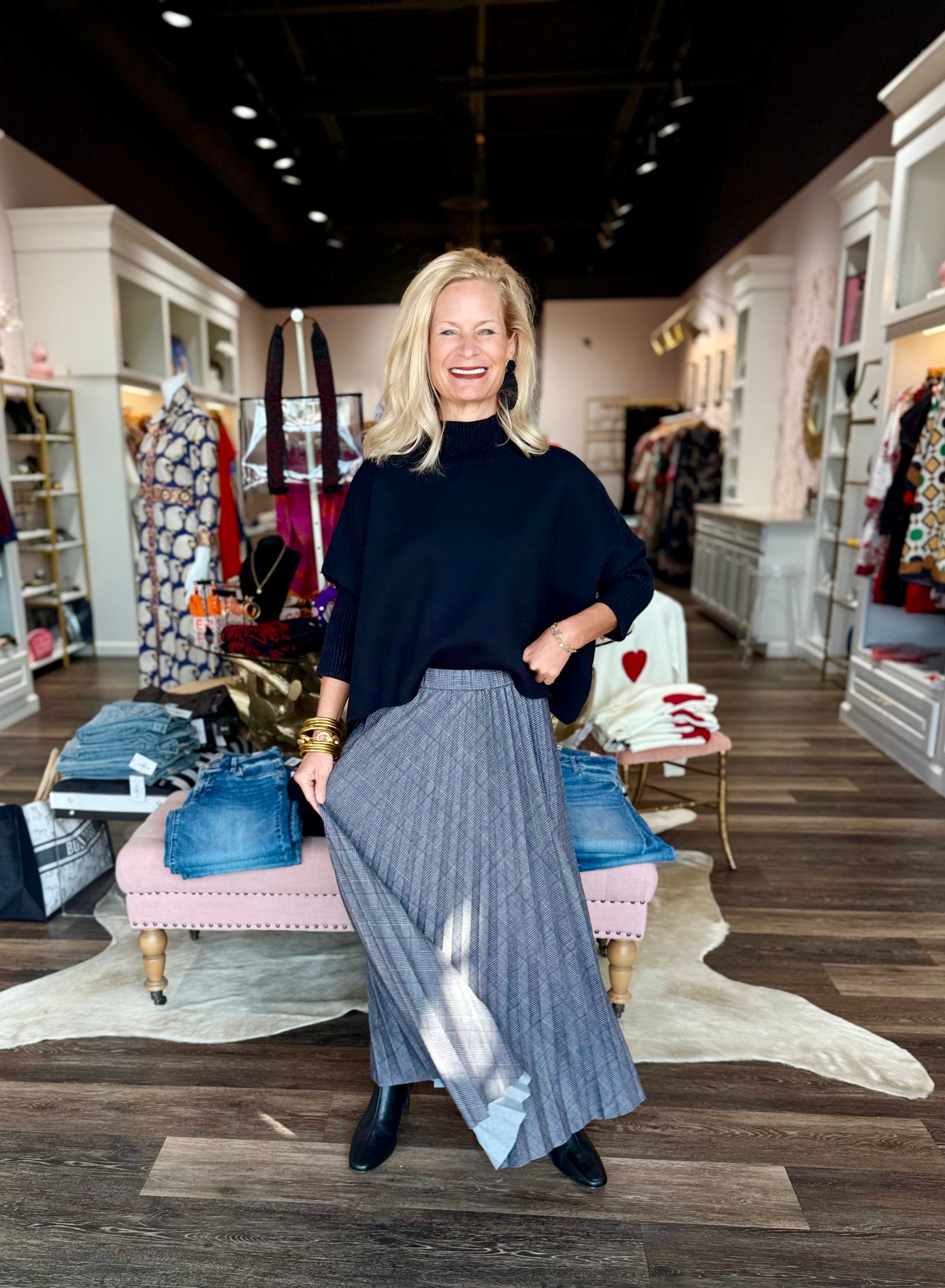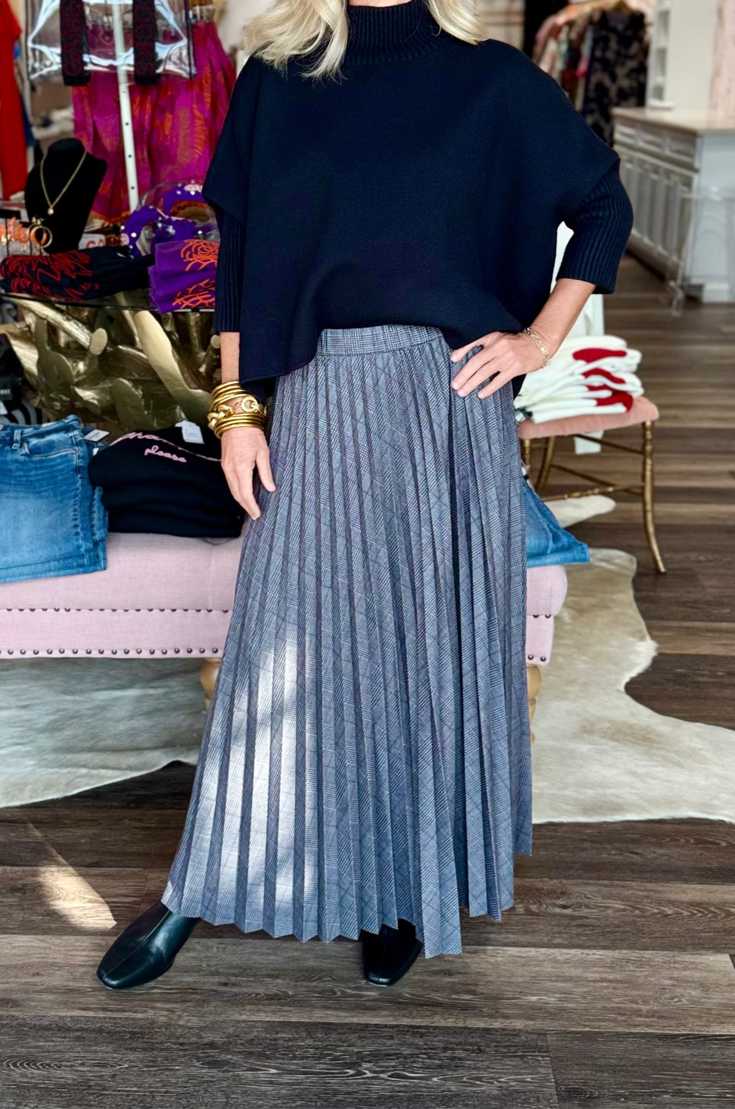 The Pierra Ponte Pleated Midi Skirt, in a menswear inspired plaid, features permanent pleats, an elasticated waist and a raw-edge hem that makes it easy to alter. Made from 4-way stretch Lightweight Ponte and completely unlined, this midi skirt is bias cut in a sunrise pleat technique that is beautifully flowing. Style the Perra Ponte Pleated Midi Skirt with the Arden Oversized Washable Cashmere Sweater Vest and Essential Longsleeve Turtleneck.
