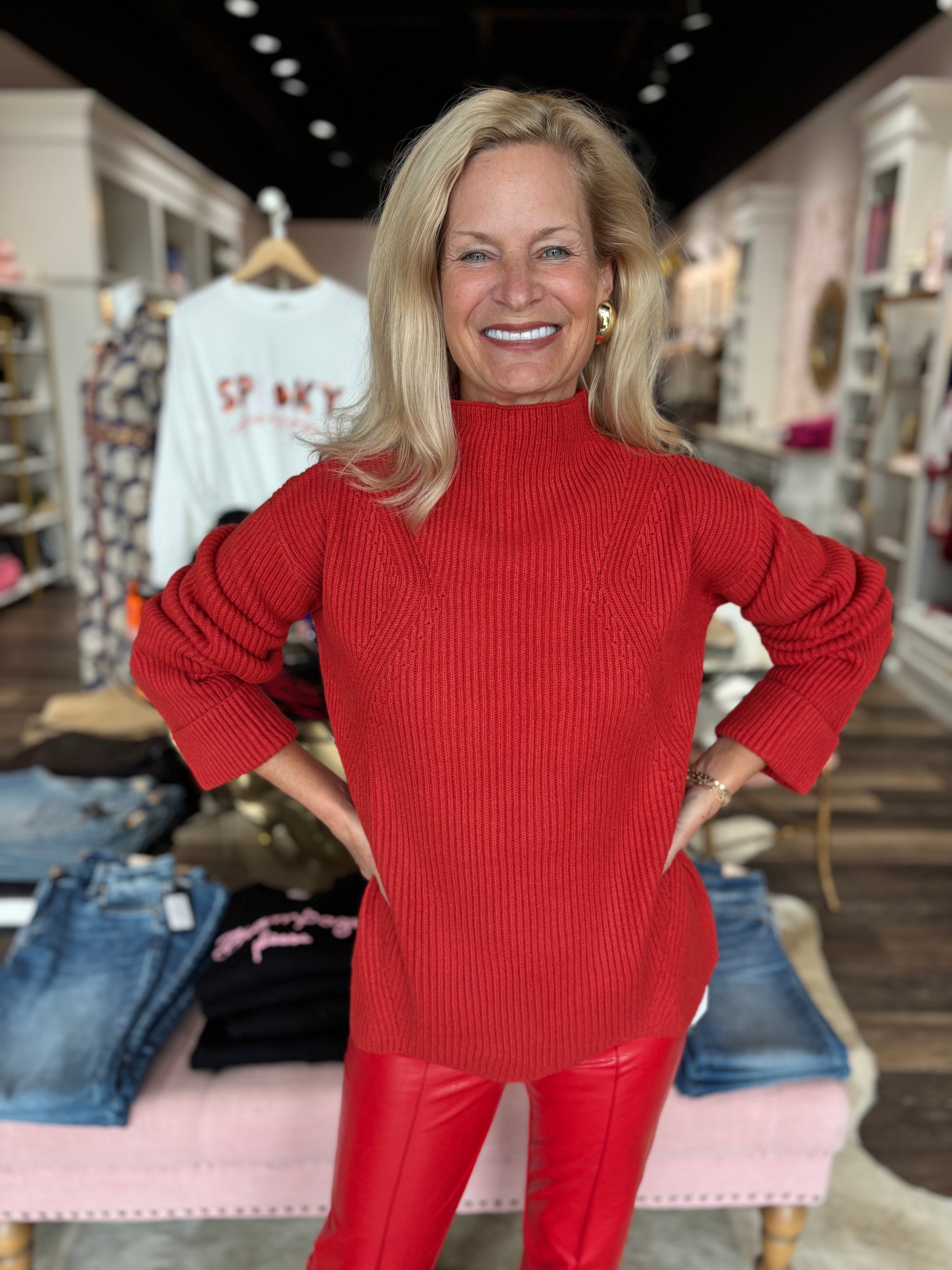 The Hyacinth Cozy Rib Scallop Edge Pullover is a fully fashioned sweater with a funnel neck, drop shoulders, cuffs, relaxed fit and scalloped hemline. Partner this cozy sweater with the Hi Waist Vegan Leather Wide leg and ankle boots. Store folded, never hung.