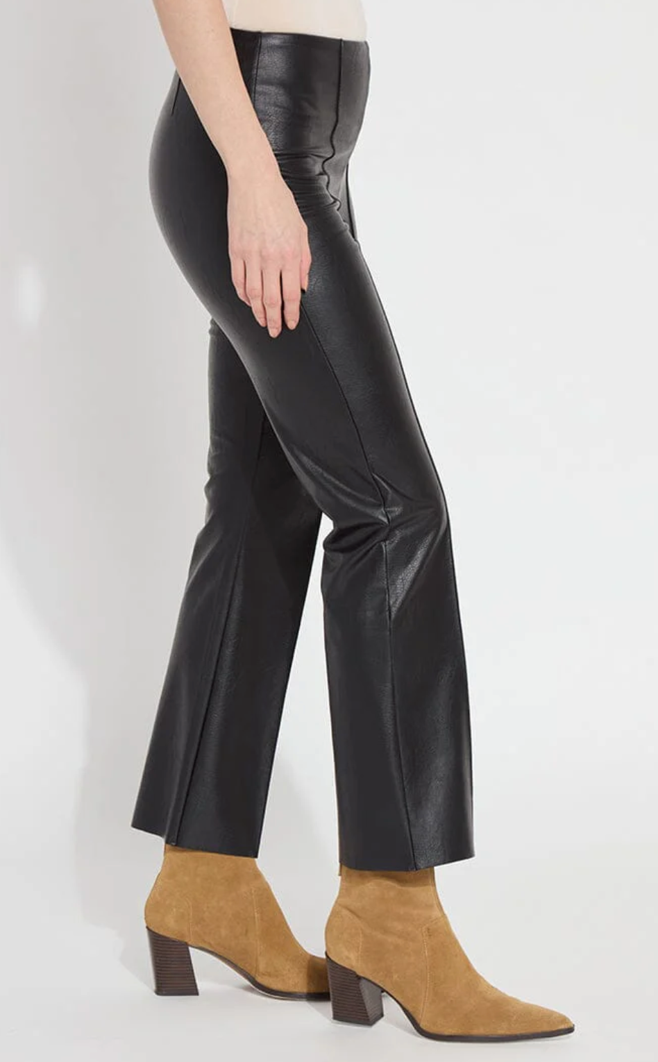 The Ankle Elysse Vegan Leather pants are a stylish and comfortable choice for petite women seeking a flattering fit-and-flare silhouette. Crafted from 4-way stretch textured vegan leather, they offer both flexibility and a sleek appearance, making them suitable for various occasions. The concealed patented waistband and front pintucks enhance the tailored look, ensuring a polished finish.