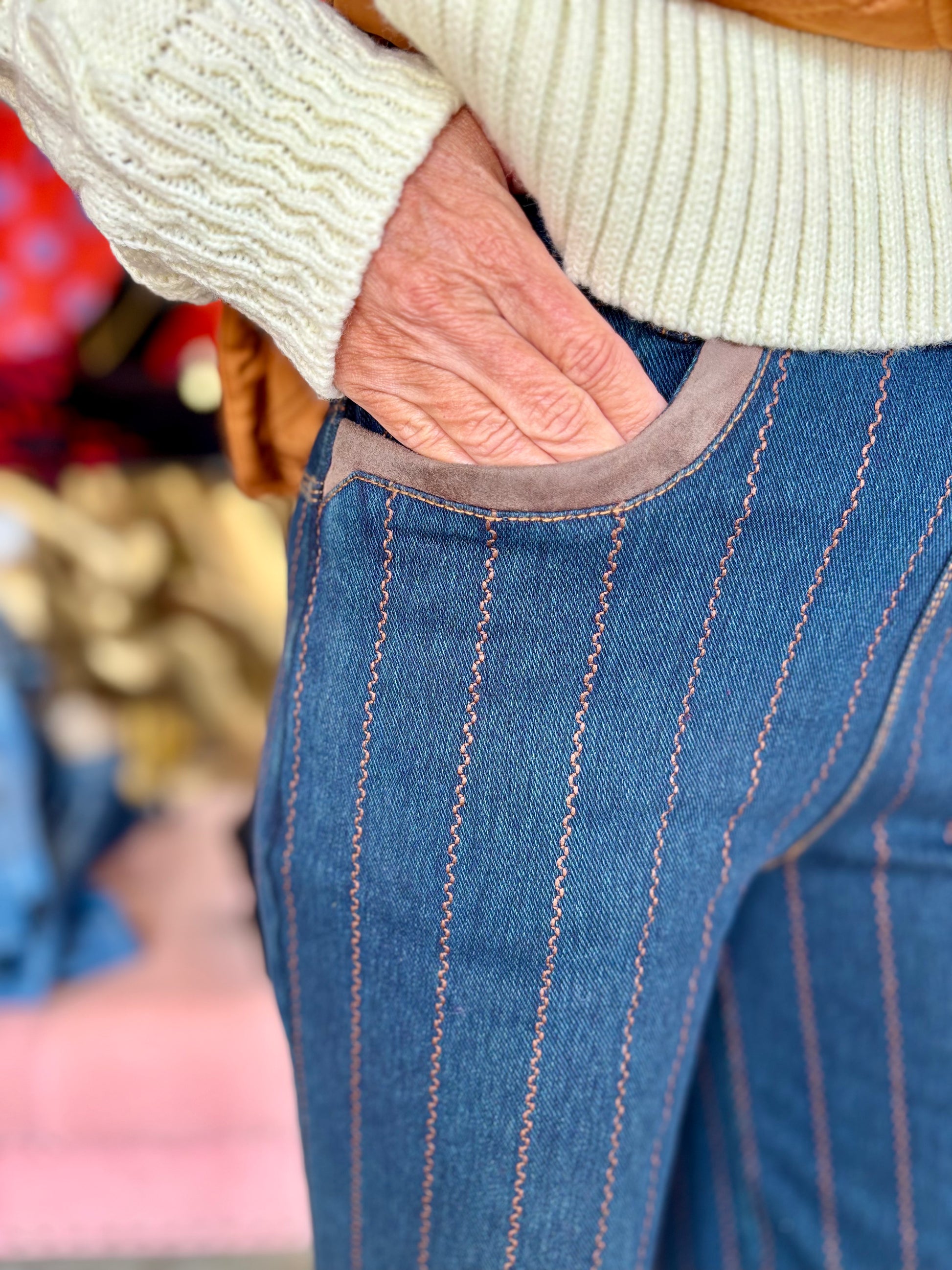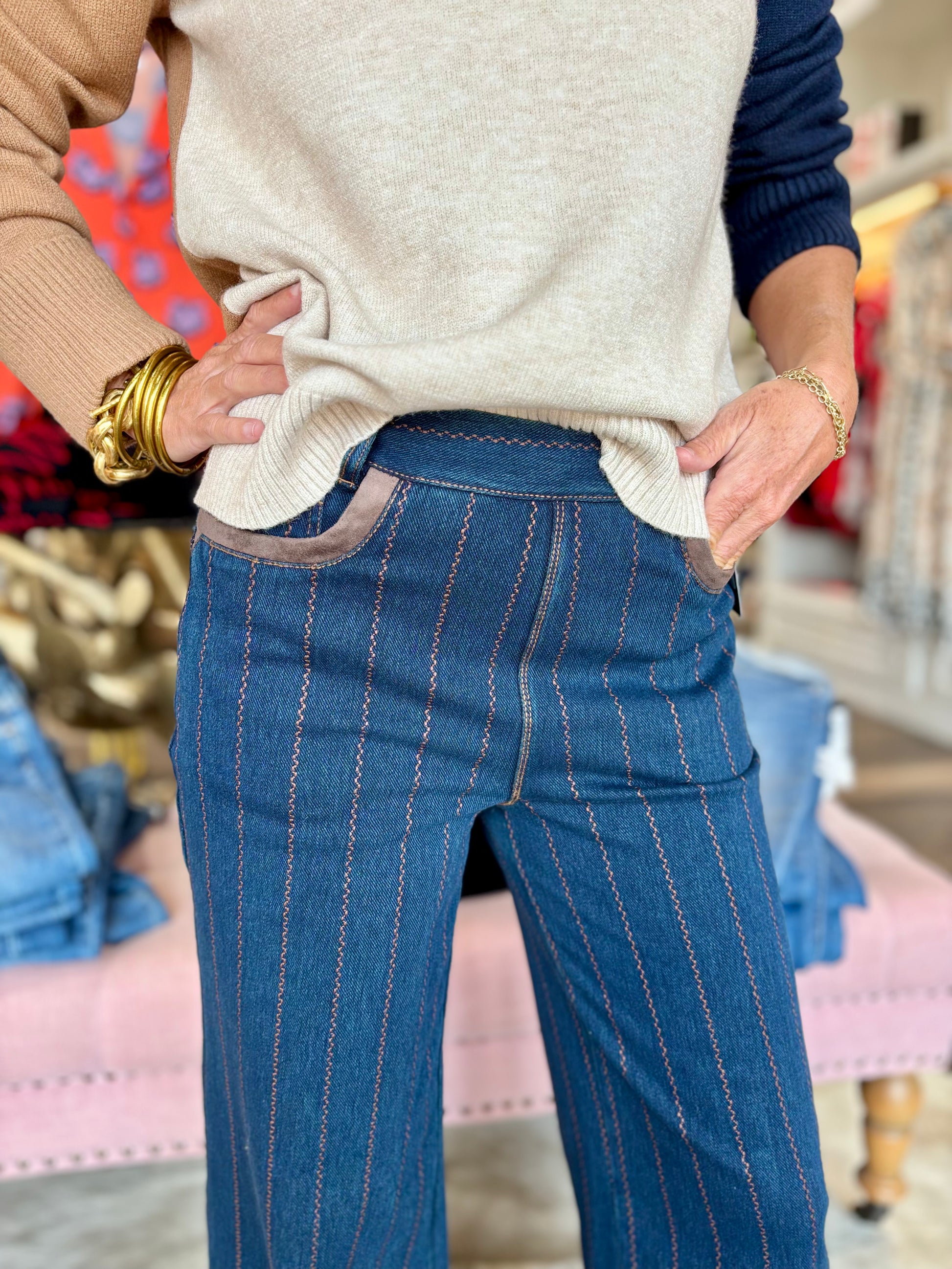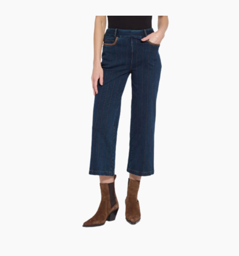 Tailored with a modern edge, the Lyssé Landon Embroidered Wide Leg Denim offers a fresh twist on classic jeans. Designed in a rich dark wash with vertical pinstripe-style embroidery that elongates the legs, these cropped wide-leg trousers combine comfort with a touch of sophistication. Faux leather trim at the waist and pocket adds a refined accent. Crafted in Lyssé’s signature stretch denim for a flattering fit and all-day ease. Pair with ankle boots or flats for elevated everyday style.