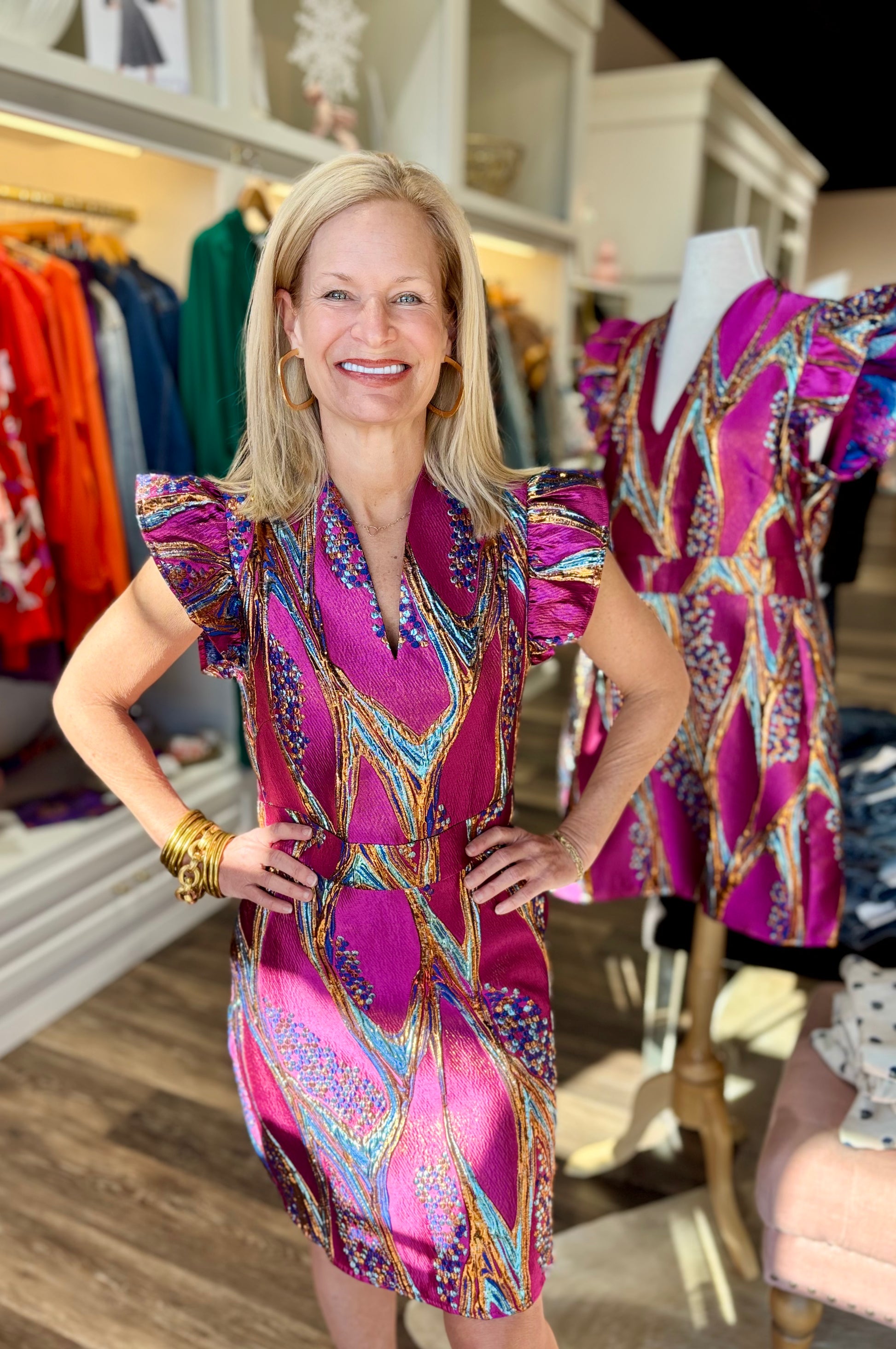 Bold color meets effortless charm in this eye-catching magenta dress from THML. Designed with soft flutter sleeves and an allover pattern, this dress offers an easy, flattering silhouette that feels just as good as it looks. Lightweight and comfortable, it’s perfect for warm days while still polished enough for special occasions.