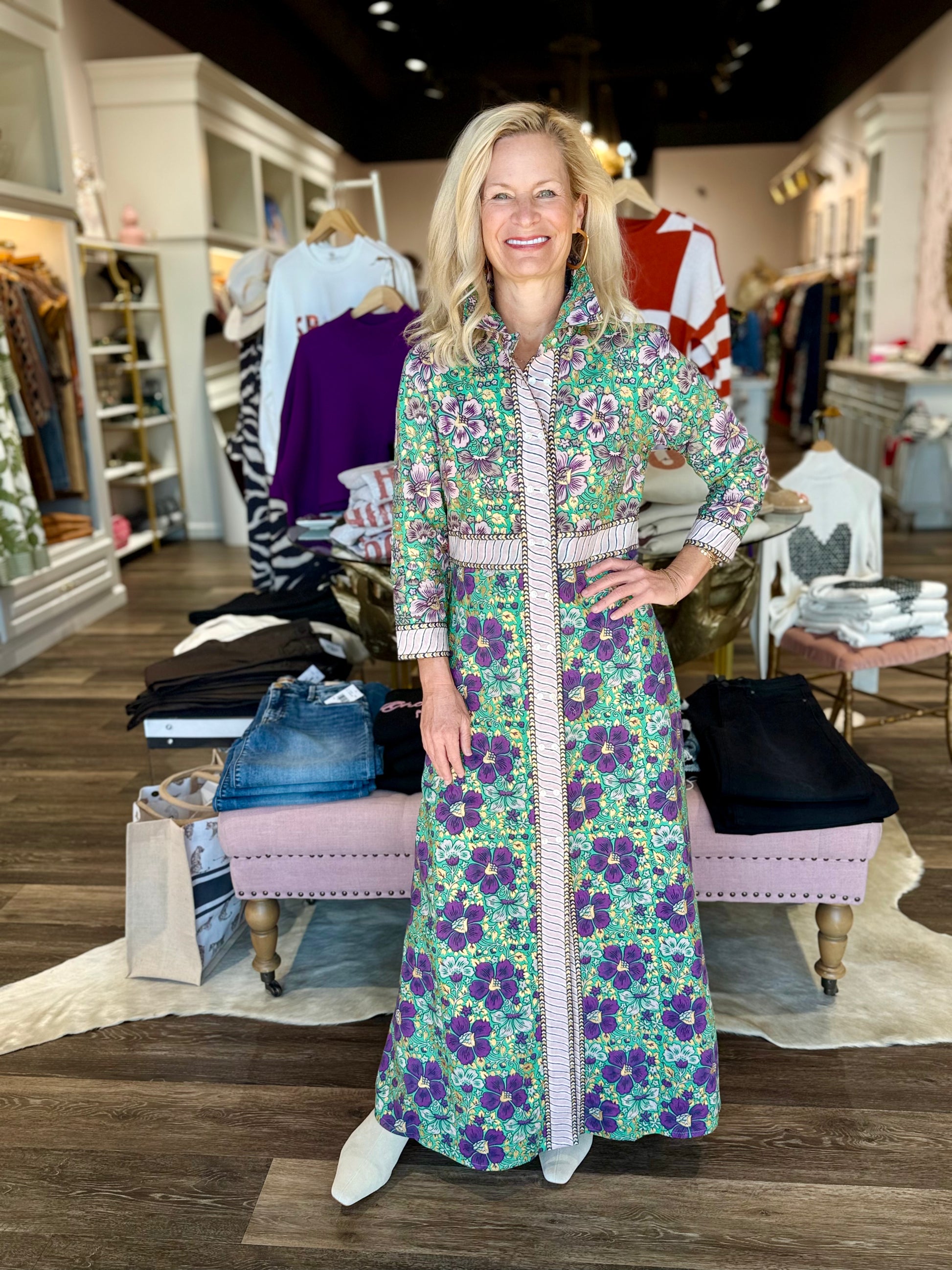 Sophisticated and versatile, the Agra Navy Shirt Dress Maxi from Oliphant is a timeless wardrobe staple with a modern twist. Featuring a full-length button-down silhouette, this dress flows effortlessly while the detachable belt cinches the waist for a flattering fit. The rich Agra Navy print brings depth and elegance, making it a go-to piece for daytime outings, travel, or elevated evening style.