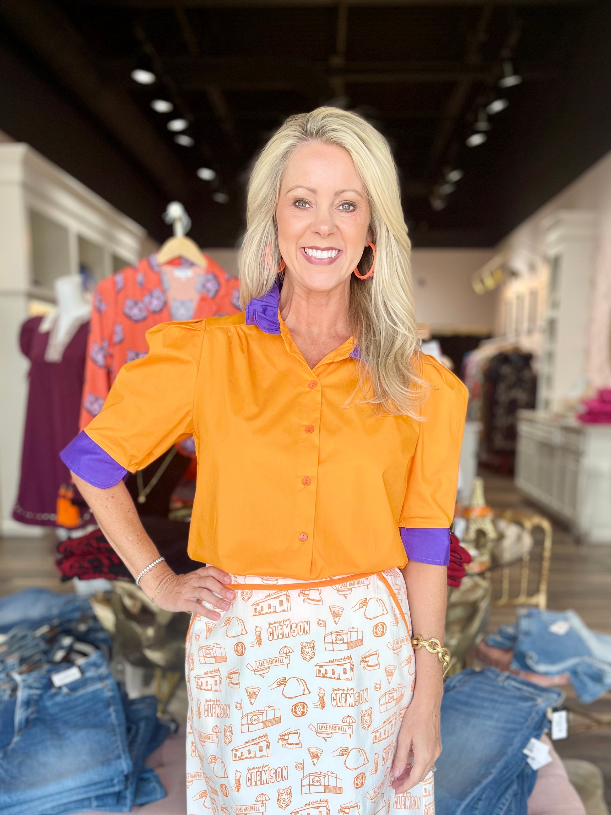 Cheer in style with this vibrant orange button-up shirt, finished with a playful purple ruffle collar that’s perfect for game day spirit. Crafted from 97% cotton and 3% spandex, it offers breathable comfort with just the right touch of stretch for an easy, flattering fit. Dress it up with denim or keep it casual for tailgates and beyond.