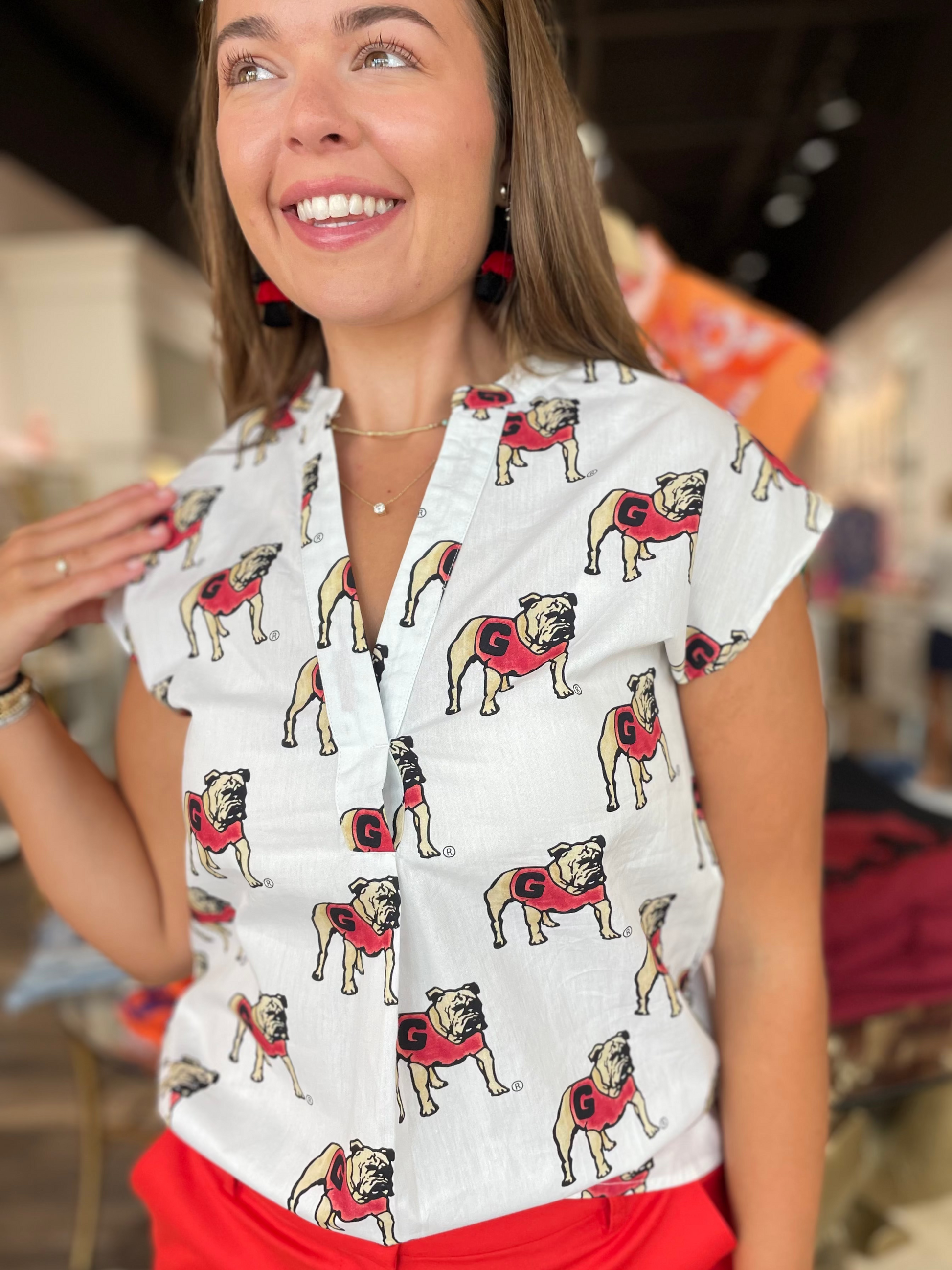 The Poplin V-Neck is crafted from cotton poplin with a V-neck and capped sleeves. The all-over repeating pattern is a winner! You will be ready to cheer on your team in the Poplin V-Neck!