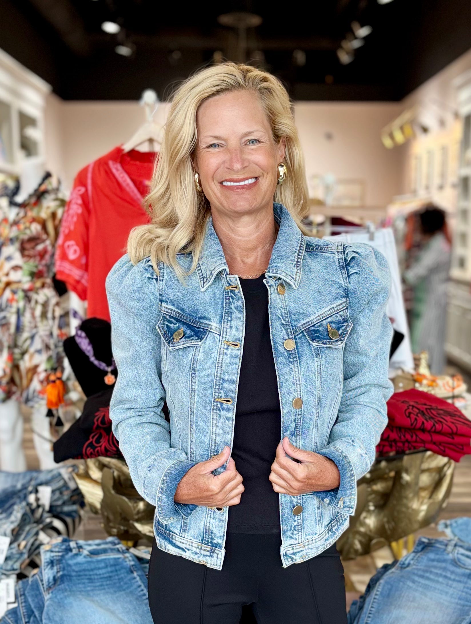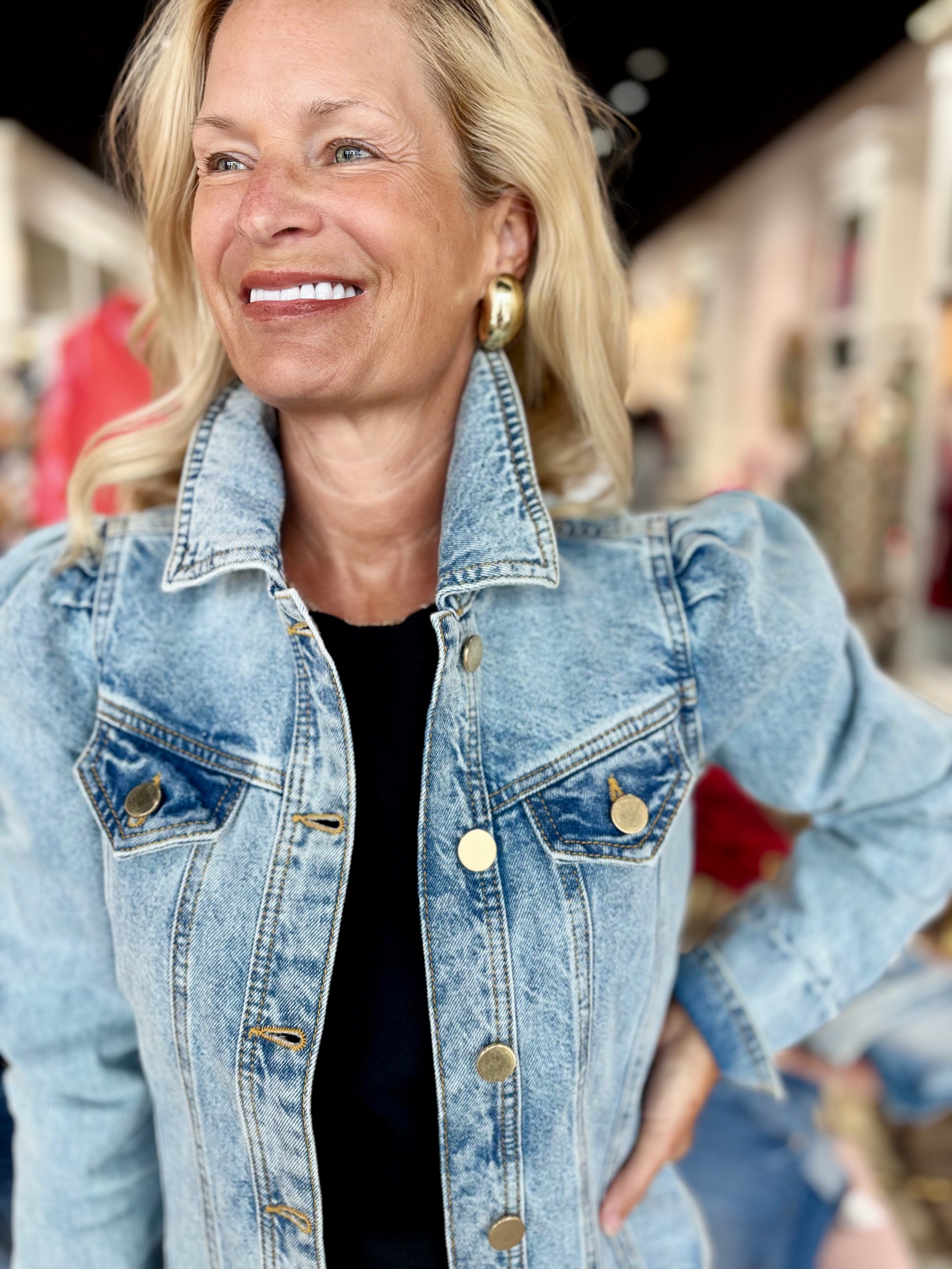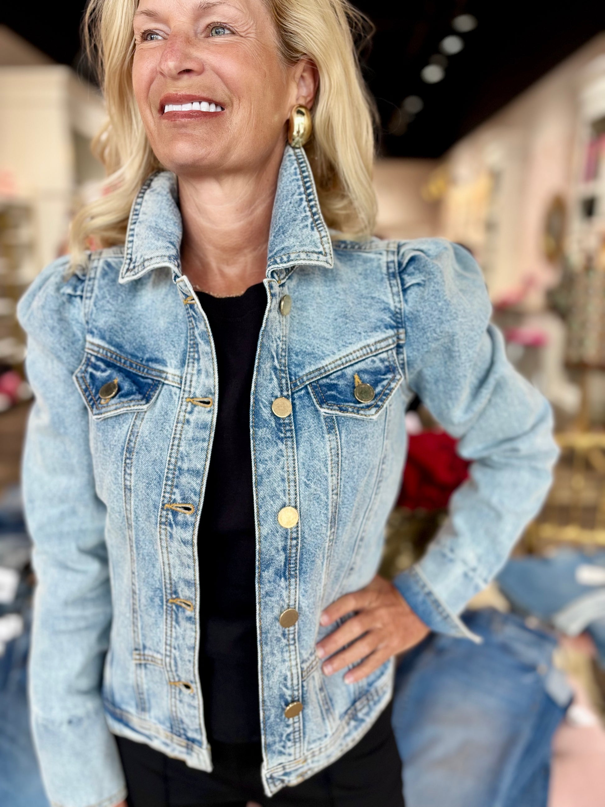 This Puff Sleeve Denim Jacket gives a fresh twist to a classic favorite, featuring puff sleeves for a feminine touch. Versatile and stylish, it pairs effortlessly with dresses, skirts, or your go-to jeans for a modern, laid-back look.