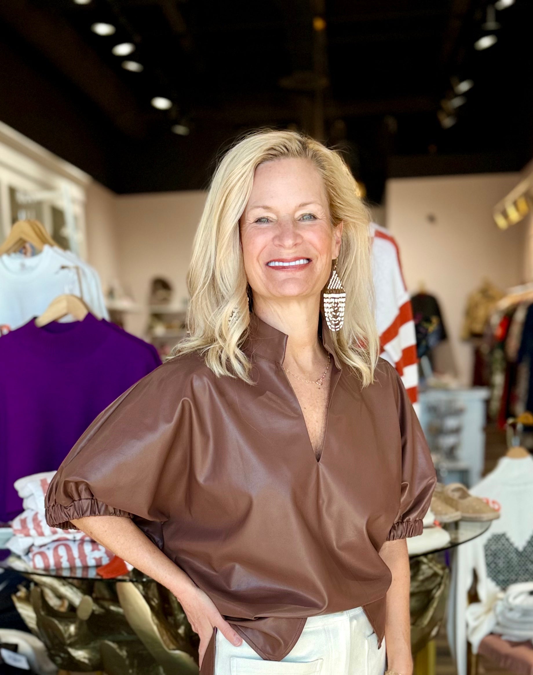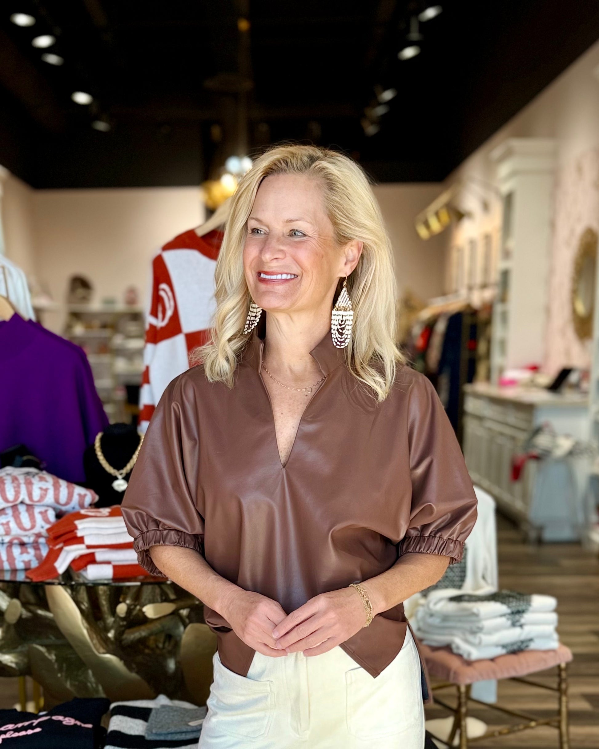 Puff Sleeve Faux Leather Top Brown