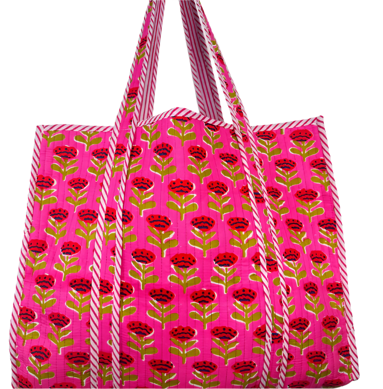Hot Pink and Red Floral Print Oversized Quilted Tote Bag: - Reversible tote with contrasting interior - Interior pocket - 17.5" x 17.5" - 100% Cotton - Quilted block print fabric Perfect for: market tote, beach tote bag, weekender bag, overnight bag, large shopping tote, travel bag & more!