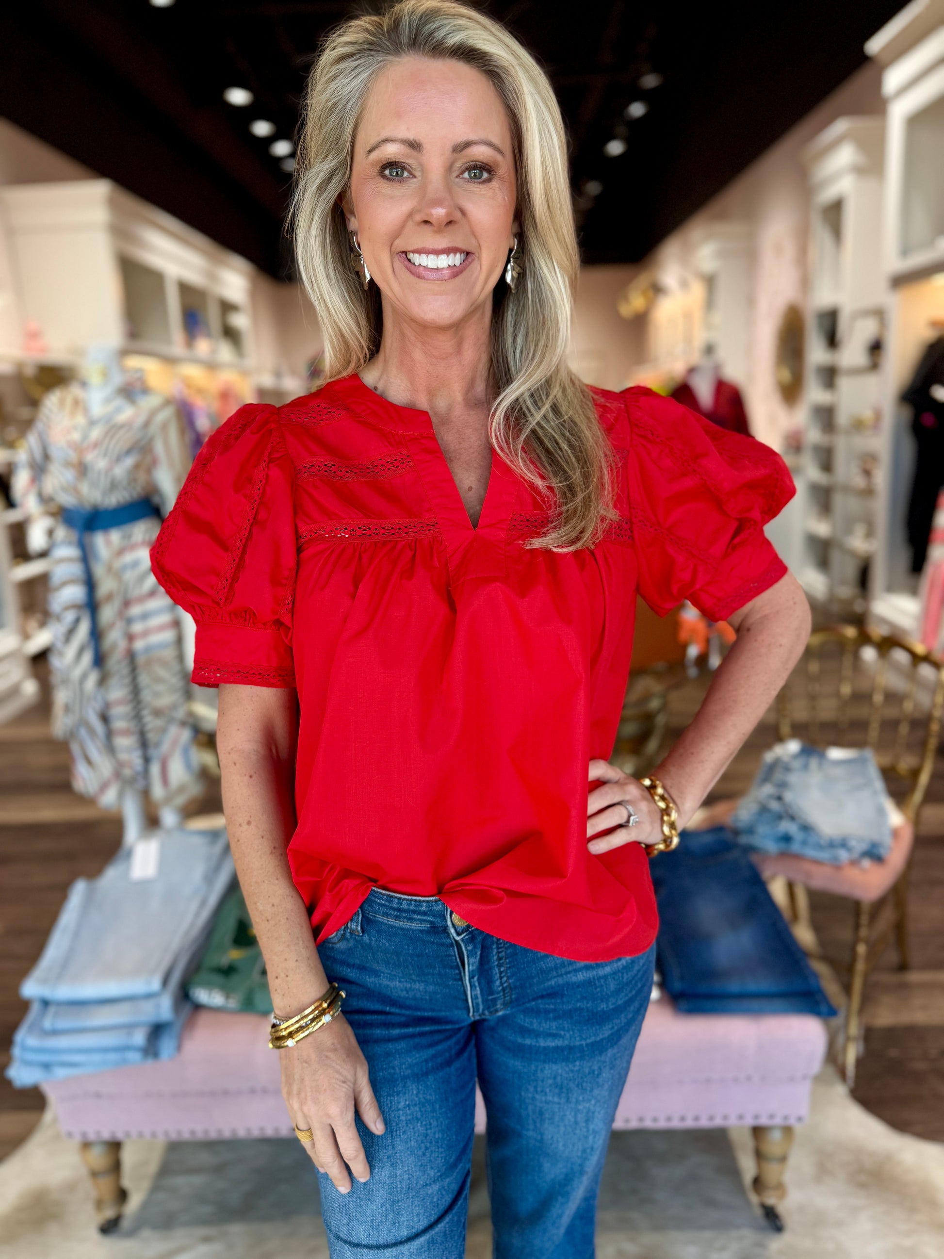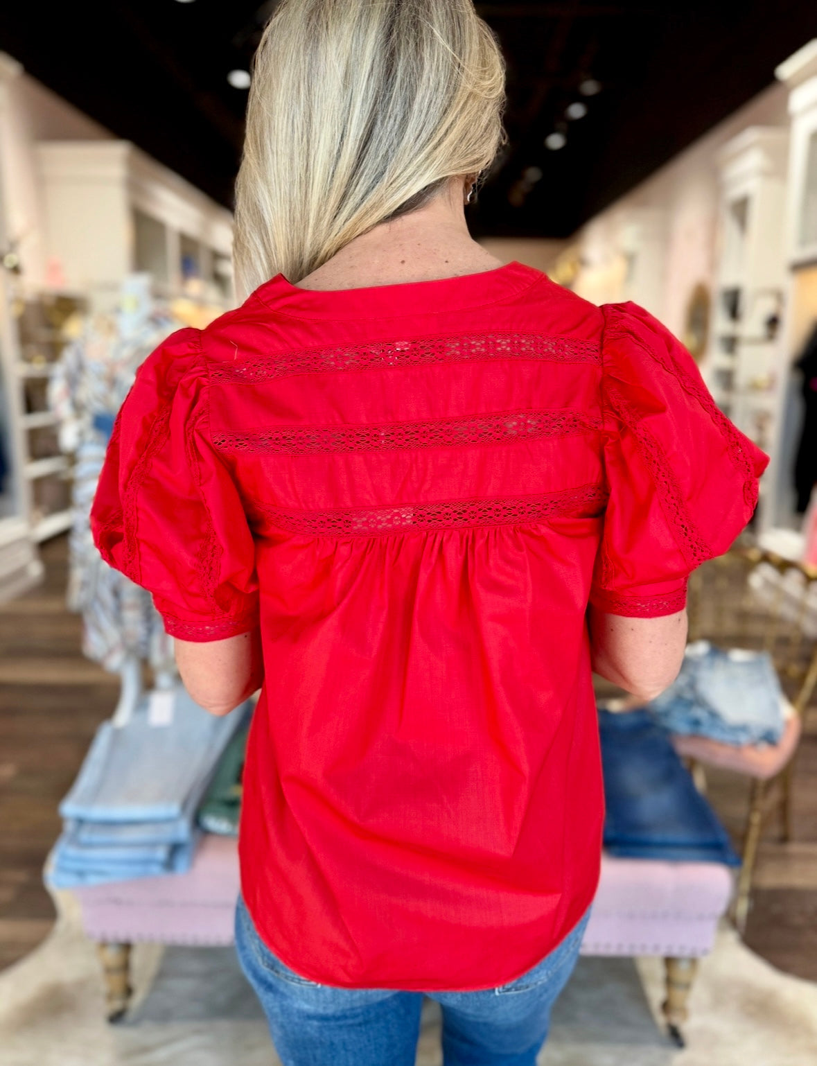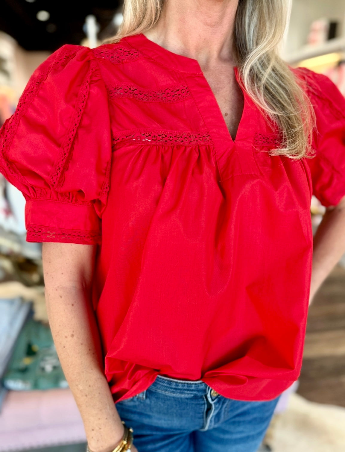 Solid V-neck cuff band short puff sleeve pullover top featuring lace inset.