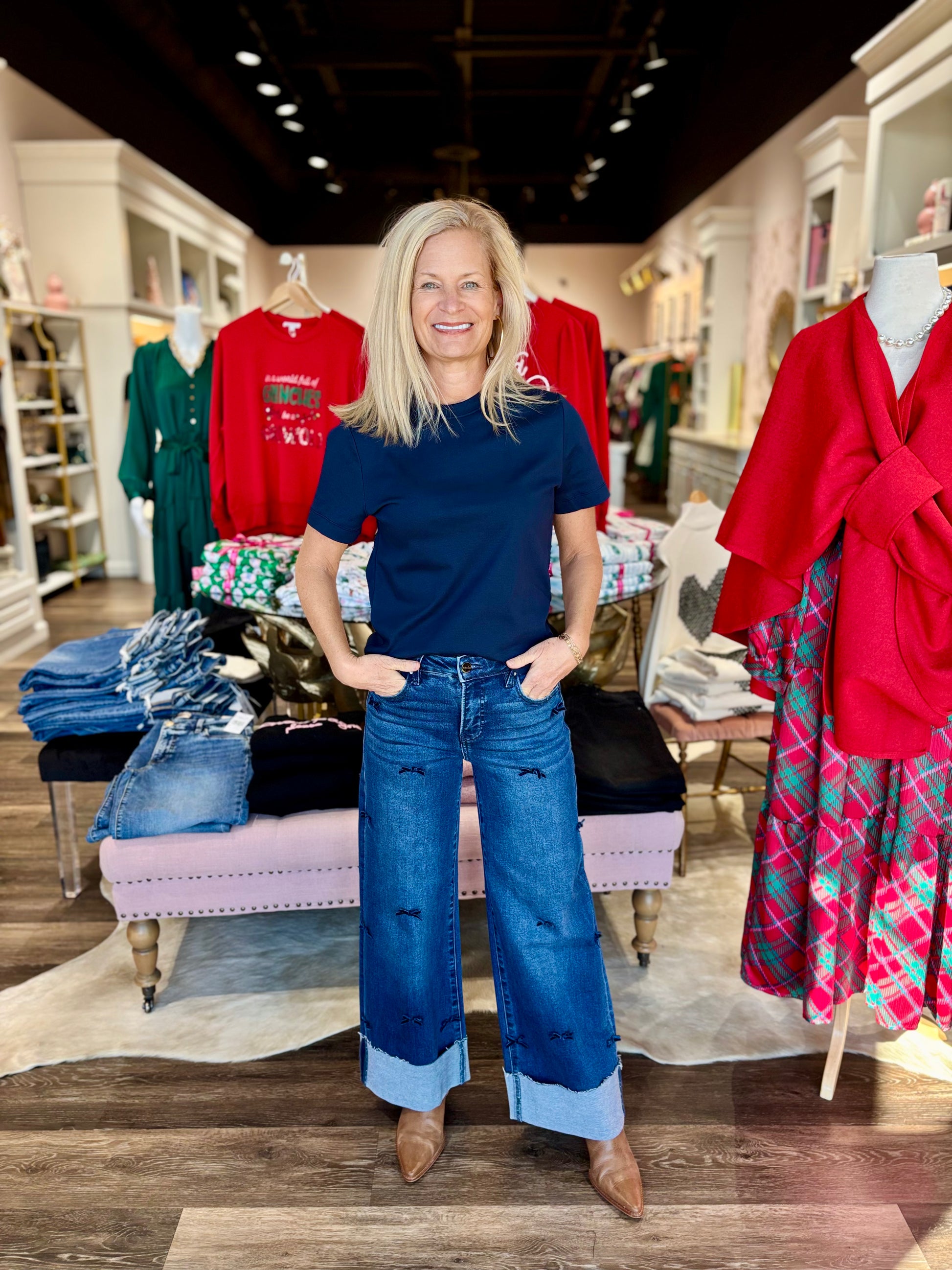 The high rise crop wide leg ribbon detail jeans are a stylish and unique choice for your denim collection. The high rise fit offers a flattering silhouette and on-trend look. The wide leg design adds a relaxed and fashion-forward vibe to the jeans. The ribbon detailing on the sides adds a fun and feminine touch. Pair these jeans with a tucked-in blouse or crop top to showcase the ribbon detail and create a chic and trendy outfit.