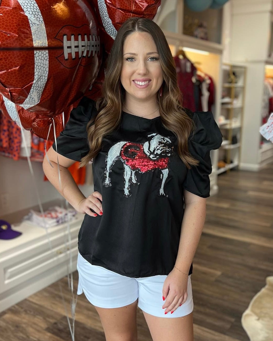 The Sequin Puff Sleeve Shirt combines your favorite team’s logo in sequins with irresistible puff sleeves. The silhouette is flattering and can easily be dressed up or down. Pair with black pants for work on Friday or jean shorts for the game on Saturday!