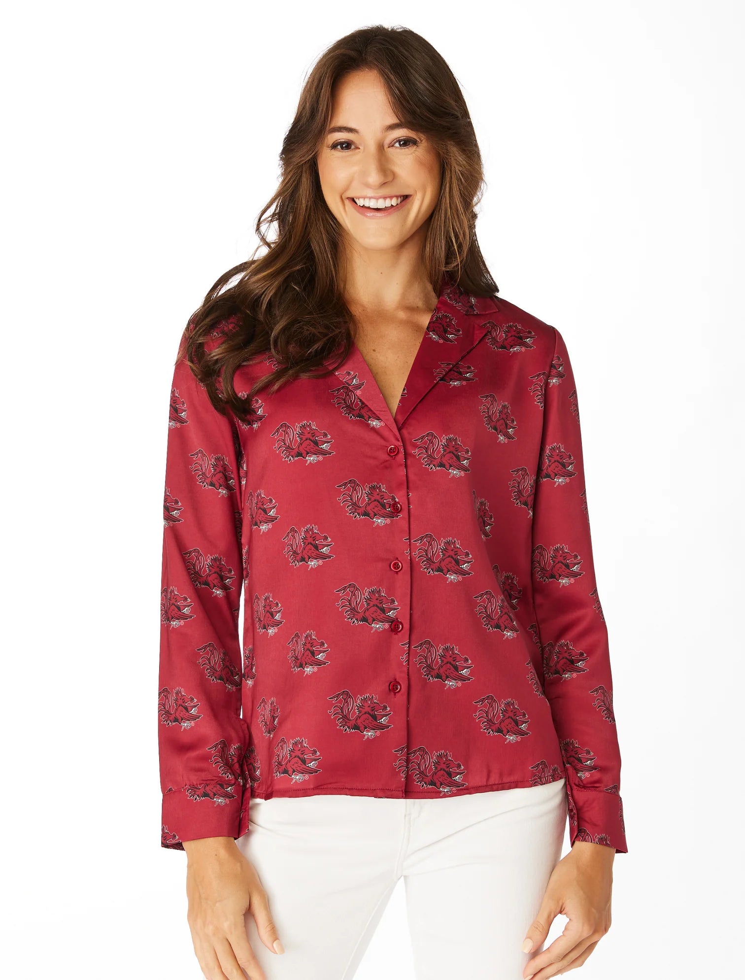 The Button-Up Long Sleeve features an all-over repeating design for your favorite school. This shirt has so many possibilities and can be worn open over a tank with our Poly Shorts, buttoned up and tucked into our Tiered Skort, or tied at the waist with shorts or jeans.